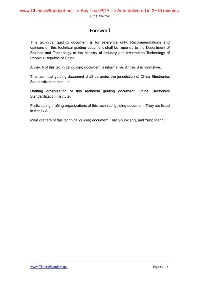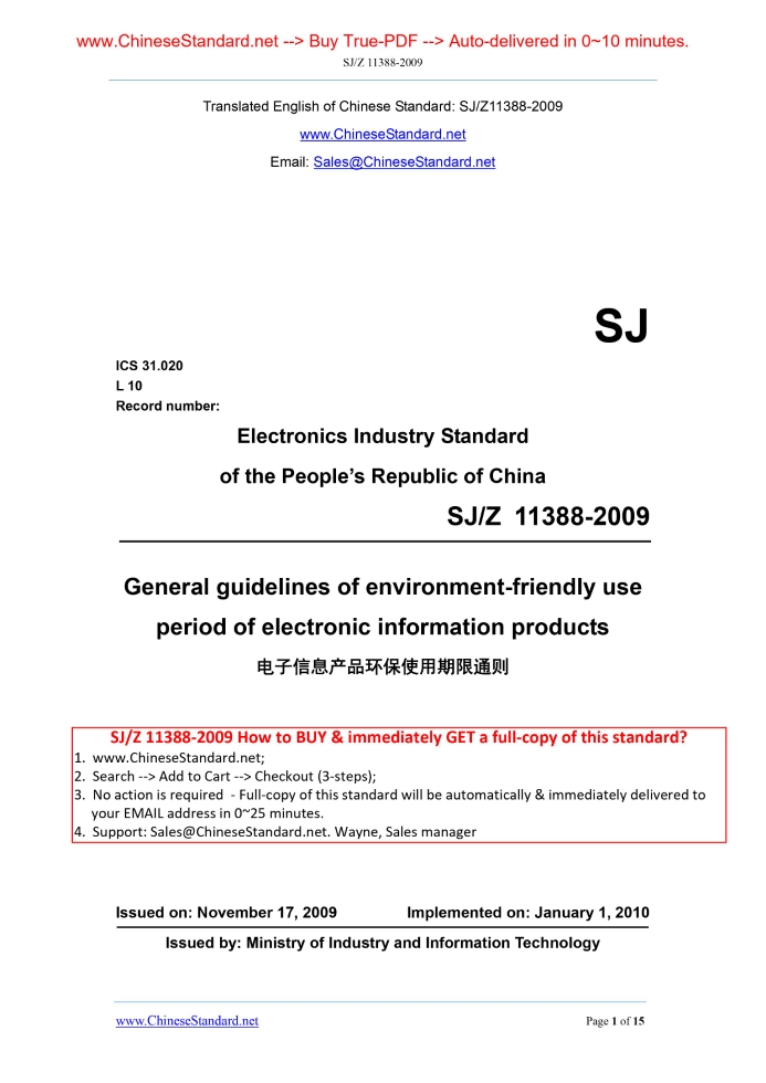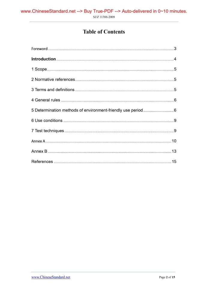 Similar standardsSJ/Z 11388-2009: General guidelines of environment-friendly use period of electronic information products---This is an excerpt. Full copy of true-PDF in English version (including equations, symbols, images, flow-chart, tables, and figures etc.), auto-downloaded/delivered in 9 seconds, can be purchased online: https://www.ChineseStandard.net/PDF.aspx/SJZ11388-2009 SJ ICS 31.020 L 10 Record number. Electronics Industry Standard of the People’s Republic of China General guidelines of environment-friendly use period of electronic information products Issued on. NOVEMBER 17, 2009 Implemented on. JANUARY 1, 2010 Issued by. Ministry of Industry and Information Technology Table of ContentsForeword... 3 Introduction... 4 1 Scope... 5 2 Normative references... 5 3 Terms and definitions... 5 4 General rules... 6 5 Determination methods of environment-friendly use period... 6 6 Use conditions... 9 7 Test techniques... 9 Annex A... 10 Annex B... 13 References... 15ForewordThis technical guiding document is for reference only. Recommendations and opinions on this technical guiding document shall be reported to the Department of Science and Technology of the Ministry of Industry and Information Technology of People's Republic of China. Annex A of this technical guiding document is informative. Annex B is normative. This technical guiding document shall be under the jurisdiction of China Electronics Standardization Institute. Drafting organization of this technical guiding document. China Electronics Standardization Institute. Participating drafting organizations of this technical guiding document. They are listed in Annex A. Main drafters of this technical guiding document. Han Shuoxiang, and Yang Meng.1 ScopeThis technical guiding document provides the general guidelines of determining the environment-friendly use period of electronic information products that contain toxic and hazardous substances or elements. The content of this technical guiding document applies to the electronic information products within the adjustment range of "Pollution Control and Management Methods of Electronic Information Products", and in which the content of toxic and hazardous substances or elements exceeds the limit requirements specified in SJ/T 11363-2006.2 Normative referencesThe provisions in following documents become the provisions of this guiding document through the reference in this guiding document. For dated references, the subsequent amendments (excluding corrections) or revisions do not apply to this Standard, however, parties who reach an agreement based on this guiding document are encouraged to study if the latest versions of these documents are applicable. For undated references, the latest edition of the referenced document applies. SJ/T 11364 Marking for control of pollution caused by electronic information products3 Terms and definitionsThe terms and definitions defied in SJ/T 11364 AND the following terms and definitions apply to this technical guiding document. 3.1 technical environment-friendly use period The environment-friendly use period determined by practice OR scientific methods and testing techniques. 3.2 notional environment-friendly use period The environment-friendly use period determined by the method of combining with other use period concepts of the products. 3.3 techno-life The expected average product lifespan determined according to the design.4 General rules4.1 Numerical range The electronic information products of which the environment-friendly use period is less than or equal to 10a [Noted by Translator. 10a = 10 years. See SJ/T 11364], should select an integer between 1 and 10 as the product’s environment-friendly use period. The electronic information products of which the environment-friendly use period is greater than 10a, should select an integer multiple of 5 as the product’s environment-friendly use period. When the environment-friendly use period of electronic information products is not an integer multiple of 5, it should select a similar and smaller integer multiple of 5 as the product’s environment-friendly use period. 4.2 Method selection process The manufacturer or importer of electronic information products should select an appropriate method to determine the product's environment-friendly use period according to the order shown in Figure 1.According to the method selection process diagram, enterprises shall in-priority consider to use practice method and test method to determine the technical environment-friendly use period of the products. If the technical methods are not applicable, then it can choose one of the four kinds of determination methods of notional environment-friendly use period, regardless of the order, to determine the environment-friendly use period of the products.5 Determination methods of environment‐friendly use periodFigure 1 Method selection process diagram of environment-friendly use period of electronic information products 5.1 Technical environment-friendly use period method 5.1.1 General rules When the manufacturer or importer of electronic information products has enough practice experience or scientific test technical means, it should select the technical environment-friendly use period as the environment-friendly use period of the Electronic information products ofwhich the environment-friendly useperiod is to be determinedIs there a practice experience. 5.1.2 Practice method Electronic information products under normal use conditions, if the toxic and hazardous substances or elements in products occur the cases of leaking or mutation for 5 set · times or more, the rounded shortest age limit of the occurrence of cases is determined as the technical environment-friendly use period of the products. 5.1.3 Test method When electronic information products occur no the cases of leaking or mutation of toxic or hazardous substances or elements under normal use conditions, the technical environment-friendly use pe