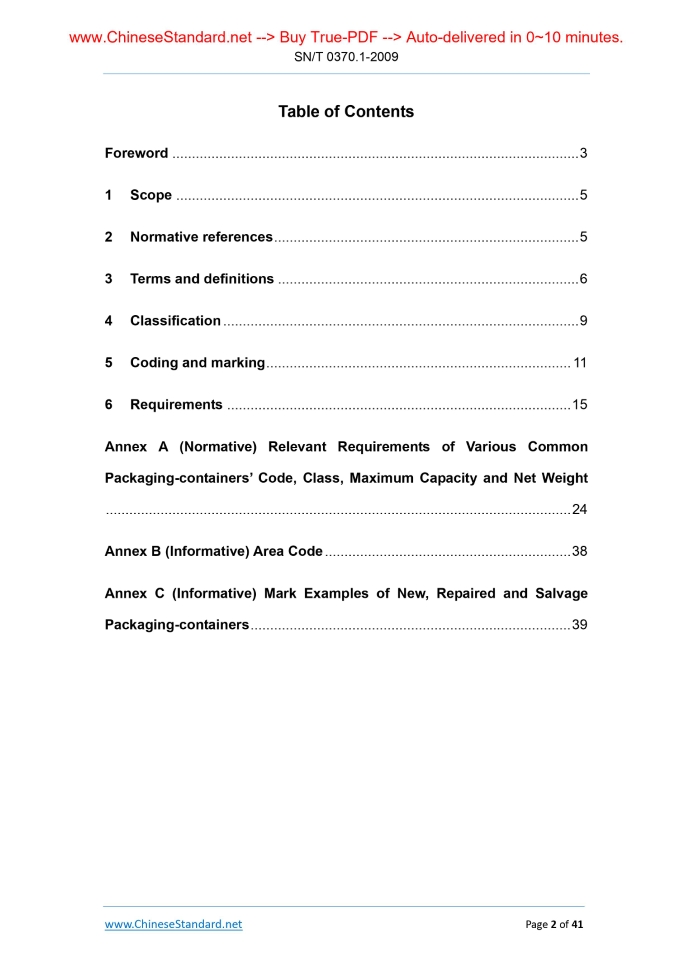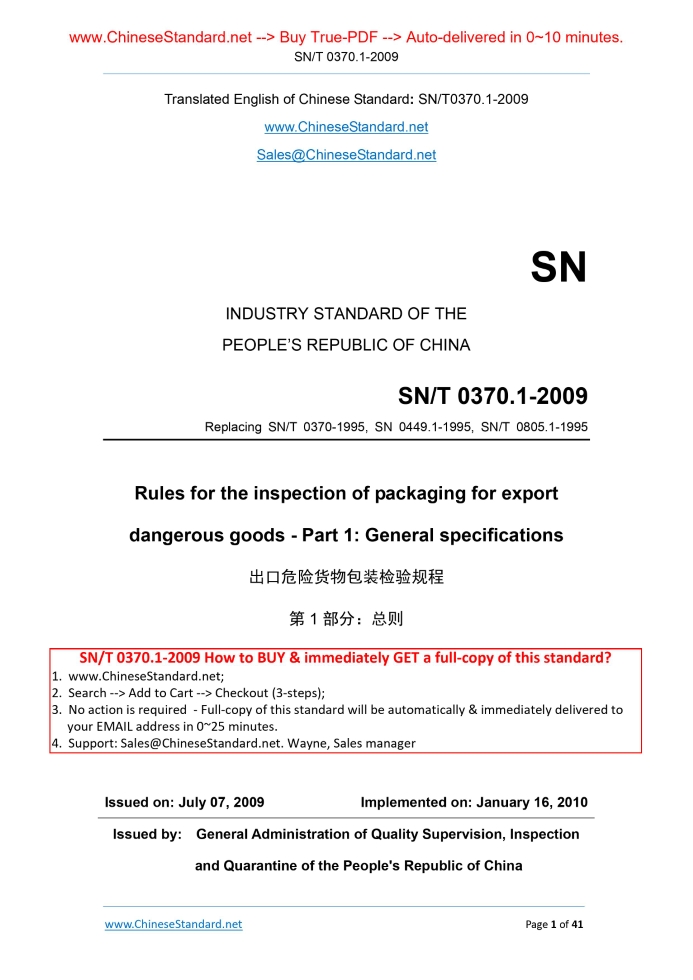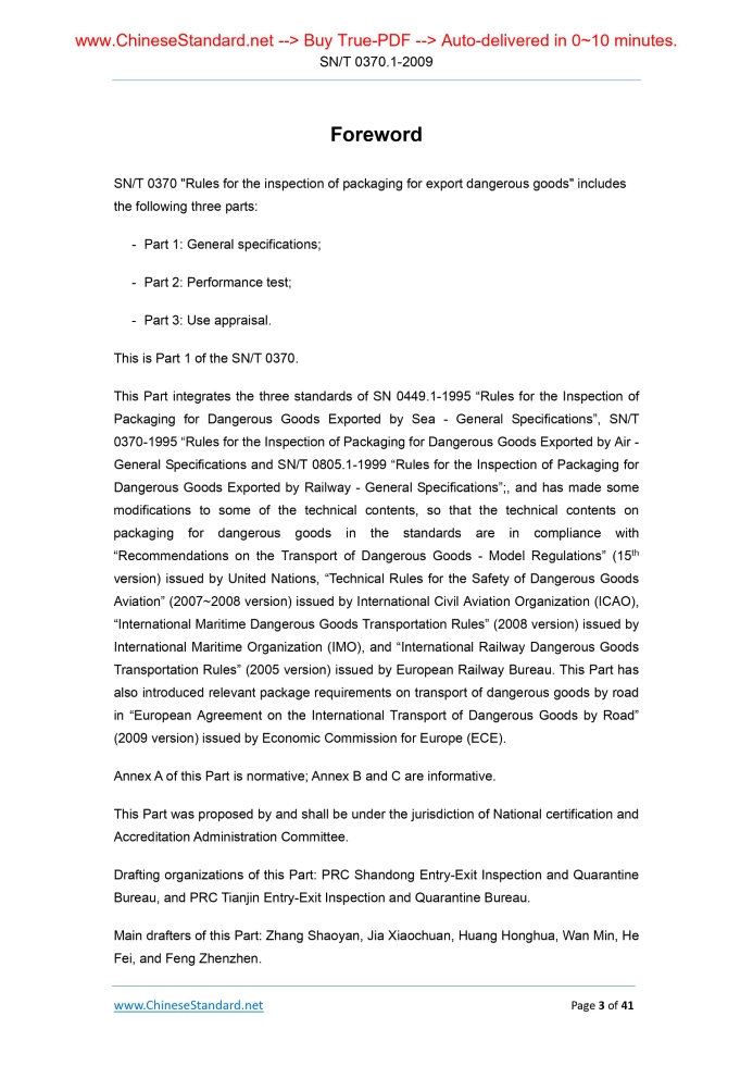 Similar standardsSN/T 0370.1-2009: Rules for the inspection of packaging for export dangerous goods - Part 1: General specifications---This is an excerpt. Full copy of true-PDF in English version (including equations, symbols, images, flow-chart, tables, and figures etc.), auto-downloaded/delivered in 9 seconds, can be purchased online: https://www.ChineseStandard.net/PDF.aspx/SNT0370.1-2009 SN INDUSTRY STANDARD OF THE PEOPLE’S REPUBLIC OF CHINA Replacing SN/T 0370-1995, SN 0449.1-1995, SN/T 0805.1-1995 Rules for the inspection of packaging for export dangerous goods - Part 1.General specifications Issued on: JULY 07, 2009 Implemented on: JANUARY 16, 2010 Issued by. General Administration of Quality Supervision, Inspection and Quarantine of the People's Republic of China Table of ContentsForeword... 3 1 Scope... 5 2 Normative references... 5 3 Terms and definitions... 6 4 Classification... 9 5 Coding and marking... 11 6 Requirements... 15 Annex A (Normative) Relevant Requirements of Various Common Packaging-containers’ Code, Class, Maximum Capacity and Net Weight ... 24 Annex B (Informative) Area Code... 38 Annex C (Informative) Mark Examples of New, Repaired and Salvage Packaging-containers... 39ForewordSN/T 0370 "Rules for the inspection of packaging for export dangerous goods" includes the following three parts. - Part 1.General specifications; - Part 2.Performance test; - Part 3.Use appraisal. This is Part 1 of the SN/T 0370. This Part integrates the three standards of SN 0449.1-1995 “Rules for the Inspection of Packaging for Dangerous Goods Exported by Sea - General Specifications”, SN/T 0370-1995 “Rules for the Inspection of Packaging for Dangerous Goods Exported by Air - General Specifications and SN/T 0805.1-1999 “Rules for the Inspection of Packaging for Dangerous Goods Exported by Railway - General Specifications”;, and has made some modifications to some of the technical contents, so that the technical contents on packaging for dangerous goods in the standards are in compliance with “Recommendations on the Transport of Dangerous Goods - Model Regulations” (15th version) issued by United Nations, “Technical Rules for the Safety of Dangerous Goods Aviation” (2007~2008 version) issued by International Civil Aviation Organization (ICAO), “International Maritime Dangerous Goods Transportation Rules” (2008 version) issued by International Maritime Organization (IMO), and “International Railway Dangerous Goods Transportation Rules” (2005 version) issued by European Railway Bureau. This Part has also introduced relevant package requirements on transport of dangerous goods by road in “European Agreement on the International Transport of Dangerous Goods by Road” (2009 version) issued by Economic Commission for Europe (ECE). Annex A of this Part is normative; Annex B and C are informative. This Part was proposed by and shall be under the jurisdiction of National certification and Accreditation Administration Committee. Drafting organizations of this Part. PRC Shandong Entry-Exit Inspection and Quarantine Bureau, and PRC Tianjin Entry-Exit Inspection and Quarantine Bureau. Main drafters of this Part. Zhang Shaoyan, Jia Xiaochuan, Huang Honghua, Wan Min, He Fei, and Feng Zhenzhen. The historical versions replaced by this Part are as follows. - SN/T 0370-1995; - SN 0449.1-1995; - SN/T 0805.1-1999. Rules for the Inspection of Packaging for Export Dangerous Goods - Part 1.General Specifications1 ScopeThis Part of SN/T 0370 specifies the classes, codes, markings and requirements of export packaging of dangerous goods. This Part is applicable to export packaging of dangerous goods with holding capacity not exceeding 450L and net weight not exceeding 400KG. This Part is not applicable to packaging of gas sprayer, gas container, radioactive material, and infectious substance with maximum working pressure greater than or equal to 100kPa, inner diameter greater than 0.15m, and volume greater than or equal to 0.025m3.2 Normative referencesThe articles contained in the following documents have become part of this Part of SN/T 0370 when they are quoted herein. For the dated documents so quoted, all the modifications (excluding corrections) or revisions made thereafter shall not be applicable to this Part. For the undated documents so quoted, the latest editions shall be applicable to this Part. GB/T 1540 Paper and board - Determination of water absorption - Cobb method GB/T 22410 Packaging - Transport packaging for dangerous goods - Plastics compatibility testing SN/T 0370.2 Rules for the inspection of packaging for export dangerous goods - Part 2.Performance test SN/T 0370.3 Rules for the inspection of packaging for export dangerous goods - Part3.Use appraisal Recommendations on Transportation of Dangerous Goods - Model Regulations (United Nation, Edition 15) storage, transport, and unloading. 3.15 Over pack In order to be convenient for loading, unloading and storage during transportation, one or more packages are packed together to form a packing of a single unit. 3.16 Salvage packaging It is a kind of special packaging-container used for recycling or handling dangerous goods package with damage, defect, and leakage or not in compliance with provisions, or overflowed or leaked dangerous goods. 3.17 Closure It is a kind of device used for sealing the opening of receptacle. 3.18 Sift proof packaging It is a kind of packaging-container to prevent dry substances from outward leakage, including fine solids caused in transportation. 3.19 Securely closed It is a kind of sealing which can prevent dry substances from leaking in normal handling. It is the minimum requirement to any sealing. 3.20 Water-tight It is also called effective sealing, which refers to liquid-tight sealing. 3.21 Hermetically sealed It refers to steam-tight sealing. 3.22 UN number It refers to 4 Arabic numbers worked out by Committee of Experts on the Transport of Dangerous Goods in the United Nations,