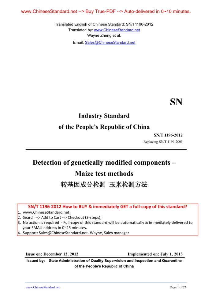 SN/T 1196-2012: Detection of genetically modified components - Maize test methods Delivery: 9 seconds. True-PDF full-copy in English & invoice will be downloaded + auto-delivered via email. See step-by-step procedure Status: Obsolete SN/T 1196: Historical versions