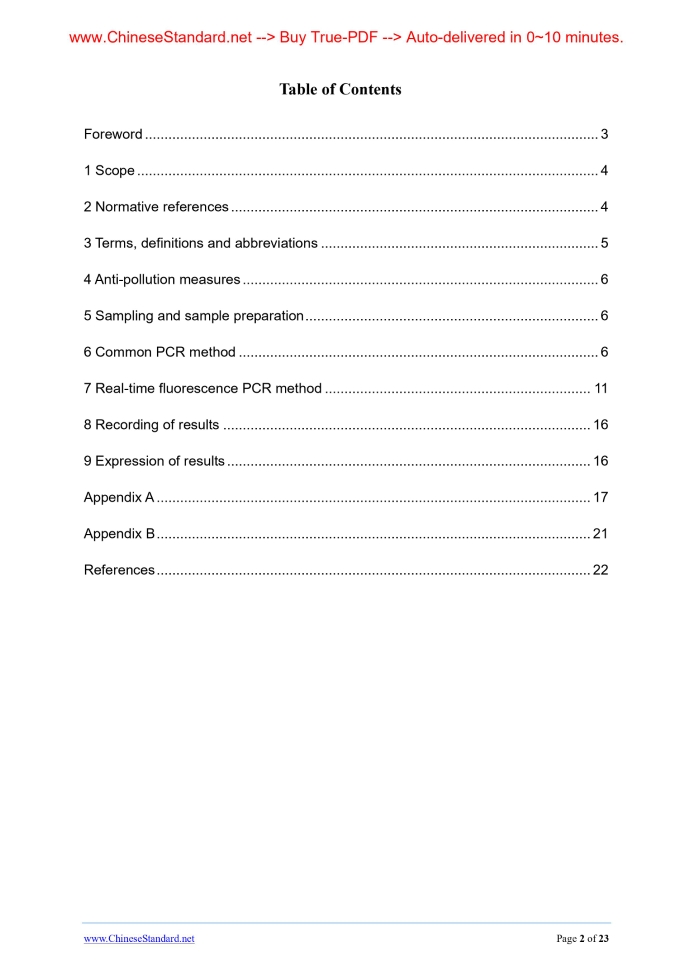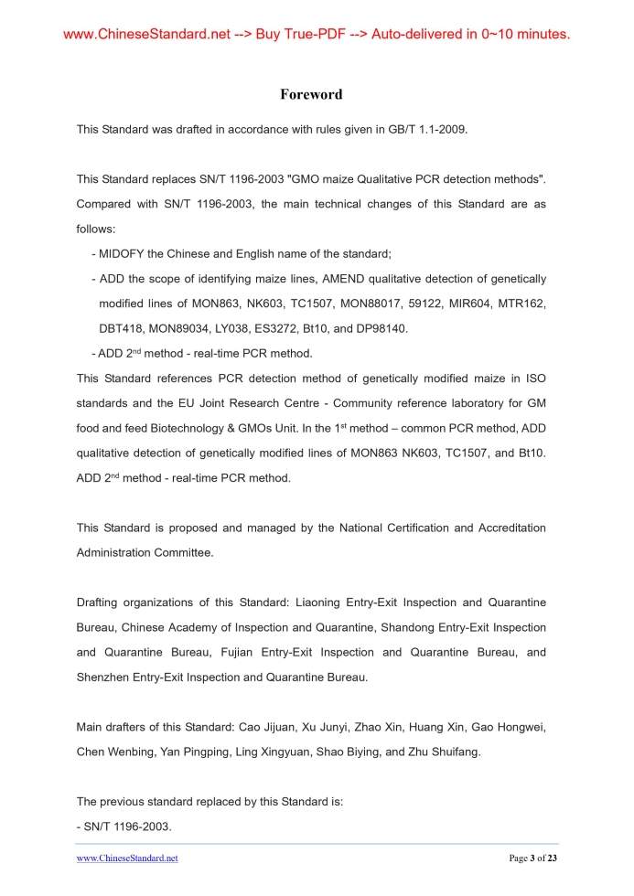 SN/T 1196-2012: Detection of genetically modified components - Maize test methods---This is an excerpt. Full copy of true-PDF in English version (including equations, symbols, images, flow-chart, tables, and figures etc.), auto-downloaded/delivered in 9 seconds, can be purchased online: https://www.ChineseStandard.net/PDF.aspx/SNT1196-2012SN Industry Standard of the People’s Republic of China Replacing SN/T 1196-2003 Detection of genetically modified components – Maize test methods ISSUE ON. DECEMBER 12, 2012 Implemented on: JULY 1, 2013 Issued by. State Administration of Quality Supervision and Inspection and Quarantine of the People’s Republic of China Table of ContentsForeword... 3 1 Scope... 4 2 Normative references... 4 3 Terms, definitions and abbreviations... 5 4 Anti-pollution measures... 6 5 Sampling and sample preparation... 6 6 Common PCR method... 6 7 Real-time fluorescence PCR method... 11 8 Recording of results... 16 9 Expression of results... 16 Appendix A... 17 Appendix B... 21 References... 22ForewordThis Standard was drafted in accordance with rules given in GB/T 1.1-2009. This Standard replaces SN/T 1196-2003 "GMO maize Qualitative PCR detection methods". Compared with SN/T 1196-2003, the main technical changes of this Standard are as follows. - MIDOFY the Chinese and English name of the standard; - ADD the scope of identifying maize lines, AMEND qualitative detection of genetically modified lines of MON863, NK603, TC1507, MON88017, 59122, MIR604, MTR162, DBT418, MON89034, LY038, ES3272, Bt10, and DP98140. - ADD 2nd method - real-time PCR method. This Standard references PCR detection method of genetically modified maize in ISO standards and the EU Joint Research Centre - Community reference laboratory for GM food and feed Biotechnology & GMOs Unit. In the 1st method – common PCR method, ADD qualitative detection of genetically modified lines of MON863 NK603, TC1507, and Bt10. ADD 2nd method - real-time PCR method. This Standard is proposed and managed by the National Certification and Accreditation Administration Committee. Drafting organizations of this Standard. Liaoning Entry-Exit Inspection and Quarantine Bureau, Chinese Academy of Inspection and Quarantine, Shandong Entry-Exit Inspection and Quarantine Bureau, Fujian Entry-Exit Inspection and Quarantine Bureau, and Shenzhen Entry-Exit Inspection and Quarantine Bureau. Main drafters of this Standard. Cao Jijuan, Xu Junyi, Zhao Xin, Huang Xin, Gao Hongwei, Chen Wenbing, Yan Pingping, Ling Xingyuan, Shao Biying, and Zhu Shuifang. The previous standard replaced by this Standard is. - SN/T 1196-2003. Detection of genetically modified components – Maize test methods1 ScopeThis Standard specifies the PCR method and real-time fluorescence PCR method of detecting genetically modified components in maize and maize-processed products. The screening detection of this Standard applies to qualitative detection of genetically modified components in maize and maize-processed products. Identification detection of this Standard applies to qualitative detection of genetically modified components of maize lines MON810, Bt11, Bt176, T14/T25, CBH351, GA21, MON863, NK603, TC1507, MON88017, 59122, MIR604, MIR162, DBT418, MON89034, LY038, ES3272, Bt10, and DP98140.2 Normative referencesThe following documents for the application of this document are essential. Only those dated documents are applicable to this document. For undated references, the latest edition (including any amendments) applies to this document. GB/T 6682 Analytical laboratory use - Specification and test methods GB/T 19495.1 Detection of genetically modified organisms and derived products. General requirements and definitions GB/T 19495.2 Detection of genetically modified organism and derived products. General requirements for laboratories GB/T 19495.3 Detection of genetically modified organisms and derived products. Nucleic acid extraction GB/T 19495.7 Detection of genetically modified organisms and derived products. Gene-chip detection 6.2.15 10 X loading buffer. 0.25% bromophenol blue, 40% sucrose. 6.2.16 RNA enzyme (10μg/mL). 6.2.17 UNG enzyme (Uracil N-glycosylase). 6.3 Instruments Solid grinder and mortar; high-speed refrigerated centrifuge; desktop mini centrifuge, mini individual centrifuge; bath incubator, incubator, constant temperature incubator; balance. sensitivity of 0.001 g; autoclave; temperature oven; distilled water maker or double water heater; refrigerator, freezers; ice maker; vortex oscillator; microwave oven; Cycler; electrophoresis; PCR clean bench; nucleic acid protein analyzer; micropipette (0.1μL - 2μL, 0.5μL - 10μL, 2μL - 20μL, 10μL - 100μL, 20μL - 200μL, 200μL - 1000μL); gel imaging system; centrifuge tube. 1.5 mL - 5 mL; PCR reaction tube. two specifications of 200μL, 500μL. 6.4 Detection steps 6.4.1 Settings of contrast Contrast shall be set in accordance with provisions in GB/T 19495.2 during the detection procedure. DNA contrast of negative target. It shall not contain DNA fragment of exogenous target nucleic acid sequence. DNA contrast of positive target. It can be the reference DNA, or the DNA extracted from traceable reference material, or the DNA extracted from positive sample (or organism) which contains known sequences. Contrast of amplification reagent. All reaction reagents except the DNA template of test samples. USE the same volume of water (excluding the nucleic acid) to substitute template DNA in the PCR reaction system. 6.4.2 Extraction of template DNA WEIGH 1 g of powder sample into 10 mL centrifuge tube; ADD 5 mL of CTAB lysis buffer (including appropriate amount of RNA enzymes); MIX well; at 60ºC water bath SHAKE for 1 7.4.7.2 Relation between Ct value and DNA concentration When Ct value is greater than or equal to 40, there is no amplification of the target DNA in PCR procedure; if Ct value is between 36 - 40, and difference between each value of parallel samples is very large, it indicates tha