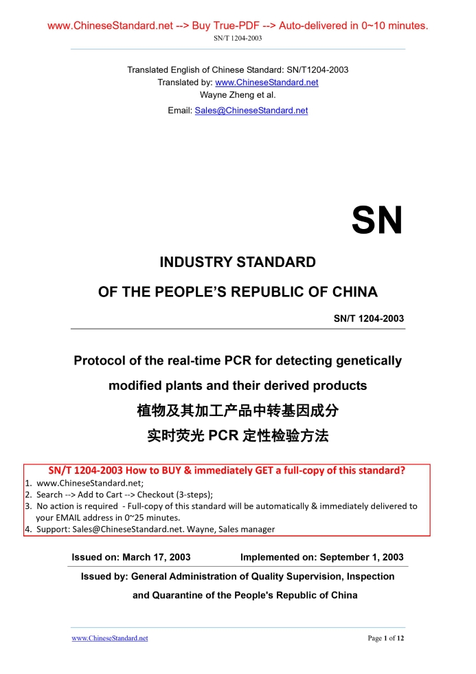 SN/T 1204-2003: Protocol of the real-time PCR for detecting genetically modified plants and their derived products Delivery: 9 seconds. True-PDF full-copy in English & invoice will be downloaded + auto-delivered via email. See step-by-step procedure Status: Obsolete SN/T 1204: Historical versions