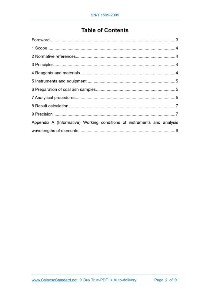 Similar standardsSN/T 1599-2005: Determination for major elements in coal ash by ICP-AES---This is an excerpt. Full copy of true-PDF in English version (including equations, symbols, images, flow-chart, tables, and figures etc.), auto-downloaded/delivered in 9 seconds, can be purchased online: https://www.ChineseStandard.net/PDF.aspx/SNT1599-2005SN ENTRY AND EXIT INSPECTION AND QUARANTINE INDUSTRY STANDARD OF THE PEOPLE’S REPUBLIC OF CHINA Determination for major elements in coal ash by ICP- AES ISSUED ON: MAY 20, 2005 IMPLEMENTED ON: DECEMBER 01, 2005 Issued by: General Administration of Quality Supervision, Inspection and Quarantine of PRC Table of ContentsForeword ... 3 1 Scope ... 4 2 Normative references ... 4 3 Principles ... 4 4 Reagents and materials ... 4 5 Instruments and equipment... 5 6 Preparation of coal ash samples ... 5 7 Analytical procedures ... 5 8 Result calculation ... 7 9 Precision ... 7 Appendix A (Informative) Working conditions of instruments and analysis wavelengths of elements ... 9 Determination for major elements in coal ash by ICP- AES1 ScopeThis standard specifies the inductively coupled plasma atomic emission spectrometry (referred to as ICP-AES) method, for the determination of the content of SiO2, Al2O3, Fe2O3, CaO, MgO, TiO2, P2O5 K2O, Na2O, SO3 in coal ash. This standard applies to the determination of SiO2, Al2O3, Fe2O3, CaO, MgO, TiO2, P2O5, K2O, Na2O, SO3 content in coal ash. Coke ash and coal gangue lime can also make reference to this standard.2 Normative referencesThe provisions in following documents become the provisions of this Standard through reference in this Standard. For the dated references, the subsequent amendments (excluding corrections) or revisions do not apply to this Standard; however, parties who reach an agreement based on this Standard are encouraged to study if the latest versions of these documents are applicable. For undated references, the latest edition of the referenced document applies. GB/T 212 Proximate analysis of coal (eqv ISO 11722) GB 474 Preparation of coal sample (eqv ISO 1988) GB/T 602 Chemical reagent - Preparations of standard solutions for impurity (ISO 6353-1, NEQ)3 PrinciplesThe specimens are melted by lithium tetraborate, extracted by nitric acid, then measured by inductively coupled plasma atomic emission spectrometer.4 Reagents and materialsUnless otherwise stated, only reagents confirmed to be of analytically pure and deionized water or water of equivalent purity are used in the analysis. 4.1 Anhydrous lithium tetraborate: Excellent grade pure. 4.2 Nitric acid (ρ = 1.42 g/mL). 4.3 Nitric acid solution (1 + 9): Mix 1 volume of nitric acid (4.2) with 9 volumes of water. 4.4 Standard solution: The standard solution of each element can be prepared according to GB/T 602 method, OR it may directly use certified standard solution. The mass concentration is 1000 mg/L (or 500 mg/L).5 Instruments and equipment5.1 ICP-AES: It is equipped with computer control and data processing system. 5.2 Analytical balance: Sensitivity is 0.0001 g. 5.3 Muffle furnace: It is equipped with temperature control device, which can control the temperature at (1000 ± 10) °C. 5.4 Electric heating plate: The temperature is adjustable. 5.5 Platinum crucible: 30 mL. 5.6 Volumetric flask: 200 mL.6 Preparation of coal ash samplesTake an appropriate amount of coal samples, which are prepared by the method of GB 474 for air-drying analysis. Perform ashing, according to the ashing steps of the slow ashing method in GB/T 212. The obtained ash is ground in an agate mortar AND all passed through a 160-mesh sieve. Then it is placed in an ash dish; burned at (815 ± 10) °C for 30 min, until reaching the constant weight.7 Analytical procedures7.1 Preparation of specimen solution Weigh 0.1 g of ash sample (accurate to 0.1 mg), in a platinum crucible, which was pre-loaded with 0.5 g of lithium tetraborate (4.1). Stir it evenly. Melt it in a muffle furnace, which was pre-heated to (1000 ± 10) °C, for 10 min. Shake the crucible. Melt it for another 5 min. The whole melting process does not exceed 20 min. Take out the crucible. Cool it slightly. Put the crucible into a 250 mL beaker, which contains 150 mL of nitric acid solution (4.3). Place it on a hot plate to heat it. Stir it constantly. After the frit is completely dissolved, remove ......Source: Above contents are excerpted from the full-copy PDF -- translated/reviewed by: www.ChineseStandard.net / Wayne Zheng et al. Tips & Frequently Asked Questions:Question 1: How long will the true-PDF of English version of SN/T 1599-2005 be delivered?Answer: The full copy PDF of English version of SN/T 1599-2005 can be downloaded in 9 seconds, and it will also be emailed to you in 9 seconds (double mechanisms to ensure the delivery reliably), with PDF-invoice.Question 2: Can I share the purchased PDF of SN/T 1599-2005_English with my colleagues?Answer: Yes. The purchased PDF of SN/T 1599-2005_English will be deemed to be sold to your employer/organization who actually paid for it, including your colleagues and your employer's intranet.Question 3: Does the price include tax/VAT?Answer: Yes. Our tax invoice, downloaded/delivered in 9 seconds, includes all tax/VAT and complies with 100+ countries' tax regulations (tax exempted in 100+ countries) -- See Avoidance of Double Taxation Agreements (DTAs): List of DTAs signed between Singapore and 100+ countriesQuestion 4: Do you accept my currency other than USD?Answer: Yes. www.ChineseStandard.us -- SN/T 1599-2005 -- Click this link and select your country/currency to pay, the exact amount in your currency will be printed on the invoice. Full PDF will also be downloaded/emailed in 9 seconds.How to buy and download a true PDF of English version of SN/T 1599-2005?A step-by-step guide to download PDF of SN/T 1599-2005_EnglishStep 1: Visit website https://www.ChineseStandard.net (Pay in USD), or https://www.ChineseStandard.us (Pay in any currencies such as Euro, KRW,