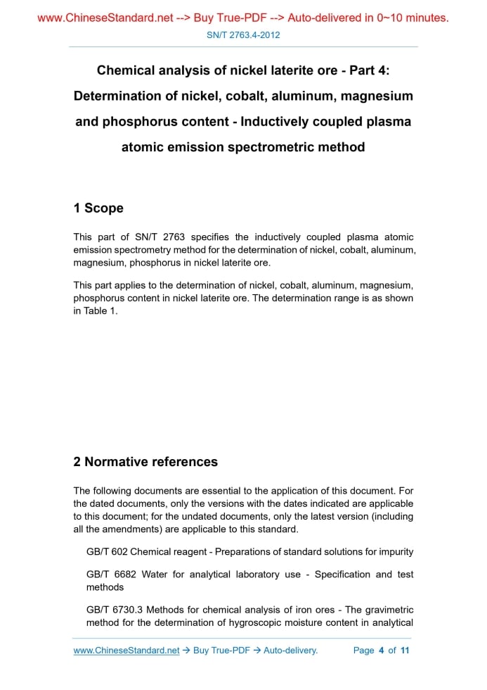 SN/T 2763.4-2012: Chemical analysis of nickel laterite ore - Part 4: Determination of nickel, cobalt, aluminum, magnesium and phosphorus content - Inductively coupled plasma atomic emission spectrometric method Delivery: 9 seconds. True-PDF full-copy in English & invoice will be downloaded + auto-delivered via email. See step-by-step procedure Status: Valid