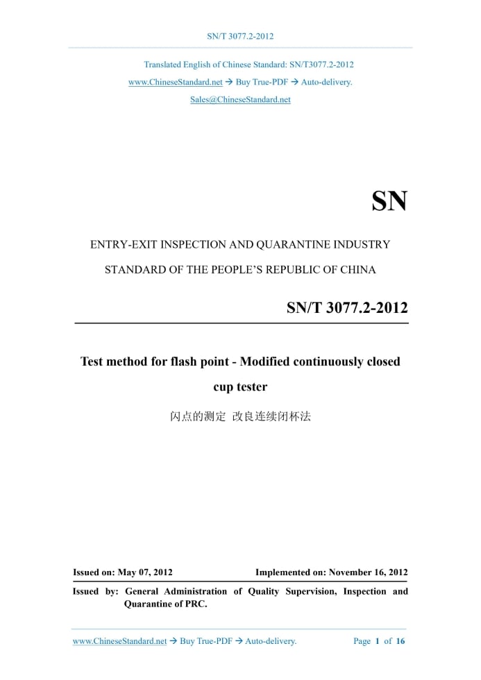 SN/T 3077.2-2012: Test method of flash point. Modified continuously closed cup tester Delivery: 9 seconds. True-PDF full-copy in English & invoice will be downloaded + auto-delivered via email. See step-by-step procedure Status: Valid