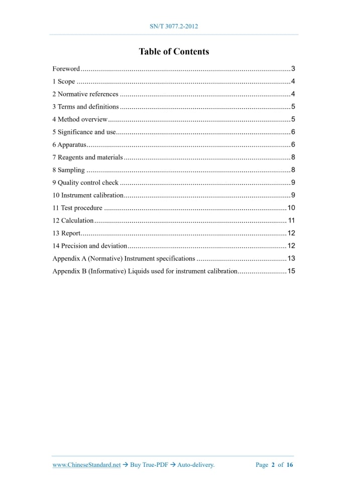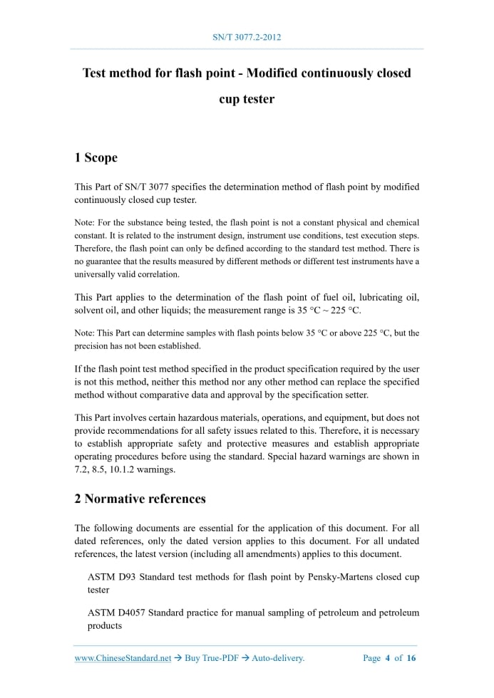 SN/T 3077.2-2012: Test method of flash point. Modified continuously closed cup tester---This is an excerpt. Full copy of true-PDF in English version (including equations, symbols, images, flow-chart, tables, and figures etc.), auto-downloaded/delivered in 9 seconds, can be purchased online: https://www.ChineseStandard.net/PDF.aspx/SNT3077.2-2012SN ENTRY-EXIT INSPECTION AND QUARANTINE INDUSTRY STANDARD OF THE PEOPLE’S REPUBLIC OF CHINA Test method for flash point - Modified continuously closed cup tester ISSUED ON: MAY 07, 2012 IMPLEMENTED ON: NOVEMBER 16, 2012 Issued by: General Administration of Quality Supervision, Inspection and Quarantine of PRC. Table of ContentsForeword ... 3 1 Scope ... 4 2 Normative references ... 4 3 Terms and definitions ... 5 4 Method overview ... 5 5 Significance and use ... 6 6 Apparatus ... 6 7 Reagents and materials ... 8 8 Sampling ... 8 9 Quality control check ... 9 10 Instrument calibration ... 9 11 Test procedure ... 10 12 Calculation ... 11 13 Report ... 12 14 Precision and deviation ... 12 Appendix A (Normative) Instrument specifications ... 13 Appendix B (Informative) Liquids used for instrument calibration ... 15 Test method for flash point - Modified continuously closed cup tester1 ScopeThis Part of SN/T 3077 specifies the determination method of flash point by modified continuously closed cup tester. Note: For the substance being tested, the flash point is not a constant physical and chemical constant. It is related to the instrument design, instrument use conditions, test execution steps. Therefore, the flash point can only be defined according to the standard test method. There is no guarantee that the results measured by different methods or different test instruments have a universally valid correlation. This Part applies to the determination of the flash point of fuel oil, lubricating oil, solvent oil, and other liquids; the measurement range is 35 °C ~ 225 °C. Note: This Part can determine samples with flash points below 35 °C or above 225 °C, but the precision has not been established. If the flash point test method specified in the product specification required by the user is not this method, neither this method nor any other method can replace the specified method without comparative data and approval by the specification setter. This Part involves certain hazardous materials, operations, and equipment, but does not provide recommendations for all safety issues related to this. Therefore, it is necessary to establish appropriate safety and protective measures and establish appropriate operating procedures before using the standard. Special hazard warnings are shown in 7.2, 8.5, 10.1.2 warnings.2 Normative referencesThe following documents are essential for the application of this document. For all dated references, only the dated version applies to this document. For all undated references, the latest version (including all amendments) applies to this document. ASTM D93 Standard test methods for flash point by Pensky-Martens closed cup tester ASTM D4057 Standard practice for manual sampling of petroleum and petroleum products ASTM D4177 Standard practice for automatic sampling of petroleum and petroleum products ASTM D6450 Standard test method for flash point by continuously closed cup (CCCFP) tester ASTM D6708 Standard practice for statistical assessment and improvement of expected agreement between two test methods that purport to measure the same property of a material ASTM E300 Standard practice for sampling industrial chemicals3 Terms and definitionsThe following terms and definitions apply to this document. 3.1 Flash point The lowest temperature (corrected to 101.3 kPa pressure) at which the vapor of the specimen ignites under the specified test conditions. In a closed test chamber, the specimen is confirmed to have flashed when the instantaneous pressure increase caused by the hot flame is not less than 20 kPa. 3.2 Dynamic The state when the vapor on the specimen and the specimen have not reached temperature equilibrium when the fire source is introduced.4 Method overview4.1 Set the test temperature to be not less than 18 °C lower than the expected flash point. Inject 2.0 mL ± 0.2 mL of the specimen into the sample cup. The temperature of the specimen and the sample cup is not less than (the same below) 18 °C lower than the expected flash point; it can be cooled if necessary. Raise the sample cup and press it tightly with the lid to achieve airtightness. At this time, the total volume of the test chamber is 7.0 mL ± 0.3 mL. 4.2 After the test chamber is closed, the temperature difference between the specimen and the lid shall be within 1 °C; it is heated at a uniform rate. A high-voltage arc of a certain energy is discharged in the test chamber at specified intervals. After each ignition, an indefinite amount of air (see Table 1) is introduced into the test chamber, to provide the required oxygen for the next flash test. The pressure in the test chamber is voltage arcs, a connecting pipe connected to the lid for pressure detection and air introduction. It also requires an electronic device to control the temperature of the test chamber and a digital display that can display the specimen temperature. The apparatus and its main components are shown in Figures A.1 and A.2: - Test chamber: The test chamber consists of a sample cup and a temperature- controlled lid with a total volume of 7.0 mL ± 0.3 mL. The metal contact between the lid and the sample cup is to ensure good heat conduction; the incomplete seal is to ensure that the test chamber is at ambient atmospheric pressure during the test. Its dimensions are shown in Figure A.2. When the temperature rises, the pressure in the test chamber will be detected. Excessive sealing will cause the pressure increase caused by the temperature and vapor pressure of the specimen to be higher than the atmospheric pressure. Poor heat conduction will cause a large difference in temp