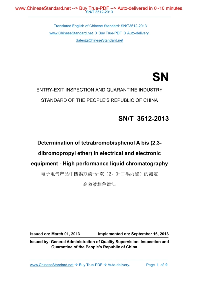 SN/T 3512-2013: Determination of tetrabromobisphenol A bis(2, 3-dibromopropyl ether) in electrical and electronic equipment. High performance liquid chromatography Delivery: 9 seconds. True-PDF full-copy in English & invoice will be downloaded + auto-delivered via email. See step-by-step procedure Status: Valid