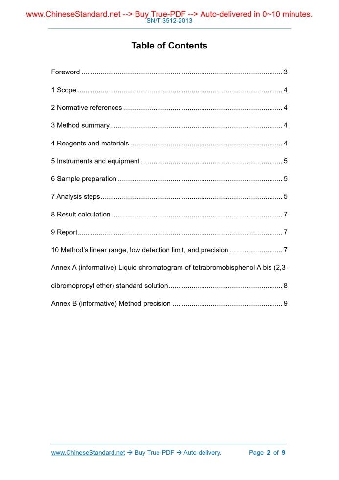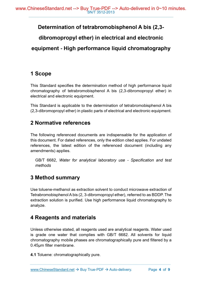 Similar standardsSN/T 3512-2013: Determination of tetrabromobisphenol A bis(2, 3-dibromopropyl ether) in electrical and electronic equipment. High performance liquid chromatography---This is an excerpt. Full copy of true-PDF in English version (including equations, symbols, images, flow-chart, tables, and figures etc.), auto-downloaded/delivered in 9 seconds, can be purchased online: https://www.ChineseStandard.net/PDF.aspx/SNT3512-2013 ENTRY-EXIT INSPECTION AND QUARANTINE INDUSTRY STANDARD OF THE PEOPLE’S REPUBLIC OF CHINA Determination of tetrabromobisphenol A bis (2,3- dibromopropyl ether) in electrical and electronic equipment - High performance liquid chromatography ISSUED ON: MARCH 01, 2013 IMPLEMENTED ON: SEPTEMBER 16, 2013 Issued by: General Administration of Quality Supervision, Inspection and Quarantine of the People's Republic of China. Table of ContentsForeword ... 3 1 Scope ... 4 2 Normative references ... 4 3 Method summary ... 4 4 Reagents and materials ... 4 5 Instruments and equipment ... 5 6 Sample preparation ... 5 7 Analysis steps ... 5 8 Result calculation ... 7 9 Report ... 7 10 Method's linear range, low detection limit, and precision ... 7 Annex A (informative) Liquid chromatogram of tetrabromobisphenol A bis (2,3- dibromopropyl ether) standard solution ... 8 Annex B (informative) Method precision ... 9 Determination of tetrabromobisphenol A bis (2,3- dibromopropyl ether) in electrical and electronic equipment - High performance liquid chromatography1 ScopeThis Standard specifies the determination method of high performance liquid chromatography of tetrabromobisphenol A bis (2,3-dibromopropyl ether) in electrical and electronic equipment. This Standard is applicable to the determination of tetrabromobisphenol A bis (2,3-dibromopropyl ether) in plastic parts of electrical and electronic equipment.2 Normative referencesThe following referenced documents are indispensable for the application of this document. For dated references, only the edition cited applies. For undated references, the latest edition of the referenced document (including any amendments) applies. GB/T 6682, Water for analytical laboratory use - Specification and test methods3 Method summaryUse toluene-methanol as extraction solvent to conduct microwave extraction of Tetrabromobisphenol A bis (2, 3-dibromopropyl ether), referred to as BDDP. The extraction solution is purified. Use high performance liquid chromatography to analyze.4 Reagents and materialsUnless otherwise stated, all reagents used are analytical reagents. Water used is grade one water that complies with GB/T 6682. All solvents for liquid chromatography mobile phases are chromatographically pure and filtered by a 0.45µm filter membrane. 4.1 Toluene: chromatographically pure. in an extraction can. Accurately pipette 20mL of toluene + methanol (4.5). Seal and place in the microwave extraction instrument (5.2). Rise the temperature to 115°C within 5min. Maintain for more than 15min. Cool to room temperature. If the extraction solution is cloudy and cannot be filtered through a filter, then accurately pipette 2mL of sample extraction solution. Conduct precipitation purification treatment according to 7.2. If the extraction solution is clear, then directly use a 0.46µm nylon filter membrane. Then take part of the filtrate for chromatographic analysis. 7.2 Precipitation purification In 2mL of extraction solution that is obtained after processing as 7.1, accurately add 6mL of n-hexane or methanol. If precipitation occurs in the solution, it shall conduct centrifuge separation. After removing the serum, set volume to 10mL. Use a 0.46µm nylon filter membrane to filter, then conduct spectrum analysis. 7.3 Chromatographic conditions Since the test results depend on the instrument used, it is not possible to give general parameters for liquid chromatography. The set parameters shall ensure that the measured component can be effectively separated from other components during chromatographic determination. The parameters given below prove to be feasible. a) Chromatographic column: C18 reverse-phase column [150 × 4.6mm (inner diameter) × 5μm] or equivalent; b) Column temperature: 30°C; c) Isocratic elution: acetonitrile (4.3) + water (95 + 5, V/V); d) Detection wavelength: 230nm; e) Injection volume: 10μL; f) Flow rate: 0.8mL/min. 7.4 Determination Inject the samples of standard solution (4.8) and sample solution with equal volume alternately. Determine the nature according to chromatographic retention time of standard solution. Use external standard method to quantify based on chromatographic peak area. Analyze the standard solution according to the above analysis conditions (7.3). See Annex A for its typical chromatogram. 7.5 Blank test ......Source: Above contents are excerpted from the full-copy PDF -- translated/reviewed by: www.ChineseStandard.net / Wayne Zheng et al. Tips & Frequently Asked Questions:Question 1: How long will the true-PDF of English version of SN/T 3512-2013 be delivered?Answer: The full copy PDF of English version of SN/T 3512-2013 can be downloaded in 9 seconds, and it will also be emailed to you in 9 seconds (double mechanisms to ensure the delivery reliably), with PDF-invoice.Question 2: Can I share the purchased PDF of SN/T 3512-2013_English with my colleagues?Answer: Yes. The purchased PDF of SN/T 3512-2013_English will be deemed to be sold to your employer/organization who actually paid for it, including your colleagues and your employer's intranet.Question 3: Does the price include tax/VAT?Answer: Yes. Our tax invoice, downloaded/delivered in 9 seconds, includes all tax/VAT and complies with 100+ countries' tax regulations (tax exempted in 100+ countries) -- See Avoidance of Double Taxation Agreements (DTAs): List of DTAs signed between Singapore and 100+ countriesQuestion 4: Do you accept my currency other than USD?Answer: Yes. www.ChineseStandard.us -- SN/T 3512-2013 -- Click this link and select your cou