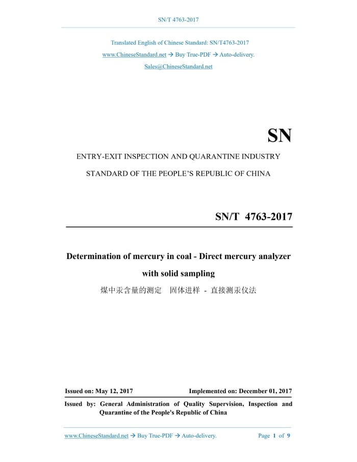 SN/T 4763-2017: Determination of mercury in coal. Direct mercury analyzer with solid sampling Delivery: 9 seconds. True-PDF full-copy in English & invoice will be downloaded + auto-delivered via email. See step-by-step procedure Status: Valid