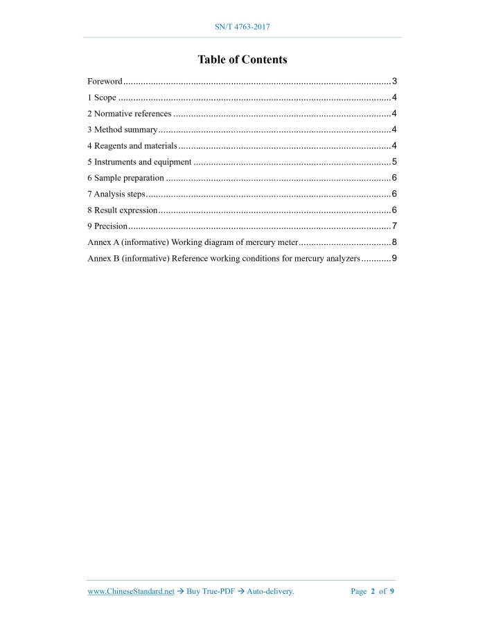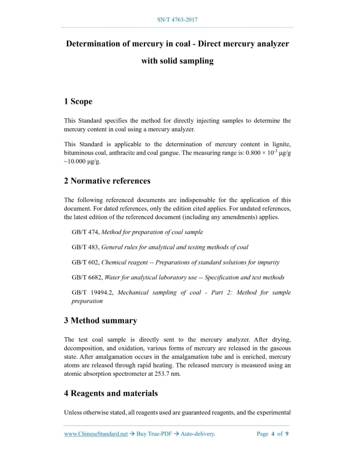 Similar standardsSN/T 4763-2017: Determination of mercury in coal. Direct mercury analyzer with solid sampling---This is an excerpt. Full copy of true-PDF in English version (including equations, symbols, images, flow-chart, tables, and figures etc.), auto-downloaded/delivered in 9 seconds, can be purchased online: https://www.ChineseStandard.net/PDF.aspx/SNT4763-2017SN ENTRY-EXIT INSPECTION AND QUARANTINE INDUSTRY STANDARD OF THE PEOPLE’S REPUBLIC OF CHINA Determination of mercury in coal - Direct mercury analyzer with solid sampling ISSUED ON: MAY 12, 2017 IMPLEMENTED ON: DECEMBER 01, 2017 Issued by: General Administration of Quality Supervision, Inspection and Quarantine of the People's Republic of China Table of ContentsForeword ... 3 1 Scope ... 4 2 Normative references ... 4 3 Method summary ... 4 4 Reagents and materials ... 4 5 Instruments and equipment ... 5 6 Sample preparation ... 6 7 Analysis steps ... 6 8 Result expression ... 6 9 Precision ... 7 Annex A (informative) Working diagram of mercury meter ... 8 Annex B (informative) Reference working conditions for mercury analyzers ... 9 Determination of mercury in coal - Direct mercury analyzer with solid sampling1 ScopeThis Standard specifies the method for directly injecting samples to determine the mercury content in coal using a mercury analyzer. This Standard is applicable to the determination of mercury content in lignite, bituminous coal, anthracite and coal gangue. The measuring range is: 0.800 × 10-3 μg/g ~10.000 μg/g.2 Normative referencesThe following referenced documents are indispensable for the application of this document. For dated references, only the edition cited applies. For undated references, the latest edition of the referenced document (including any amendments) applies. GB/T 474, Method for preparation of coal sample GB/T 483, General rules for analytical and testing methods of coal GB/T 602, Chemical reagent -- Preparations of standard solutions for impurity GB/T 6682, Water for analytical laboratory use -- Specification and test methods GB/T 19494.2, Mechanical sampling of coal - Part 2: Method for sample preparation3 Method summaryThe test coal sample is directly sent to the mercury analyzer. After drying, decomposition, and oxidation, various forms of mercury are released in the gaseous state. After amalgamation occurs in the amalgamation tube and is enriched, mercury atoms are released through rapid heating. The released mercury is measured using an atomic absorption spectrometer at 253.7 nm.4 Reagents and materialsUnless otherwise stated, all reagents used are guaranteed reagents, and the experimental water is grade two water specified in GB/T 6682. 4.1 Nitric acid (ρ=1.42 g/mL). 4.2 Nitric acid: (5+95). 4.3 Certified reference materials for coal: mercury content has been determined. 4.4 Mercury standard stock solution (1000 µg/mL): use national certified standard solution or prepare according to GB/T 602. 4.5 Mercury standard intermediate solution (100 µg/mL): accurately pipette 10 mL of mercury standard stock solution (4.4) into a 100 mL volumetric flask. Add 5 mL of nitric acid (4.1). Add water to dilute to volume. Shake well. 4.6 Mercury standard working solution series 1: absorb mercury standard intermediate solution (4.5) to prepare: 0 µg/mL, 0.020 µg/mL, 0.050 µg/mL, 0.100 µg/mL, 0.250 µg/mL, 0.500 µg/mL mercury standard working solution. The solvent is nitric acid (4.2). Prepare when needed. 4.7 Mercury standard working solution series 2: absorb mercury standard intermediate solution (4.5) to prepare: 0 µg/mL, 0.50 µg/mL, 1.00 µg/mL, 2.00 µg/mL, 5.00 µg/mL, 10.00 µg/mL mercury standard working solution. The solvent is nitric acid (4.2). Prepare when needed.5 Instruments and equipment5.1 Mercury analyzer: equipped with a powder direct sampling device, a thermal decomposition device, an amalgamation device and an atomic absorption device (see Annex A). 5.2 Analytical balance: division is 0.1 mg. 5.3 Volumetric flask: grade A, 100 mL. 5.4 Pipette tubes: grade A, 1.0 mL, 5.0 mL, 10.0 mL. 5.5 Pipette: 0 μL~100 μL. 5.6 Sample boat: made of quartz or nickel, suitable for instrument use. The volume is not less than 150 μL. 5.7 Agate mortar. 5.8 Standard sieve: 116 μm. 5.9 High purity oxygen: purity ≥99.999%.6 Sample preparationThe general analysis test coal samples prepared according to GB/T 474 or GB/T 19494.2 are ground with an agate mortar until all of them pass the 116 μm standard sieve, and are set aside.7 Analysis steps7.1 Blank test Do a blank test along with the specimen. 7.2 Sample determination Accurately weigh 0.09 g±0.01 g of the general analysis test coal sample. Weighing is accurate to 0.0001 g. Place in the sample boat. Refer to the working conditions in Annex B for measurement. 7.3 Drawing of working curve 7.3.1 Working curve 1 Adjust the instrument conditions to appropriate working parameters according to the instrument instructions (see Annex B). In order from low concentration to high concentration, pipette 100 μL of mercury standard working solution series 1 (4.6) and add it to the sample boat for measurement. Draw the working curve 1 with the mercury content in the standard working solution as the abscissa and the absorbance as the ordinate. 7.3.2 Working curve 2 Determine the mercury standard working solution series 2 (4.7) according to steps 7.3.1. Draw working curve 2. 7.4 Verification of standard curve Measure the standard materials with similar contents at the upper and lower ends of each standard curve, respectively. If the measurement result is within the uncertainty range of the standard value, the standard curve is valid; otherwise, the cause should be found and the standard curve should be redrawn.8 Result expressionThe mercury content in general analytical test coal samples is calculated according to formula (1): ......Source: Above contents are excerpted from the full-copy PDF -- translated/reviewed by: www.ChineseStandard.net / Wayne Z