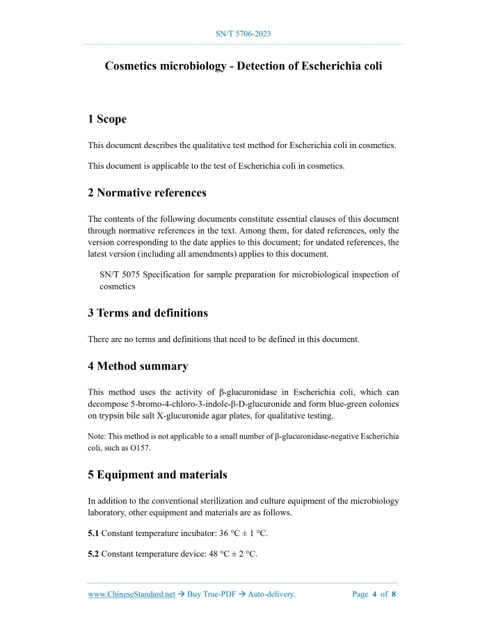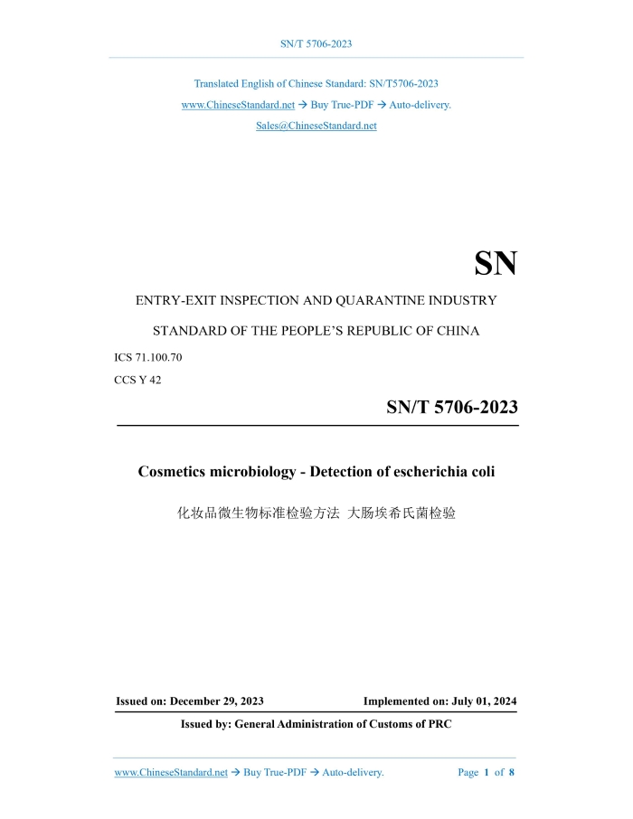 SN/T 5706-2023: Cosmetics microbiology - Detection of Escherichia coli Delivery: 9 seconds. True-PDF full-copy in English & invoice will be downloaded + auto-delivered via email. See step-by-step procedure Status: Valid