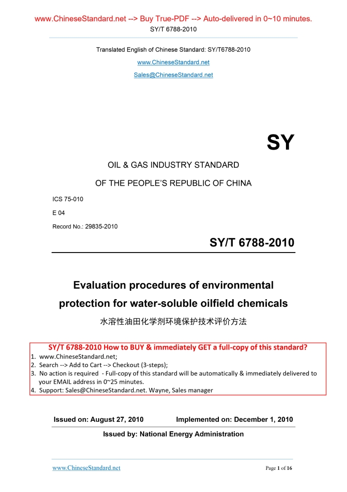 SY/T 6788-2010: Evaluation procedures of environmental protection for water-soluble oilfield chemicals Delivery: 9 seconds. True-PDF full-copy in English & invoice will be downloaded + auto-delivered via email. See step-by-step procedure Status: Obsolete SY/T 6788: Historical versions