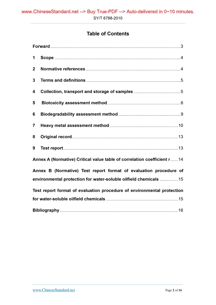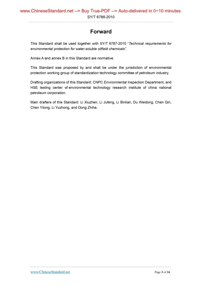 Similar standardsSY/T 6788-2010: Evaluation procedures of environmental protection for water-soluble oilfield chemicals---This is an excerpt. Full copy of true-PDF in English version (including equations, symbols, images, flow-chart, tables, and figures etc.), auto-downloaded/delivered in 9 seconds, can be purchased online: https://www.ChineseStandard.net/PDF.aspx/SYT6788-2010 SY OIL & GAS INDUSTRY STANDARD ICS 75-010 E 04 Record No.. 29835-2010 Evaluation procedures of environmental protection for water-soluble oilfield chemicals Issued on: AUGUST 27, 2010 Implemented on: DECEMBER 1, 2010 Issued by. National Energy Administration Table of ContentsForward... 3 1 Scope... 4 2 Normative references... 4 3 Terms and definitions... 5 4 Collection, transport and storage of samples... 5 5 Biotoxicity assessment method... 6 6 Biodegradability assessment method... 9 7 Heavy metal assessment method... 10 8 Original record... 13 9 Test report... 13 Annex A (Normative) Critical value table of correlation coefficient r... 14 Annex B (Normative) Test report format of evaluation procedure of environmental protection for water-soluble oilfield chemicals... 15 Test report format of evaluation procedure of environmental protection for water-soluble oilfield chemicals... 15 Bibliography... 16 Forward This Standard shall be used together with SY/T 6787-2010 “Technical requirements for environmental protection for water-soluble oilfield chemicals”. Annex A and annex B in this Standard are normative. This Standard was proposed by and shall be under the jurisdiction of environmental protection working group of standardization technology committee of petroleum industry. Drafting organizations of this Standard. CNPC Environmental Inspection Department, and HSE testing center of environmental technology research institute of china national petroleum corporation. Main drafters of this Standard. Li Xiuzhen, Li Jufeng, Li Binlian, Du Weidong, Chen Qin, Chen Yilong, Li Yuzhong, and Dong Zhihe. Evaluation procedure of environmental protection for water-soluble oilfield chemicals1 ScopeThis Standard specifies the environmental protection requirements and evaluation method of biological toxicity, biodegradability and heavy metal content in water-soluble oilfield chemicals that are used in oil and gas field. This Standard applies to the testing and evaluation of biological toxicity, biodegradability and heavy metal content during the production, purchase and use of water-soluble oilfield chemicals that are used in oil and gas field.2 Normative referencesThe articles contained in the following documents have become part of this Standard when they are quoted herein. For the dated documents so quoted, all the modifications (excluding corrections) or revisions made thereafter shall not be applicable to this Standard. For the undated documents so quoted, the latest editions shall be applicable to this Standard. GB/T 6679-2003 General rules for sampling solid chemical products GB/T 6680-2003 General rules for sampling liquid chemical products GB 7466-1987 Water quality - Determination of total chromium GB/T 7468-1987 Water quality - Determination of total mercury - Cold atomic absorption spectrophotometry GB/T 7475-1987 Water quality; Determination of copper, zinc, lead and cadmium - Atomic absorption spectrometry GB/T 7485-1987 Water quality - Determination of total arsenic - Silver diethyldithiocarbamate spectrophotometric method GB 11914-1989 Water quality-Determination of the chemical oxygen demand - Dichromate method SY/T 6787-2010 Technical requirements of environmental for water-soluble oilfield chemicals product standard. b) Preparation of samples. take one part of oilfield chemical reagent test solution and nine part of 30g/L sodium chloride solution according to volume ratio; stir it with 11000r/min±300r/min for 30 minutes; after standing for 60 minutes, calibrate the concentration of the sample solution to be 106 mg/L. Then sequentially dilute the solution into sample solutions with different concentrations (105 mg/L, 104 mg/L...10 mg/L and 1mg/L). When the diluted concentration of the measured sample is close to 50% of the relative luminosity, it is appropriate. 5.2.1.3 Recovery of lyophilized powder microbial inoculums. take an ampoules containing 0.5g of lyophilized powder out of the refrigerator at 2°C~5°C and 2.5g / 100mL sodium chloride solution. Add 1 mL of cooled 2.5g / 100mL sodium chloride solution into the open ampoules with lyophilized powder; mix them well. Then place the ampoules with lyophilized powder in a thermos containing ice cubes. After two minutes, lyophilized powder microbial inoculums will recover and illuminate; This is recovery bacteria liquid for later use. 5.2.1.4 Preheat and zero-setting of instrument. switch on the bioluminescence photometer; preheat it for 15 minutes; then set it to zero for use. 5.2.1.5 Inspect the quality of lyophilized powder. take a 2 mL test tube; add 2 mL of 30 g/L sodium chloride; add 10 µL of recovery bacteria liquid. cover the cork. Shake it upside down for five times to achieve a uniform. Unplug the cork; put the test tube in test chamber with bioluminescence photometer to test. If it emits light and shows the number more than 600mV, this bottle of lyophilized powder can be used for test; otherwise, it shall be replaced. 5.2.2 Determination 5.2.2.1 Permutation of test tubes. arrange the test tubes according to the following order on test tube rack. place the sample test tubes at the front row (referred to as sample tube); place the control test tubes at the back row (referred to as CK tube). Determine the sample with the same concentration for three times. 5.2.2.2 Add 30g/L sodium chloride solution. use quantitative liquid bottle to add 2 mL of 30g/L sodium chloride solution in each CK tube. 5.2.2.3 Add sample solution. before test, use 1 mol/L NaOH and 1 mol/L HCl to adjust the pH value of sample solution to 6.5-8.5.Use 2 mL pipette to add 2 mL of sa