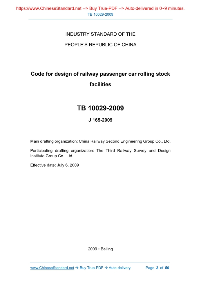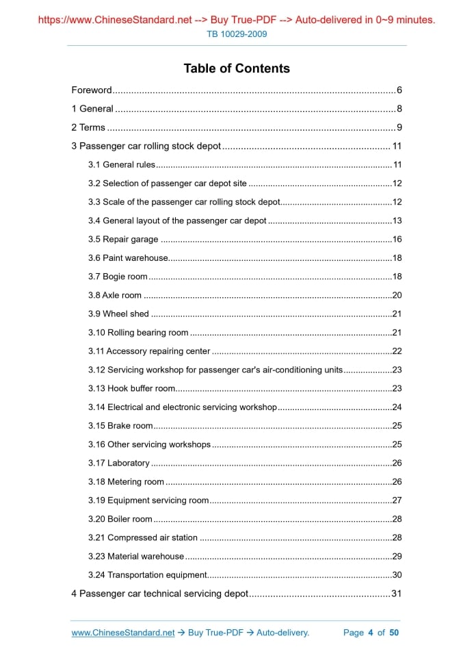 TB 10029-2009: Code for design of railway passenger car rolling stock facilities---This is an excerpt. Full copy of true-PDF in English version (including equations, symbols, images, flow-chart, tables, and figures etc.), auto-downloaded/delivered in 9 seconds, can be purchased online: https://www.ChineseStandard.net/PDF.aspx/TB10029-2009TB INDUSTRY STANDARD OF THE PEOPLE’S REPUBLIC OF CHINA UDC J 165-2009 Code for design of railway passenger car rolling stock facilities Issued on: JULY 01, 2009 Implemented on: JULY 06, 2009 Issued by. Ministry of Railway of PRC INDUSTRY STANDARD OF THE PEOPLE’S REPUBLIC OF CHINA Code for design of railway passenger car rolling stock facilities J 165-2009 Main drafting organization. China Railway Second Engineering Group Co., Ltd. Participating drafting organization. The Third Railway Survey and Design Institute Group Co., Ltd. Effective date. July 6, 2009 2009 • Beijing Table of ContentsForeword... 6 1 General... 8 2 Terms... 9 3 Passenger car rolling stock depot... 11 3.1 General rules... 11 3.2 Selection of passenger car depot site... 12 3.3 Scale of the passenger car rolling stock depot... 12 3.4 General layout of the passenger car depot... 13 3.5 Repair garage... 16 3.6 Paint warehouse... 18 3.7 Bogie room... 18 3.8 Axle room... 20 3.9 Wheel shed... 21 3.10 Rolling bearing room... 21 3.11 Accessory repairing center... 22 3.12 Servicing workshop for passenger car's air-conditioning units... 23 3.13 Hook buffer room... 23 3.14 Electrical and electronic servicing workshop... 24 3.15 Brake room... 25 3.16 Other servicing workshops... 25 3.17 Laboratory... 26 3.18 Metering room... 26 3.19 Equipment servicing room... 27 3.20 Boiler room... 28 3.21 Compressed air station... 28 3.23 Material warehouse... 29 3.24 Transportation equipment... 30 4 Passenger car technical servicing depot... 31 4.1 General rules... 31 4.2 Location and general layout of passenger car technical servicing depot... 32 4.3 Line layout and main facilities on the line group... 33 4.4 Repairing workshop... 38 4.5 Power facilities... 43 4.6 Material warehouse and garage... 43 4.7 Oil depot... 44 5 Passenger car inspection department... 45 6 Information system... 46 6.1 General... 46 6.2 System composition and function... 46 6.3 Network design... 47 6.4 System software and hardware configuration... 48 6.5 Others... 49 Explanation of wording in this code... 50 Code for design of railway passenger car rolling stock facilities1 General1.0.1 In order to improve the servicing quality of railway passenger cars, ensure the safety of passenger cars, unify the technical standards for the design of passenger car rolling stock facilities, make the design of passenger car rolling stock facilities to be technologically advanced, economical and reasonable, safe and applicable, this code is hereby formulated. 1.0.2 This code is applicable to the engineering design of new or rebuilt railway passenger car facilities with standard gauges in the national railway network. 1.0.3 The design of railway passenger car facilities shall include facilities such as passenger car rolling stock depot (referred to as passenger car depot), passenger car technical servicing depot, railway passenger car inspection department (referred to as passenger car inspection department). 1.0.4 The design year of railway passenger car rolling stock facilities shall be divided into short-term and long-term. The short-term is the 10th year after delivery and operation; the long-term is the 20th year after delivery and operation. The design of railway passenger car rolling stock facilities shall be a combination of short-term and long-term, focusing on the short-term, reserve development conditions based on the long-term scale. 1.0.5 The design of passenger car rolling stock facilities shall be based on factors such as the car type, number of cars attached, the workload of overhaul and operation and servicing, transportation organization, related passenger car rolling stock facilities, as well as the passenger car repair system, car technology development, road network planning. When determining the design plan of the passenger car rolling stock facilities, a technical and economic comparison shall be made to select the best plan. 1.0.6 During the renovation and expansion of railway passenger car rolling stock facilities, existing equipment may be used to minimize demolition and abandonment work, reduce the impact and interference of construction on production. rolling stock facilities (including passenger car rolling stock depots, passenger car technical servicing depots, passenger car inspection department, etc.). 2.0.2 Passenger car rolling stock depot The production premises that undertake the servicing of railway passenger car depots and the management tasks of the operation and servicing of passenger car rolling stock facilities within its jurisdiction. 2.0.3 Passenger car technical servicing depot The passenger car operation and servicing place which is responsible for the technical inspection of passenger cars of the departure and the final arrival, as well as the regular servicing of the passenger cars and the electric equipment. 2.0.4 Passenger car inspection department The operation & servicing space for passenger cars that undertakes technical inspections of passenger cars, brake tests, repairs without taking off the trains. 2.0.5 Passenger car stabling sidings In the passenger car technical service depot, the line which is used for parking under the passenger car. 2.0.6 Coefficient of non-serviceable rolling stock The ratio of the sum of the number of spare cars and the number of overhauled cars to the number of cars in use. 2.0.7 Utility factor of car repairing positions The ratio of the number of cars in the daily servicing of car equipment to the number of servicing depots in the repair garage (shed). 2.0.8 Coefficient of passenger car servicing tracks The ratio of the number of passenger car servicing tracks confi