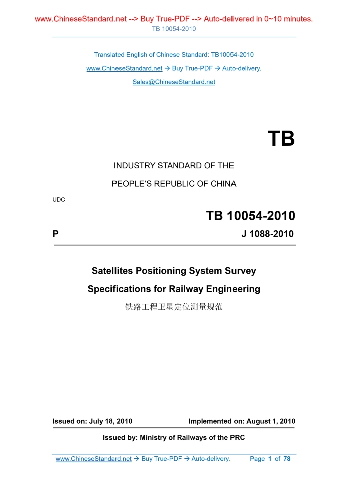 TB 10054-2010: Satellites Positioning System Survey Specifications for Railway Engineering Delivery: 9 seconds. True-PDF full-copy in English & invoice will be downloaded + auto-delivered via email. See step-by-step procedure Status: Valid TB 10054: Historical versions