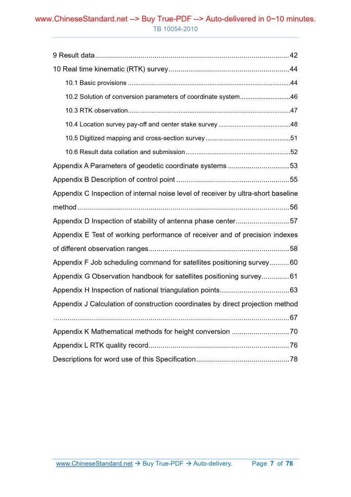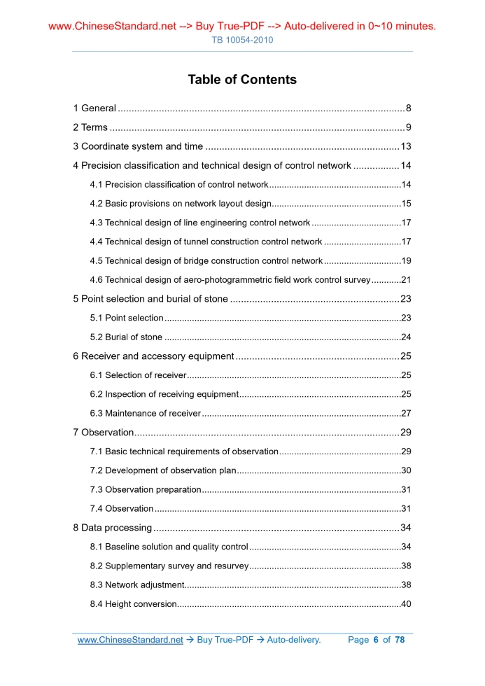 TB 10054-2010: Satellites Positioning System Survey Specifications for Railway Engineering---This is an excerpt. Full copy of true-PDF in English version (including equations, symbols, images, flow-chart, tables, and figures etc.), auto-downloaded/delivered in 9 seconds, can be purchased online: https://www.ChineseStandard.net/PDF.aspx/TB10054-2010TB INDUSTRY STANDARD OF THE PEOPLE’S REPUBLIC OF CHINA UDC P J 1088-2010 Satellites Positioning System Survey Specifications for Railway Engineering Issued on: JULY 18, 2010 Implemented on: AUGUST 1, 2010 Issued by. Ministry of Railways of the PRC Table of Contents1 General... 8 2 Terms... 9 3 Coordinate system and time... 13 4 Precision classification and technical design of control network... 14 4.1 Precision classification of control network... 14 4.2 Basic provisions on network layout design... 15 4.3 Technical design of line engineering control network... 17 4.4 Technical design of tunnel construction control network... 17 4.5 Technical design of bridge construction control network... 19 4.6 Technical design of aero-photogrammetric field work control survey... 21 5 Point selection and burial of stone... 23 5.1 Point selection... 23 5.2 Burial of stone... 24 6 Receiver and accessory equipment... 25 6.1 Selection of receiver... 25 6.2 Inspection of receiving equipment... 25 6.3 Maintenance of receiver... 27 7 Observation... 29 7.1 Basic technical requirements of observation... 29 7.2 Development of observation plan... 30 7.3 Observation preparation... 31 7.4 Observation... 31 8 Data processing... 34 8.1 Baseline solution and quality control... 34 8.2 Supplementary survey and resurvey... 38 8.3 Network adjustment... 38 8.4 Height conversion... 40 9 Result data... 42 10 Real time kinematic (RTK) survey... 44 10.1 Basic provisions... 44 10.2 Solution of conversion parameters of coordinate system... 46 10.3 RTK observation... 47 10.4 Location survey pay-off and center stake survey... 48 10.5 Digitized mapping and cross-section survey... 51 10.6 Result data collation and submission... 52 Appendix A Parameters of geodetic coordinate systems... 53 Appendix B Description of control point... 55 Appendix C Inspection of internal noise level of receiver by ultra-short baseline method... 56 Appendix D Inspection of stability of antenna phase center... 57 Appendix E Test of working performance of receiver and of precision indexes of different observation ranges... 58 Appendix F Job scheduling command for satellites positioning survey... 60 Appendix G Observation handbook for satellites positioning survey... 61 Appendix H Inspection of national triangulation points... 63 Appendix J Calculation of construction coordinates by direct projection method ... 67 Appendix K Mathematical methods for height conversion... 70 Appendix L RTK quality record... 76 Descriptions for word use of this Specification... 781 General1.0.1 To unify the satellites positioning survey technical requirements for railway engineering, and to ensure that the quality of survey results meets the requirements of survey design, construction, operation and maintenance, this Specification is developed. 1.0.2 This Specification is applicable to the satellites positioning survey of new and reconstructed railway engineering. 1.0.3 Prior to the implementation of the satellites positioning survey of railway engineering, according to the project characteristics, precision requirements, survey area, and existing data, the technical design of control network shall be carried out. 1.0.4 The satellites positioning survey receivers and accessory equipment for railway engineering shall be checked regularly according to the provisions, and regular maintenance and preservation shall be carried out, to ensure the normal working condition of the instruments and equipment. 1.0.5 The satellites positioning survey of railway engineering must strictly comply with the relevant confidentiality provisions and do a good job of confidentiality. 1.0.6 In addition to complying with the provisions of this Specification, the satellites positioning survey of railway engineering shall also conform to the provisions of the relevant existing compulsory national standards.2 Terms2.0.1 Baseline The vector between two survey points calculated from simultaneously-observed carrier phase data. 2.0.2 Observation session The time interval between receiving and stopping receiving satellite’s signal at a survey station for continuous observation is called the observation session, “session” for short. 2.0.3 Simultaneous observation Simultaneous observation of a group of satellites by two or more receivers. 2.0.4 Simultaneous observation loop A closed loop consisting of the baseline vectors obtained by simultaneous observation of three or more receivers. 2.0.5 Independent baseline The baseline determined by independent observation session is called the independent baseline. When any m receivers observe simultaneously, only the m-1 baseline is an independent baseline. 2.0.6 Independent observation loop A closed loop consisting of the independent baseline vectors obtained by non- simultaneous observation, “independent observation loop” for short. 2.0.7 Free baseline The baseline which does not belong to any closure condition of non- simultaneous graphics. 2.0.8 Broadcast ephemeris The radio signal transmitted by a satellite carries a message signal which forecasts the satellite orbital parameters within a certain period of time. 2.0.9 Precise ephemeris The precise orbit information of navigation satellite determined by a network of global or regional navigation satellite tracking stations.3 Coordinate system and time3.0.1 When the broadcast ephemeris is used in satellites positioning survey, the World Geodetic System (WGS-84) shall be used as the coordinate system. The basic parameters of terrestrial ellipsoid and the main geometric and physical constants of the geodetic coordinate system are given in Appendix A of this Speci