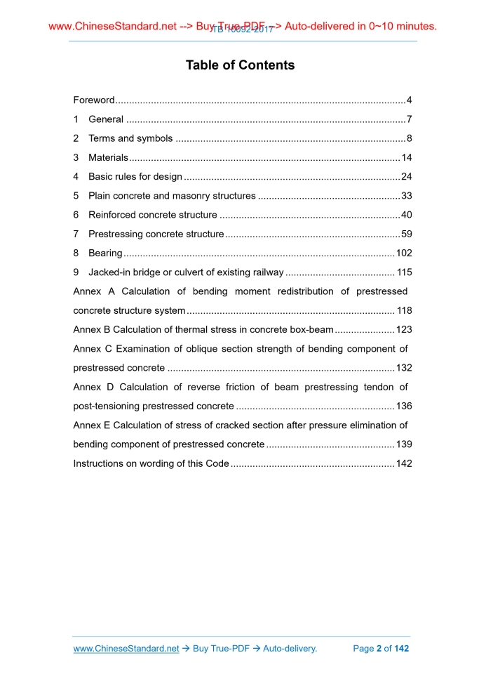 TB 10092-2017: Code for Design of Concrete Structures of Railway Bridge and Culvert---This is an excerpt. Full copy of true-PDF in English version (including equations, symbols, images, flow-chart, tables, and figures etc.), auto-downloaded/delivered in 9 seconds, can be purchased online: https://www.ChineseStandard.net/PDF.aspx/TB10092-2017TB INDUSTRIAL STANDARD OF THE PEOPLE’S REPUBLIC OF CHINA UDC J 462-2017 Code for Design of Concrete Structures of Railway Bridge and Culvert Issued on. JANUARY 2, 2017 Implemented on. MAY 1, 2017 Issued by. China Railway Administration Table of ContentsForeword... 4 1 General... 7 2 Terms and symbols... 8 3 Materials... 14 4 Basic rules for design... 24 5 Plain concrete and masonry structures... 33 6 Reinforced concrete structure... 40 7 Prestressing concrete structure... 59 8 Bearing... 102 9 Jacked-in bridge or culvert of existing railway... 115 Annex A Calculation of bending moment redistribution of prestressed concrete structure system... 118 Annex B Calculation of thermal stress in concrete box-beam... 123 Annex C Examination of oblique section strength of bending component of prestressed concrete... 132 Annex D Calculation of reverse friction of beam prestressing tendon of post-tensioning prestressed concrete... 136 Annex E Calculation of stress of cracked section after pressure elimination of bending component of prestressed concrete... 139 Instructions on wording of this Code... 142 INDUSTRIAL STANDARD OF THE PEOPLE’S REPUBLIC OF CHINA Code for Design of Concrete Structures of Railway Bridge and Culvert J 462-2017 Main drafting organization. China Railway Engineering Design Consulting Group Co., Ltd. Approved by. China Railway Administration Date of implementation. May 1, 20171 General1.0.1 This Code was formulated in order to unify the design standards for the concrete structures of railway bridges and culverts, make the design in conformity with the requirements of safety, reliability, advanced maturity and economy and application. 1.0.2 This Code applies to the design of masonry, plain concrete, reinforced concrete and pre-stressed concrete structures of railway bridges and culverts. 1.0.3 The design of concrete structures of railway bridge and culvert shall comply with relevant provisions of the existing “Code for Design on Steel Structure of Railway Bridge and Culvert” (TB 10002), “Code for seismic design of railway engineering” (GB 50111), “Code for durability design on concrete structure of railway” (TB 10005). 1.0.4 The strength, rigidity and stability of the bridge-culvert structure shall meet the requirements of track ride, train operation safety and passenger ride comfort. 1.0.5 The use life of bridge and culvert concrete structures design shall be 100 years. 1.0.6 The design of concrete structures of railway bridge and culvert shall, in addition to this Code, comply with the existing national mandatory standards.2 Terms and symbols2.1 Terms 2.1.1 concrete structure the structure made of concrete as the main building material, including plain concrete, reinforced concrete and prestressed concrete structures 2.2 Symbols 2.2.1 Material properties Ec - concrete elastic modulus3 Materials3.1 Concrete 3.1.1 Concrete strength levels may be C25, C30, C35, C40, C45, C50, C55 and C60. 3.1.2 The design strength of concrete shall meet the following requirements. 3.1.4 The permissible stress of concrete shall be in accordance with Table 3.1.4 and shall meet the following requirements. 3.1.5 The increase coefficient of local stress-bearing β value shall comply with the followings. 3.1.6 The compressive modulus Ec of concrete under compression or tension shall be taken according to Table 3.1.6.The shear deformation modulus of concrete, Gc, is to be taken as 0.43 times the value given in Table 3.1.6.Poisson's ratio of concrete can be 0.2. 3.3 Rebar 3.3.1 The ordinary rebar and prestressing tendon used for railway bridge and culvert concrete structure shall comply with the following provisions.4 Basic rules for design4.1 General 4.1.1 Fatigue stress calculation shall consider the dead load, design live load, vertical dynamic force and centrifugal force. The calculation of each load shall be in accordance with "Fundamental code for design on railway bridge and culvert" (TB 10002). 4.2 Calculation of slab 4.2.1 For the board freely supported around or fixedly supported, when the ratio of the length of the long side to the length of the short side is equal to or more than 2, it shall take the short side as span to calculate according to one-way slab, otherwise it shall be calculated according to two-way slab. 4.2.3 When calculating the slab with a stubble on the intermediate support, the effective height of the section along the support center shall be calculated according to the following equation, but not exceeding h1 + 1/3s. 4.3.2 The calculation width of T-section beam extended slab shall comply with the followings. 4.4 Rigid frame calculation 4.4.1 Rigid frame calculation shall comply with the followings. 4.4.3 The axis of the frame is the center of gravity line of the rod section. Except for the case of particularly large stems, the effect of the adverse effects can be disregarded. The length of the rigid frame axis shall be determined according to the followings. 4.5 Calculation of pier and abutment 4.5.1 Pier and abutment shall meet the strength and stability requirements. The calculation of pier and abutment shall comply with relevant provisions of existing “Code for Design on Steel Structure of Railway Bridge” (TB 10002). 4.6 Calculation of arch bridge 4.6.1 The calculation of arch bridge shall comply with relevant provisions of existing “Code for Design on Steel Structure of Railway Bridge” (TB 10002). 4.7 Calculation of culvert 4.7.1 The calculation of culvert shall comply with the relevant provisions of existing “Code for Design on Steel Structure of Railway Bridge” (TB 10002). 4.7.2 The calculation of post-co
