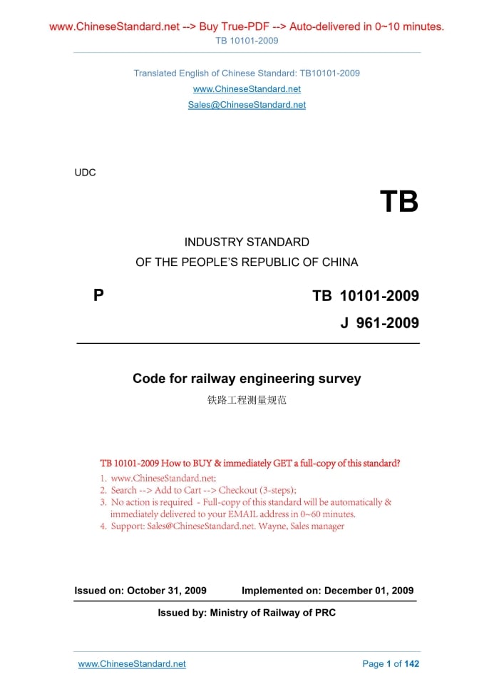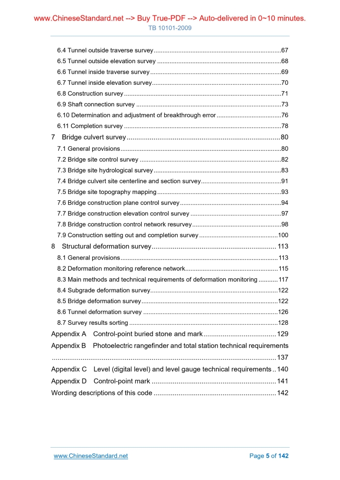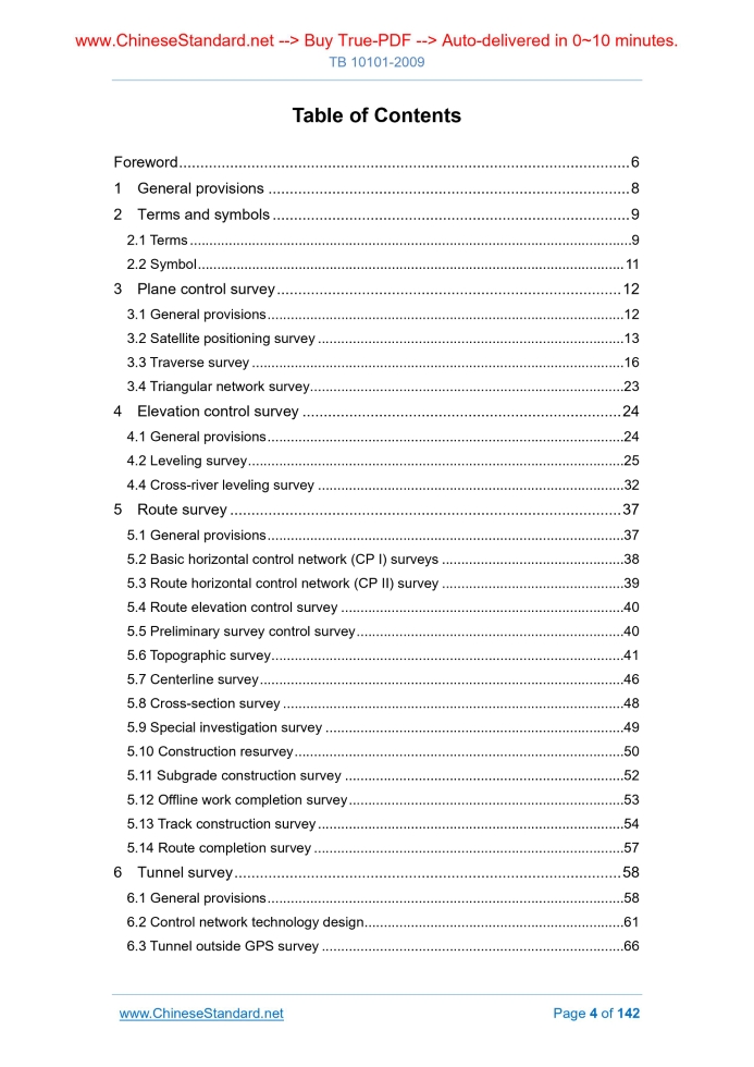 TB 10101-2009: Code for railway engineering survey---This is an excerpt. Full copy of true-PDF in English version (including equations, symbols, images, flow-chart, tables, and figures etc.), auto-downloaded/delivered in 9 seconds, can be purchased online: https://www.ChineseStandard.net/PDF.aspx/TB10101-2009UDC TB INDUSTRY STANDARD J 961-2009 Code for railway engineering survey Issued on: OCTOBER 31, 2009 Implemented on: DECEMBER 01, 2009 Issued by. Ministry of Railway of PRC 3.No action is required - Full-copy of this standard will be automatically & immediately delivered to your EMAIL address in 0~60 minutes. Table of ContentsForeword... 6 1 General provisions... 8 2 Terms and symbols... 9 2.1 Terms... 9 2.2 Symbol... 11 3 Plane control survey... 12 3.1 General provisions... 12 3.2 Satellite positioning survey... 13 3.3 Traverse survey... 16 3.4 Triangular network survey... 23 4 Elevation control survey... 24 4.1 General provisions... 24 4.2 Leveling survey... 25 4.4 Cross-river leveling survey... 32 5 Route survey... 37 5.1 General provisions... 37 5.2 Basic horizontal control network (CP I) surveys... 38 5.3 Route horizontal control network (CP II) survey... 39 5.4 Route elevation control survey... 40 5.5 Preliminary survey control survey... 40 5.6 Topographic survey... 41 5.7 Centerline survey... 46 5.8 Cross-section survey... 48 5.9 Special investigation survey... 49 5.10 Construction resurvey... 50 5.11 Subgrade construction survey... 52 5.12 Offline work completion survey... 53 5.13 Track construction survey... 54 5.14 Route completion survey... 57 6 Tunnel survey... 58 6.1 General provisions... 58 6.2 Control network technology design... 61 6.3 Tunnel outside GPS survey... 66 6.4 Tunnel outside traverse survey... 67 6.5 Tunnel outside elevation survey... 68 6.6 Tunnel inside traverse survey... 69 6.7 Tunnel inside elevation survey... 70 6.8 Construction survey... 71 6.9 Shaft connection survey... 73 6.10 Determination and adjustment of breakthrough error... 76 6.11 Completion survey... 78 7 Bridge culvert survey... 80 7.1 General provisions... 80 7.2 Bridge site control survey... 82 7.3 Bridge site hydrological survey... 83 7.4 Bridge culvert site centerline and section survey... 91 7.5 Bridge site topography mapping... 93 7.6 Bridge construction plane control survey... 94 7.7 Bridge construction elevation control survey... 97 7.8 Bridge construction control network resurvey... 98 7.9 Construction setting out and completion survey... 100 8 Structural deformation survey... 113 8.1 General provisions... 113 8.2 Deformation monitoring reference network... 115 8.3 Main methods and technical requirements of deformation monitoring... 117 8.4 Subgrade deformation survey... 122 8.5 Bridge deformation survey... 122 8.6 Tunnel deformation survey... 126 8.7 Survey results sorting... 128 Appendix A Control-point buried stone and mark... 129 Appendix B Photoelectric rangefinder and total station technical requirements ... 137 Appendix C Level (digital level) and level gauge technical requirements.. 140 Appendix D Control-point mark... 141 Wording descriptions of this code... 142ForewordThis standard is, based on the requirements of the "Notice on issuing the plan of compiling railway construction standards in 2005" (TJSH [2005] No.84) of the Ministry of Railways, revised from the “Code for new railway engineering survey” (TB 10101-99). To adapt to the development of the railway construction in China, the code name is changed to “Code for railway engineering survey” in accordance with the requirements of establishing railway engineering standards. In accordance with the requirements of railway construction and the development of surveying and mapping technology, this code starts from the requirements of survey, design, construction, operation and maintenance of railway engineering, and is based on the comprehensive summary of practical experience in railway engineering surveying, to assimilate the new technologies and new methods of railway engineering survey in recent years, while deleting some of the content which is not applicable. This specification is divided into eight chapters, the main contents include. general provisions, terms and symbols, plane control survey, elevation control survey, route survey, tunnel survey, bridge culvert survey, and structural deformation survey, and another four appendixes. The main content of this revision is as follows. 1.EMPHASIZE the importance of control surveying in railway engineering survey, ADD two chapters (plane control survey and elevation control survey), INCLUDE the main technical standards and requirements for control surveying of route, bridge, and tunnel into the chapters of plane and elevation control survey. 2.REFLECT the survey concept of “three networks combined into one” of railway engineering survey. The plane and elevation control network for railway engineering survey is divided into survey control network, construction control network, and operation and maintenance control network in accordance with the survey phase, the survey purpose and function. In order to ensure that the survey results of the control network meet the requirements of three phases (railway engineering survey, construction, and operation and maintenance), and to meet the needs of railway construction and operation and management, the plane and elevation control survey of the three phases must adopt a uniform scale and calculation baseline, namely “three networks combined in one”. 3.DETERMINE the laying principle of the grading network for railway engineering plane control survey. 4.PROPOSE that the railway engineering survey plane coordinate system shall be such that the projection length deformation value is not more than 25 mm/km. 5.CLARIFY the principle that the precision grade of railway engineering plane and elevation control survey shall be determined in accordance with the designed travel speed of passenger train. 6.CHANGE that the fixed