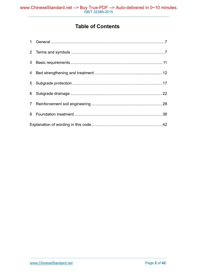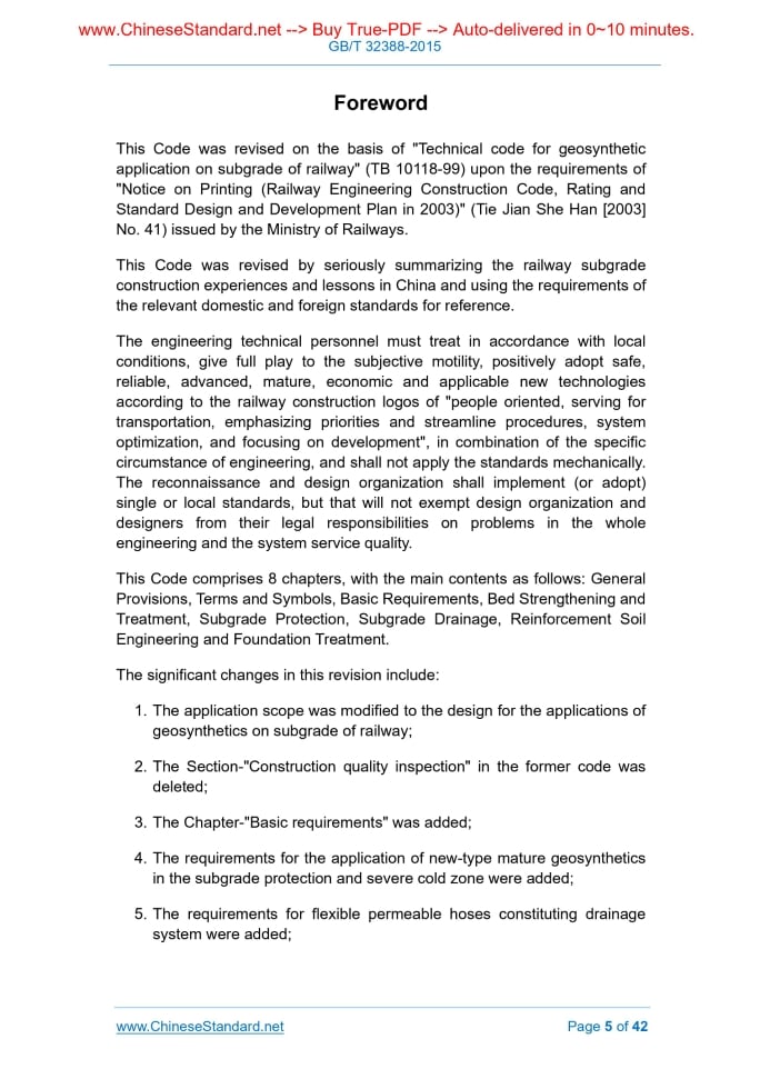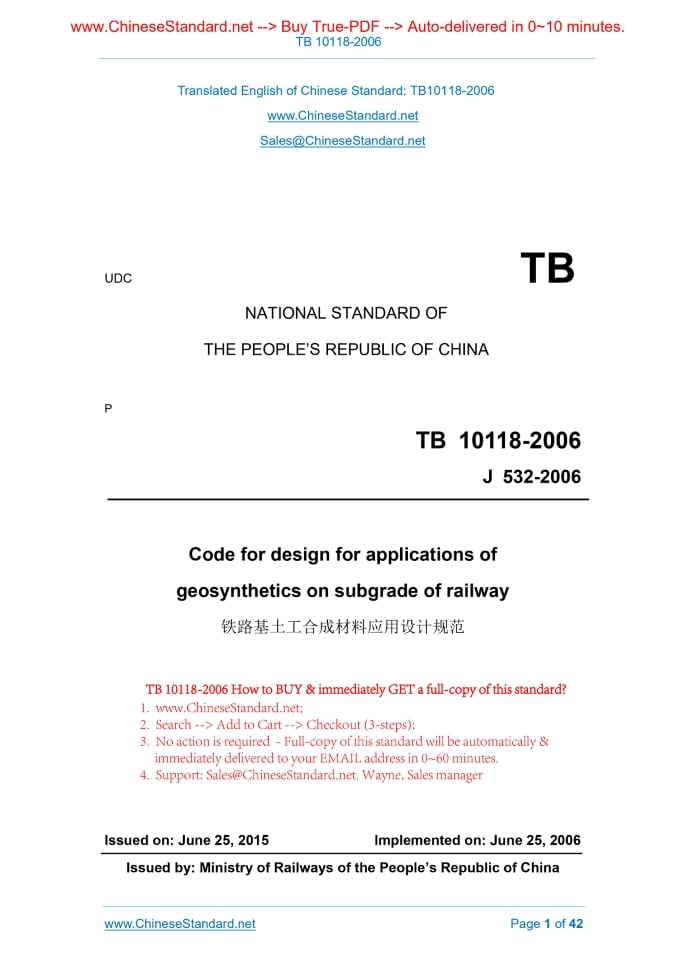 Similar standardsTB 10118-2006: Code for design for applications of geosynthetics on subgrade of railway---This is an excerpt. Full copy of true-PDF in English version (including equations, symbols, images, flow-chart, tables, and figures etc.), auto-downloaded/delivered in 9 seconds, can be purchased online: https://www.ChineseStandard.net/PDF.aspx/TB10118-2006UDC TB NATIONAL STANDARD OF THE PEOPLE’S REPUBLIC OF CHINA J 532-2006 Code for design for applications of geosynthetics on subgrade of railway Issued on. JUNE 25, 2015 Implemented on. JUNE 25, 2006 Issued by. Ministry of Railways of the People’s Republic of China Table of Contents1 General... 7 2 Terms and symbols... 7 3 Basic requirements... 11 4 Bed strengthening and treatment... 12 5 Subgrade protection... 17 6 Subgrade drainage... 22 7 Reinforcement soil engineering... 28 8 Foundation treatment... 36 Explanation of wording in this code... 42 NATIONAL STANDARD OF THE PEOPLE’S REPUBLIC OF CHINA Code for design for applications of geosynthetics on subgrade of railway J 532-2006 Main drafting organization of this Standard. The Fourth Survey and Design Institute of China Railway Implementation date. June 25, 2006 China Railway Publishing House Beijing 2006 Notice on Publishing "Code for design for applications of geosynthetics on subgrade of railway" Tie Jian She [2006] No. 117 "Code for design for applications of geosynthetics on subgrade of railway" (TB 10118-2006) is issued upon review (besides, the offprint is issued) and will be implemented from the issue date." Technical code for geosynthetic application on subgrade of railway" (TB 10118-99) shall be abolished simultaneously. Department of Construction and Management of the Ministry of Railways is in charge of the explanations of this standard. Authorized by the Technical Standard Institute for Railway Engineering, China Railway Publishing House organizes the publishing and issuing. The Ministry of Railways of the People's Republic of China June 25, 20061 General1.0.1 This Code is formulated with a view to standardizing the technical requirements for the application of geosynthetics on subgrade of railway, improving the engineering quality of subgrade of railway, and meeting the requirements of railway engineering construction. 1.0.2 This Code is applicable to the design for the applications of geosynthetics on subgrade of railway. 1.0.3 The applications of geosynthetics on subgrade of railway shall be designed according to the railway grade, structural type of subgrade, as well as geological, hydrological and meteorological conditions. The design shall comply with the principles of adaptation to local conditions, safety and reliability, economy and rationality, and integrated application with other engineering materials and measures. 1.0.4 The applications of geosynthetics on subgrade of railway shall not only comply with this Code, but also meet those specified in the relevant current compulsory standards of the state.2 Terms and symbols2.1 Terms 2.1.1 geosynthetics Generic term of the synthetic materials products applied in the geotechnical engineering 2.1.2 geotextile Permeable cloth geosynthetics made of polymer fibers as the raw material 2.1.3 woven geotextile Geotextile woven with fiber yarn or filament yarn along a certain direction 2.1.8 composite geodrain Geodrain made of geotextile wrapping the core materials of different shapes and materials 2.1.9 strip geodrain Vertical drain material made of plastic strip drain core materials in different shapes externally wrapped with nonwoven geotextile; strip geodrain is a kind of composite geodrain 2.1.10 special geosynthetic Geosynthetic made by special processes and with special purposes 2.1.15 geocell Three-dimensional geosynthetics products, with honeycomb structures, welded or assembled by the geosynthetics pieces 2.1.16 geomat Three-dimensional net-shaped geosynthetics made of thread-line synthetic materials through a certain process treatment and by fusing on the nodes 2.1.17 three-dimensional vegetation grids A kind of cell-shaped (similar to prismatic shape) vegetation geonet, made of plastic fiber through textile processing 2.1.18 expanded polystyrene Light-duty geomaterials made of polystyrene by expanding after added with foaming agent and through moulding or extrusion process 2.1.31 creep The phenomenon of material gradually increasing deformation with time under the action of constant force 2.2 Symbols A - Dimensionless coefficient irrelevant to the filler property Bs - Empirical coefficient relevant to the type and gradation of the protected3 Basic requirements3.0.1 The performance of geosynthetics shall meet the operating requirements and application conditions of railway subgrade engineering. 3.0.3 The allowable design tensile strength T of geosynthetics shall be calculated according to the following formula. 3.0.5 Geosynthetics shall be provided with the testing report of the testing organization authorized by the national competent department; they shall be provided with sign boards and marked with the trademark, product name, code, grade, specification, executive standard, manufacturer's name, production date, gross weight and net weight. 3.0.6 Attention shall be drawn to the frost protection, sun block, ventilation and drying during the transportation, storage and stacking of geosynthetics, which shall also be kept away from the high-temperature source. 3.0.7 State-of-the-art methods and processes shall be adopted during the construction of geosynthetics, which shall not be damaged.4 Bed strengthening and treatment4.1 General requirements 4.1.1 Geosynthetics may be adopted for the seepage prevention, filtration and drainage of constructed railway bed. 4.2 Design 4.2.1 The laying positions of geosynthetics and cushion layer arrangement shall meet the following requirements. 4.2.3 During the treatment for the existing railway subgrade bed problems, the geosynthetics shall be selected according to the