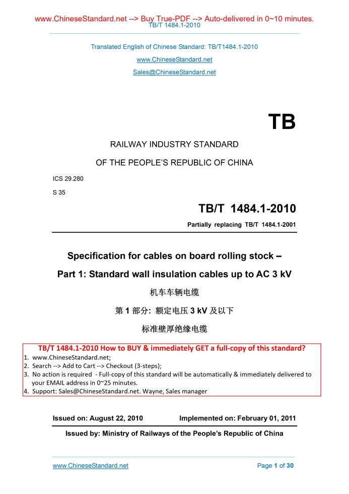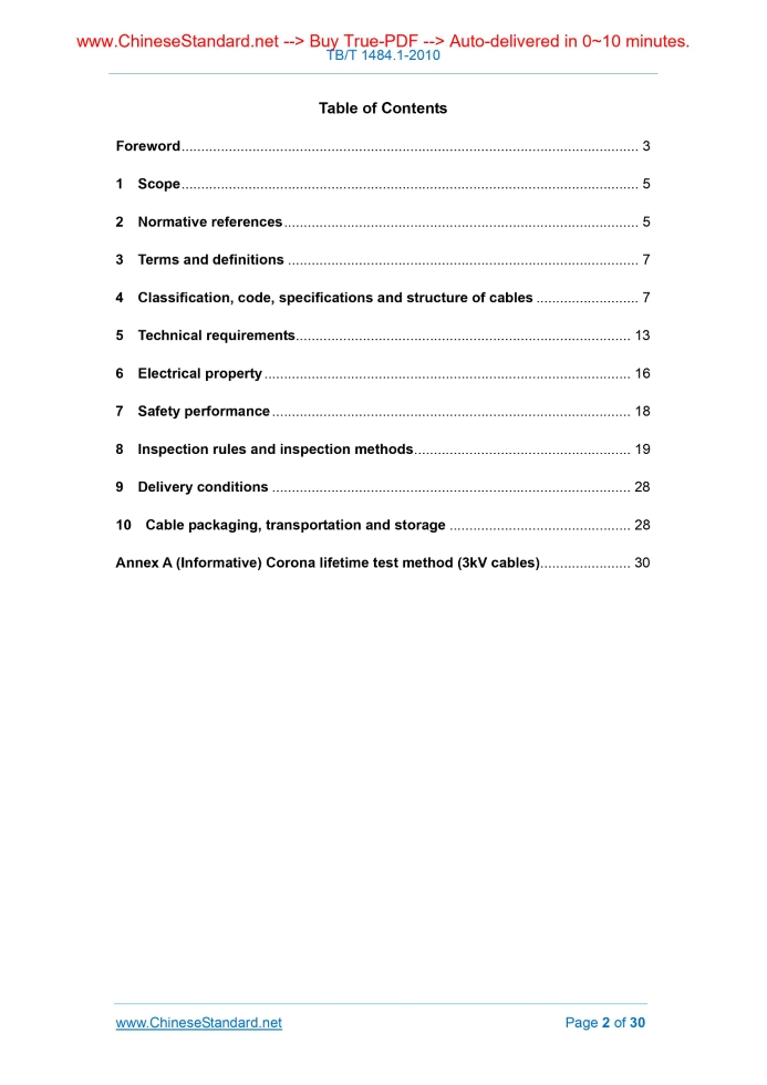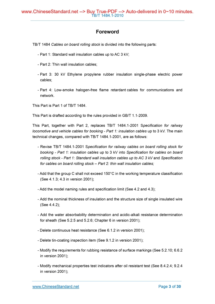 Similar standardsTB/T 1484.1-2010: Specification for cables on board rolling stock - Part 1: Standard wall insulation cables up to AC 3 kV---This is an excerpt. Full copy of true-PDF in English version (including equations, symbols, images, flow-chart, tables, and figures etc.), auto-downloaded/delivered in 9 seconds, can be purchased online: https://www.ChineseStandard.net/PDF.aspx/TBT1484.1-2010 TB RAILWAY INDUSTRY STANDARD ICS 29.280 S 35 Partially replacing TB/T 1484.1-2001 Specification for cables on board rolling stock – Part 1.Standard wall insulation cables up to AC 3 kV Issued on: AUGUST 22, 2010 Implemented on: FEBRUARY 01, 2011 Issued by. Ministry of Railways of the People’s Republic of China Table of ContentsForeword... 3 1 Scope... 5 2 Normative references... 5 3 Terms and definitions... 7 4 Classification, code, specifications and structure of cables... 7 5 Technical requirements... 13 6 Electrical property... 16 7 Safety performance... 18 8 Inspection rules and inspection methods... 19 9 Delivery conditions... 28 10 Cable packaging, transportation and storage... 28 Annex A (Informative) Corona lifetime test method (3kV cables)... 30ForewordTB/T 1484 Cables on board rolling stock is divided into the following parts. - Part 1.Standard wall insulation cables up to AC 3 kV; - Part 2.Thin wall insulation cables; - Part 3.30 kV Ethylene propylene rubber insulation single-phase electric power cables; - Part 4.Low-smoke halogen-free flame retardant cables for communications and network. This Part is Part 1 of TB/T 1484. This Part is drafted according to the rules provided in GB/T 1.1-2009. This Part, together with Part 2, replaces TB/T 1484.1-2001 Specification for railway locomotive and vehicle cables for booking - Part 1.insulation cables up to 3 kV. The main technical changes, compared with TB/T 1484.1-2001, are as follows. - Revise TB/T 1484.1-2001 Specification for railway cables on board rolling stock for booking - Part 1.insulation cables up to 3 kV into Specification for cables on board rolling stock - Part 1.Standard wall insulation cables up to AC 3 kV and Specification for cables on board rolling stock – Part 2.thin wall insulation cables; - Add that the group C shall not exceed 150°C in the working temperature classification (See 4.1.3; 4.3 in version 2001); - Add the model naming rules and specification limit (See 4.2 and 4.3); - Add the nominal thickness of insulation and the structure size of single insulated wire (See 4.4.2); - Add the water absorbability determination and acidic-alkali resistance determination for sheath (See 5.2.5 and 5.2.6; Chapter 6 in version 2001); - Delete continuous heat resistance (See 6.1.2 in version 2001); - Delete tin-coating inspection item (See 9.1.2 in version 2001); - Modify the requirements for rubbing resistance of surface markings (See 5.2.10; 6.6.2 in version 2001); - Modify mechanical properties test indicators after oil resistant test (See 8.4.2.4; 9.2.4 in version 2001); Specification for cables on board rolling stock – Part 1.Standard wall insulation cables up to AC 3 kV1 ScopeThis Part specified the technical requirements, test methods and inspection rules of standard wall insulation cables up to AC 3 kV for cables on board rolling stock (including CRH train). This Part applies to board rolling stocks (including CRH train); other rolling stocks can refer to this Part.2 Normative referencesThe following documents are indispensable for application of this document. For the dated documents so quoted, only the dated versions apply to this document. For the undated documents so quoted, the latest versions (including all modification sheets) apply to this document. GB 252-2000 Light diesel fuels GB/T 2900.10-2001 Electrotechnical vocabulary - Electric cables (IEC 60050-461.1984, IDT) GB/T 2951.11-2008 Common test methods for insulating and sheathing materials of electric and optical cables - Part 11.Methods for general application - Measurement of thickness and overall dimensions - Tests for determining the mechanical properties (IEC 60811-1-1.2001, IDT) GB/T 2951.12-2008 Common test methods for insulating and sheathing materials of electric and optical cables - Part 12.Methods for general application - Thermal ageing methods (IEC 60811-1-2.1985, IDT) GB/T 2951.13-2008 Common test methods for insulating and sheathing materials of electric and optical cables - Part 13.Methods for general application - Measurement for determining the density - Water absorption tests - Shrinkage test (IEC 60811-1-3.2001, IDT) GB/T 2951.14-2008 Common test methods for insulating and sheathing materials of electric and optical cables - Part 14.Methods for general application - Test at low temperature (IEC 60811-1-4.1985, IDT) GB/T 2951.21-2008 Common test methods for insulating and sheathing materials of electric and optical cables - Part 21.Methods specific to elastomeric compounds - Ozone resistance, hot set and mineral oil immersion tests (IEC 60811-2-1.2001, IDT) GB/T 3048.4-2007 Test methods for electrical properties of electric cables and wires - Part 4.Test of DC resistance of conductors GB/T 3048.5-2007 Test methods for electrical properties of electric cables and wires - Part 5.Test of insulation resistance GB/T 3048.8-2007 Test methods for electrical properties of electric cables and wires - Part 8.AC voltage test GB/T 3048.9-2007 Test methods for electrical properties of electric cables and wires - Part 9.Spark test of insulated cores GB/T 3956-2008 Conductors of insulated cables (IEC 60228.2004, IDT) GB/T 4909.2-2009 Test methods for bare wires - Part 2.Measurement of dimensions GB/T 4909.3-2009 Test methods for bare wires - Part 3.Tensile test GB/T4909.11-2009 Test methods for bare wires - Part 11.Test for adherence of coating GB/T 4910-2009 Tinned round copper wire GB/T 6995 Markings for electric wires and cables GB/T 12528-2008 Rail vehicle cables with rated voltages up to and including 3kV GB/T 17650.1-1998 Test on gases evol
