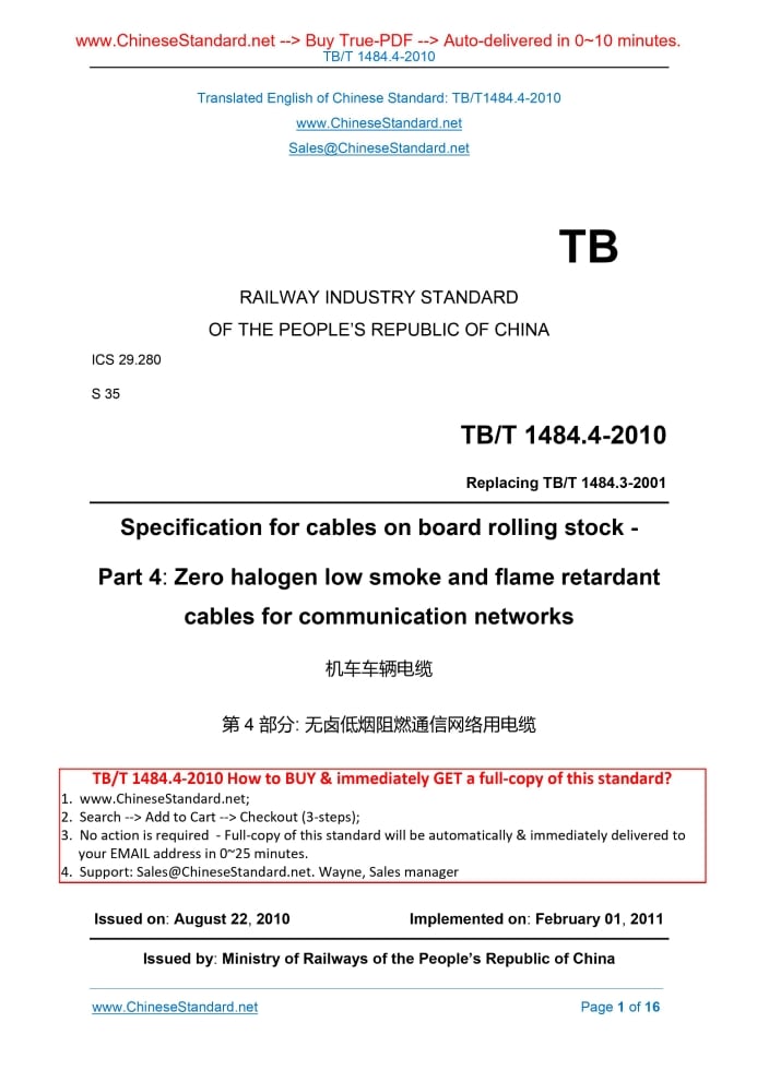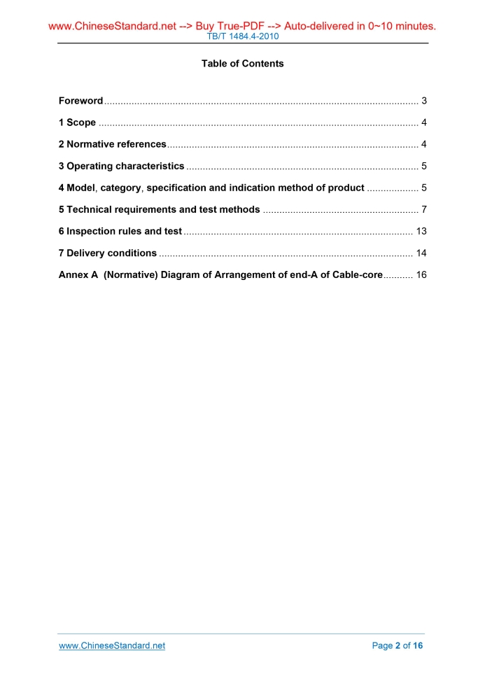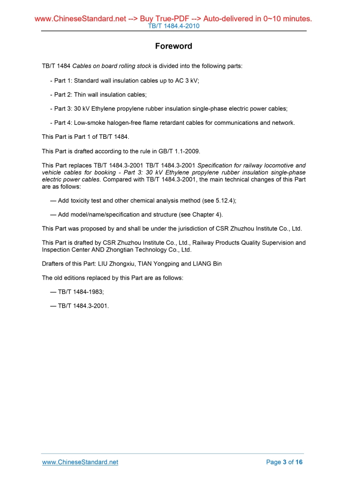 Similar standardsTB/T 1484.4-2010: Specification for cables on board rolling stock - Part 4: Zero halogen low smoke and flame retardant cables for communication networks---This is an excerpt. Full copy of true-PDF in English version (including equations, symbols, images, flow-chart, tables, and figures etc.), auto-downloaded/delivered in 9 seconds, can be purchased online: https://www.ChineseStandard.net/PDF.aspx/TBT1484.4-2010 TB RAILWAY INDUSTRY STANDARD OF THE PEOPLE’S REPUBLIC OF CHINA ICS 29.280 S 35 Replacing TB/T 1484.3-2001 Specification for cables on board rolling stock - Part 4. Zero halogen low smoke and flame retardant cables for communication networks Issued on: AUGUST 22, 2010 Implemented on: FEBRUARY 01, 2011 Issued by. Ministry of Railways of the People’s Republic of China Table of ContentsForeword ... 3 1 Scope ... 4 2 Normative references ... 4 3 Operating characteristics ... 5 4 Model, category, specification and indication method of product ... 5 5 Technical requirements and test methods ... 7 6 Inspection rules and test ... 13 7 Delivery conditions ... 14 Annex A (Normative) Diagram of Arrangement of end-A of Cable-core ... 16ForewordTB/T 1484 Cables on board rolling stock is divided into the following parts. - Part 1. Standard wall insulation cables up to AC 3 kV; - Part 2. Thin wall insulation cables; - Part 3. 30 kV Ethylene propylene rubber insulation single-phase electric power cables; - Part 4. Low-smoke halogen-free flame retardant cables for communications and network. This Part is Part 1 of TB/T 1484. This Part is drafted according to the rule in GB/T 1.1-2009. This Part replaces TB/T 1484.3-2001 TB/T 1484.3-2001 Specification for railway locomotive and vehicle cables for booking - Part 3. 30 kV Ethylene propylene rubber insulation single-phase electric power cables. Compared with TB/T 1484.3-2001, the main technical changes of this Part are as follows. — Add toxicity test and other chemical analysis method (see 5.12.4); — Add model/name/specification and structure (see Chapter 4). This Part was proposed by and shall be under the jurisdiction of CSR Zhuzhou Institute Co., Ltd. This Part is drafted by CSR Zhuzhou Institute Co., Ltd., Railway Products Quality Supervision and Inspection Center AND Zhongtian Technology Co., Ltd. Drafters of this Part. LIU Zhongxiu, TIAN Yongping and LIANG Bin The old editions replaced by this Part are as follows. — TB/T 1484-1983; — TB/T 1484.3-2001. Specification for Cables on Board Rolling Stock – Part 4. Zero Halogen Low Smoke and Flame Retardant Cables for Communication Networks1 ScopeThis Part specifies the structure, technical requirements, test methods and inspection rules of cables for communication networks on board rolling stock (including CRH train). The products that this Part specifies are applicable to rolling stock (including CRH train), and also applicable to the data transmission between other railway vehicles.2 Normative referencesThe following documents are indispensable for application of this document. For the dated documents so quoted, only the dated versions apply to this document. For the undated documents so quoted, the latest versions (including all modification sheets) apply to this document. GB/T 2951.1-1997 Common test methods for insulating and sheathing materials of electric cables Part 1. Methods for general application Section one. Measurement of thickness and overall dimensions - Tests for determining the mechanical properties (idt IEC60811-1-1.1993) GB/T 2951.2-1997 Common test methods for insulating and sheathing materials of electric cables - Part 1. Methods for general application - Section two. Thermal ageing methods (idt IEC 60811-1-2.1985) GB/T 2951.3-1997 Common test methods for insulating and sheathing materials of electric cable - Part 1. Methods for general application - Section three. Methods for determining the density - Water absorption tests - Shrinkage test (idt IEC 60811-1-3.1993) GB/T 2951.4-1997 Common test methods for insulating and sheathing materials of electric cables - Part 1. Methods for general application (idt IEC 60811-1-4.1985) GB/T 3048.8 Test methods for electrical properties of electric cables and wires - Part 8. AC voltage test GB/T 3048.9 Test methods for electrical properties of electric cables and wires - Part 9. Spark test of insulated cores GB/T 4909.3 Test methods for bare wires - Part 3. Tensile test GB/T 4910-2009 Tinned round copper wire GB/T 6995.2 Markings for electric wires and cables - Part 2. Standard colours GB/T 8969 Air quality - Determination of nitrogen oxides in ambient air - Griess-saltzman method GB/T 8970 Air quality - Determination of sulfur dioxide in a ambient air - Tetrachlomercurate (TCM), pararosaniline GB/T 16033 Workplace air - Determination of hydrogen cyanide and cyanides - Sodium isonicotinate-sodium barbiturate spectrophotometric method GB/T 17650.2-1998 Test on gases evolved during combustion of materials from cables - Part 2. Determination of degree of acidity of gases by measuring pH and conductivity (idt IEC 60754- 2.1991) GB/T 17651.1-1998 Measurement of smoke density of cables burning under defined conditions - Part 1. Test apparatus (idt IEC 61034-1.1997) GB/T 17651.2-1998 Measurement of smoke density of cables burning under defined conditions - Part 2. Test procedure and requirements (idt IEC 61034-2.1997) GB/T 18015-2007 Multicore and symmetrical pair/quad cables for digital communications GB/T 18204.23 Methods for determination of carbon monoxide in air - Gas chromatographic method GBIT 18204.24 Methods for determination of carbon dioxide in air - Gas chromatographic method GB/T 19666-2005 Flame retardant and fire resistant wires and cables General JB/T 8137 Delivery drums for wires and cables IEC 60189-1 Low-frequency cables and wires with PVC insulation and PVC sheath - Part 1. General test and measuring methods IEC 60708 Low-frequency cables with polyolefin insulation and moisture barrier polyolefin sh