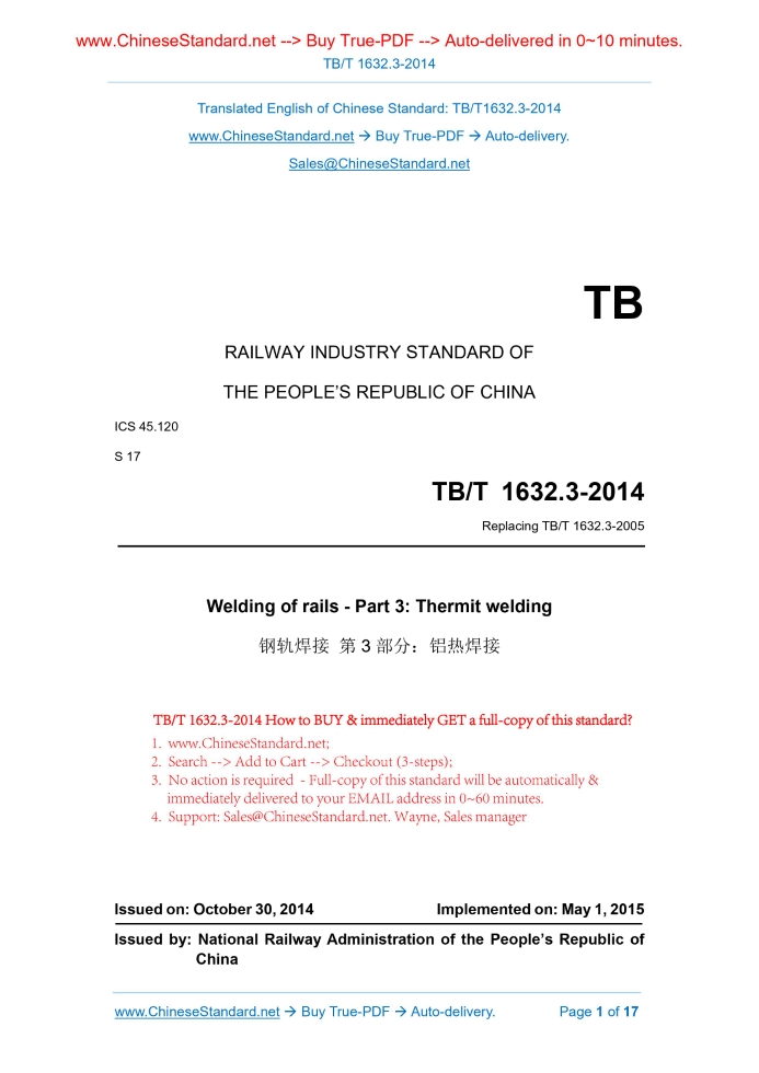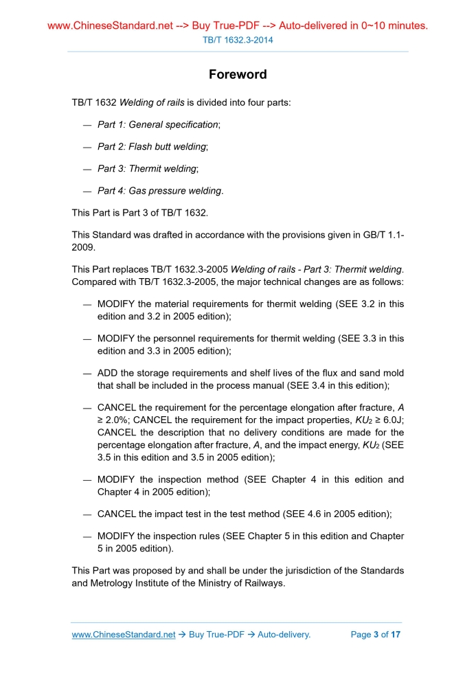 TB/T 1632.3-2014: Welding of rails - Part 3: Thermit welding Delivery: 9 seconds. True-PDF full-copy in English & invoice will be downloaded + auto-delivered via email. See step-by-step procedure Status: Obsolete TB/T 1632.3: Historical versions