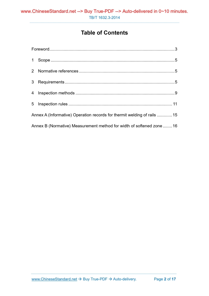 Similar standardsTB/T 1632.3-2014: Welding of rails - Part 3: Thermit welding---This is an excerpt. Full copy of true-PDF in English version (including equations, symbols, images, flow-chart, tables, and figures etc.), auto-downloaded/delivered in 9 seconds, can be purchased online: https://www.ChineseStandard.net/PDF.aspx/TBT1632.3-2014TB RAILWAY INDUSTRY STANDARD OF THE PEOPLE’S REPUBLIC OF CHINA ICS 45.120 S 17 Replacing TB/T 1632.3-2005 Welding of rails - Part 3.Thermit welding Issued on: OCTOBER 30, 2014 Implemented on: MAY 1, 2015 Issued by. National Railway Administration of the People’s Republic of China Table of ContentsForeword... 3 1 Scope... 5 2 Normative references... 5 3 Requirements... 5 4 Inspection methods... 9 5 Inspection rules... 11 Annex A (Informative) Operation records for thermit welding of rails... 15 Annex B (Normative) Measurement method for width of softened zone... 16ForewordTB/T 1632 Welding of rails is divided into four parts. — Part 1.General specification; — Part 2.Flash butt welding; — Part 3.Thermit welding; — Part 4.Gas pressure welding. This Part is Part 3 of TB/T 1632. This Standard was drafted in accordance with the provisions given in GB/T 1.1- 2009. This Part replaces TB/T 1632.3-2005 Welding of rails - Part 3.Thermit welding. Compared with TB/T 1632.3-2005, the major technical changes are as follows. — MODIFY the material requirements for thermit welding (SEE 3.2 in this edition and 3.2 in 2005 edition); — MODIFY the personnel requirements for thermit welding (SEE 3.3 in this edition and 3.3 in 2005 edition); — ADD the storage requirements and shelf lives of the flux and sand mold that shall be included in the process manual (SEE 3.4 in this edition); — CANCEL the requirement for the percentage elongation after fracture, A ≥ 2.0%; CANCEL the requirement for the impact properties, KU2 ≥ 6.0J; CANCEL the description that no delivery conditions are made for the percentage elongation after fracture, A, and the impact energy, KU2 (SEE 3.5 in this edition and 3.5 in 2005 edition); — MODIFY the inspection method (SEE Chapter 4 in this edition and Chapter 4 in 2005 edition); — CANCEL the impact test in the test method (SEE 4.6 in 2005 edition); — MODIFY the inspection rules (SEE Chapter 5 in this edition and Chapter 5 in 2005 edition). This Part was proposed by and shall be under the jurisdiction of the Standards and Metrology Institute of the Ministry of Railways. Welding of rails - Part 3.Thermit welding1 ScopeThis Part of TB/T 1632 specifies the requirements, inspection methods and inspection rules for the thermit welding of rails. This Part is applicable to the thermit welding of 50 kg/m ~ 75 kg/m rails.2 Normative referencesThe following documents are essential to the application of this document. For dated references, only the editions with the dates indicated are applicable to this document. For undated references, only the latest editions (including all the amendments) are applicable to this document. GB/T 230.1-2009 Metallic materials - Rockwell hardness test - Part 1.Test method (scales A, B, C, D, E, F, G, H, K, N, T) GB/T 231.1-2009 Metallic materials - Brinell hardness test - Part 1.Test method GB/T 4340.1-2009 Metallic materials - Vickers hardness test - Part 1.Test method GB/T 8170 Rules of rounding off for numerical values & expression and judgement of limiting values GB/T 13298 Inspection methods of microstructure for metals TB/T 1632.1-2014 Welding of rails - Part 1.General specification TB/T 3322-2013 Alumino-thermic welding consumables for rail3 Requirements3.1 Welding rail requirements The new rails for thermit welding shall meet the requirements of Chapter 4 in TB/T 1632.1-2014. 3.2 Welding material requirements The materials for thermit welding of rails shall meet the requirements of TB/T 3322-2013. 3.3 Personnel requirements Each welding operator shall hold a job training certificate issued by the technical institution approved by the railway authority. 3.4 Process requirements 3.4.1 Welding process 3.4.1.1 The thermit welding process shall be implemented according to the process manual provided by the supplier. 3.4.1.2 The supplier shall specify the required equipment, consumable materials and detailed method of operation in the manual. The following contents shall also be included. a) number of main operators; b) instructions for welding equipment; c) flux corresponding to the rails of different grades and models; d) preparation of rail ends and rail gap size; e) detailed preheating parameters; f) time range from the ignition of the flux to the casting of the molten steel; g) the temperature at which the train is allowed to pass the welded joint; h) requirements for welding environment (such as temperature, humidity, wind power, etc.); i) storage requirements and shelf lives of the flux and sand mold; j) safety precautions. 3.4.2 Welding records Welding operators shall document the welding process. REFER to Annex A for the records. Records shall be retained for an overhaul period. 3.4.3 Joint marking The welded joints (finished products) of each rail shall be marked. The markings shall be 1m to 3m away from the welds. In addition, the markings shall be clear, upright and identifiable for at least 5 years (or 1 overhaul cycle). The marking method shall ensure that the welded joints (finished products) of each rail are traceable based on the operation records. 3.5 Quality requirements4 Inspection methods4.1 Appearance inspection The methods for inspecting the flatness and surface quality shall meet the requirements of Chapter 7 in TB/T 1632.1-2014. 4.2 Flaw detection The flaw detection methods shall meet the requirements of Chapter 8 in TB/T 1632.1-2014. 4.3 Static bending test The specimen requirements and test methods shall meet the requirements of Chapter 10 in TB/T 1632.1-2014.The connector shall be loaded until it breaks. 4.4 Fatigue test The specimen requirements and test methods shall meet the 