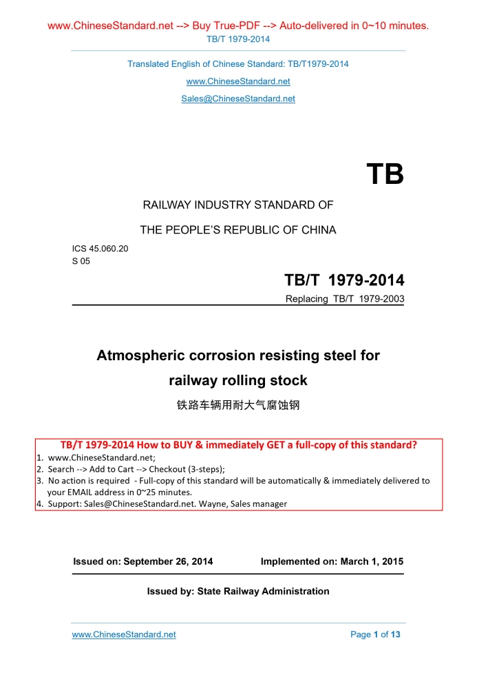 TB/T 1979-2014: Atmospheric corrosion resisting steel for railway rolling stock Delivery: 9 seconds. True-PDF full-copy in English & invoice will be downloaded + auto-delivered via email. See step-by-step procedure Status: Obsolete TB/T 1979: Historical versions