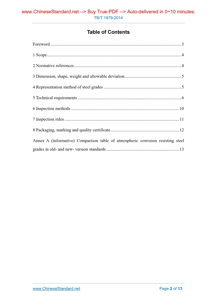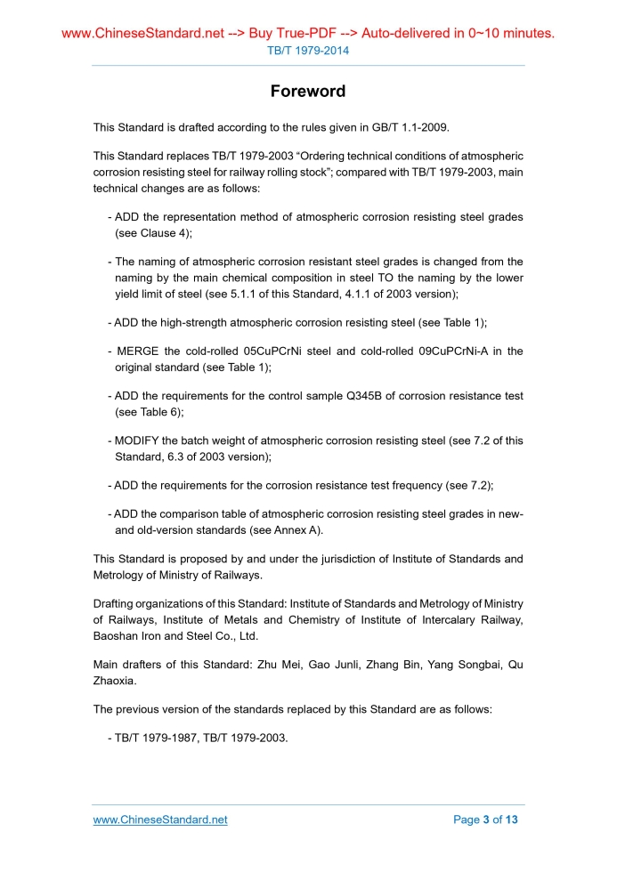 Similar standardsTB/T 1979-2014: Atmospheric corrosion resisting steel for railway rolling stock---This is an excerpt. Full copy of true-PDF in English version (including equations, symbols, images, flow-chart, tables, and figures etc.), auto-downloaded/delivered in 9 seconds, can be purchased online: https://www.ChineseStandard.net/PDF.aspx/TBT1979-2014TB RAILWAY INDUSTRY STANDARD OF THE PEOPLE’S REPUBLIC OF CHINA ICS 45.060.20 S 05 Replacing TB/T 1979-2003 Atmospheric corrosion resisting steel for railway rolling stock Issued on: SEPTEMBER 26, 2014 Implemented on: MARCH 1, 2015 Issued by. State Railway Administration Table of ContentsForeword... 3 1 Scope... 4 2 Normative references... 4 3 Dimension, shape, weight and allowable deviation... 5 4 Representation method of steel grades... 5 5 Technical requirements... 6 6 Inspection methods... 10 7 Inspection rules... 11 8 Packaging, marking and quality certificate... 12 Annex A (informative) Comparison table of atmospheric corrosion resisting steel grades in old- and new- version standards... 13ForewordThis Standard is drafted according to the rules given in GB/T 1.1-2009. This Standard replaces TB/T 1979-2003 “Ordering technical conditions of atmospheric corrosion resisting steel for railway rolling stock”; compared with TB/T 1979-2003, main technical changes are as follows. - ADD the representation method of atmospheric corrosion resisting steel grades (see Clause 4); - The naming of atmospheric corrosion resistant steel grades is changed from the naming by the main chemical composition in steel TO the naming by the lower yield limit of steel (see 5.1.1 of this Standard, 4.1.1 of 2003 version); - ADD the high-strength atmospheric corrosion resisting steel (see Table 1); - MERGE the cold-rolled 05CuPCrNi steel and cold-rolled 09CuPCrNi-A in the original standard (see Table 1); - ADD the requirements for the control sample Q345B of corrosion resistance test (see Table 6); - MODIFY the batch weight of atmospheric corrosion resisting steel (see 7.2 of this Standard, 6.3 of 2003 version); - ADD the requirements for the corrosion resistance test frequency (see 7.2); - ADD the comparison table of atmospheric corrosion resisting steel grades in new- and old-version standards (see Annex A). This Standard is proposed by and under the jurisdiction of Institute of Standards and Metrology of Ministry of Railways. Drafting organizations of this Standard. Institute of Standards and Metrology of Ministry of Railways, Institute of Metals and Chemistry of Institute of Intercalary Railway, Baoshan Iron and Steel Co., Ltd. Main drafters of this Standard. Zhu Mei, Gao Junli, Zhang Bin, Yang Songbai, Qu Zhaoxia. The previous version of the standards replaced by this Standard are as follows. - TB/T 1979-1987, TB/T 1979-2003. Atmospheric corrosion resisting steel for railway rolling stock1 ScopeThis Standard specifies the dimension, shape, weight and allowable deviation, representation method of steel grades, technical requirements, inspection methods, inspection rules, packaging, marking and quality certificates of atmospheric corrosion resisting steel for railway rolling stock. This Standard applies hot-rolled and cold-rolled steel sheet, plate and strip and structural steel of atmospheric corrosion resisting steel for railway rolling stock.2 Normative referencesThe following documents are indispensable for the application of this document. For dated references, only the dated edition applies to this document. For undated references, the latest edition (including all amendments) applies to this document. GB/T 222 Permissible tolerances for chemical composition of steel products GB/T 223 Methods for chemical analysis of iron, steel and alloy GB/T 228.1 Metallic materials - Tensile testing - Part 1.Method of test at room temperature GB/T 229 Metallic materials - Charpy pendulum impact test method GB/T 232 Metallic materials - Bend test GB/T 247 General rule of package mark and certification for steel plates (sheets) and strips GB/T 706 Hot rolled section steel GB/T 708 Dimension shape weight and tolerance for cold-rolled steel plates and sheets GB/T 709 Dimension, shape, weight and tolerances for hot-rolled steel plates and sheets GB/T 2101 General requirement of acceptance packaging marking and certification for section steel GB/T 2975 Steel and steel products - Location and preparation of test pieces for mechanical testing GB/T 4336 Carbon and low-alloy steel - Determination of multi-element contents - Spark discharge atomic emission spectrometric method (routine method) GB/T 6394 Metal - Methods for estimating the average grain size GB/T 10561 Steel - Determination of content of nonmetallic inclusions - Micrographic method using standards diagrams GB/T 17505 Steel and steel products - General technical delivery requirements GB/T 20066 Steel and iron - Sampling and preparation of samples for the determination of chemical composition GB/T 20125 Low-alloy steel - Determination of multi-element contents - Inductively coupled plasma atomic emission spectrometric method TB/T 2375 Test method for cyclic wetting corrosion of weathering steels for railway applications3 Dimension, shape, weight and allowable deviation3.1 The dimension, shape, weight and allowable deviation of steel plates, sheets and strips shall comply with the relevant specifications of GB/T 709, GB/T 708. 3.2 The dimension, shape, weight and allowable deviation of hot-rolled steels shall comply with the relevant specifications of GB/T 706; the dimension, shape, weight and allowable deviation of cold-formed steels shall comply with the corresponding product specifications.4 Representation method of steel gradesThe steel grade consists of the lower yield strength code, lower yield strength limit value, atmospheric corrosion resisting steel code, delivery state code and steel category, the specific structure is as follows. 0.55 3.50 0.65 Q400NQR1 ≤ 0.12 ≤ 0.75 ≤ 1.10 ≤ 0.025 ≤ 0.008 0