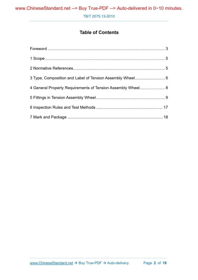 Similar standardsTB/T 2075.13-2010: Fittings for overhead contact system in electrification railway. Part 13: Tension assembly wheel---This is an excerpt. Full copy of true-PDF in English version (including equations, symbols, images, flow-chart, tables, and figures etc.), auto-downloaded/delivered in 9 seconds, can be purchased online: https://www.ChineseStandard.net/PDF.aspx/TBT2075.13-2010 RAILWAY INDUSTRY STANDARD OF THE PEOPLE’S REPUBLIC OF CHINA ICS 29.280 S 82 Replacing TB/T 2075.38-2002 Fittings for Overhead Contact System in Electrification Railway - Part 13.Tension Assembly Wheel Issued on: JUNE 09, 2010 Implemented on: DECEMBER 01, 2010 Issued by. Ministry of Railways of the PRC Table of ContentsForeword... 3 1 Scope... 5 2 Normative References... 5 3 Type, Composition and Label of Tension Assembly Wheel... 6 4 General Property Requirements of Tension Assembly Wheel... 8 5 Fittings in Tension Assembly Wheel... 9 6 Inspection Rules and Test Methods... 17 7 Mark and Package... 18 Fittings for Overhead Contact System in Electrification Railway - Part 13.Tension Assembly Wheel1 ScopeThis Part specifies the type, composition, label, material, technical requirements, inspection rules, test methods, mark and package of the tension assembly wheel. This Part is applicable to the tension assembly wheel of fittings for overhead contact system in electrification railway.2 Normative ReferencesThe provisions in following documents become the provisions of this Part through reference in this Part of TB/T 2075.For dated references, the subsequent amendments (excluding corrigendum) or revisions do not apply to this Standard, however, parties who reach an agreement based on this Standard are encouraged to study if the latest versions of these documents are applicable. For undated references, the latest edition of the referenced document applies. GB/T 31.1-1988 Hexagon Bolts with Split Pin Hole on Shank - Product Grade A and B GB/T 41-2000 Hexagon Nuts-Product Grade C (eqv ISO 4034.1999) GB/T 95-2002 Plain Washers – Product Grade C (ISO 7091.2000, EQV) GB/T 68-2000 Slotted Countersunk Flat Head Screws (eqv ISO 2009.1994) GB/T 91-2000 Split Pins (eqv ISO 1234.1997) GB/T 97.1-2002 Plain Washers – Product Grade A (eqv ISO 7089.2000) GB/T 196-2003 General Purpose Metric Screw Threads - Basic Dimensions (ISO 724.1993, MOD) GB/T 283-2007 Rolling Bearings - Cylindrical Roller Bearings - Boundary Dimensions GB/T 699-1999 Quality Carbon Structural Steels GB/T 700-2006 Carbon Structural Steels (ISO 630.1995, NEQ) 5.1.3 Label example of ratchet-wheel Example. Marking for the wheel body of Type-Z tension assembly wheel is as follows. Type-Z tension assembly wheel body TB/T 2075.13(Z)–10 5.1.4 Ratchet-wheel materials 5.1.4.1 The ratchet-wheel body and end cover shall, according to GB/T 1173-1995, adopt high-quality cast aluminum-magnesium-silicon alloy (ZA1Si7Mg1A) with code of ZLl14A; the alloy use T5 (solid solution treatment and incomplete artificial aging) treatment; the tensile strength σb ≥290MPa, elongation σ5 ≥ 2%. 5.1.4.2 The ratchet-wheel shaft shall, according to GB/T 699-1999, adopt high-quality carbon structural steel with designation of No.45; and shall be quenched and tempered. 5.1.4.3 The bearing shall conform to GB/T 283-2007; adopt the inner ring single rib cylindrical roller bearing with designation of NJ2305E. The connection between ratchet-wheel shaft and the ratchet-wheel body shall be double bearing structure. 5.1.4.4 The wedge and balance wheel body shall, according to GB/T 11352-2009, adopt the cast carbon steel with designation of ZG 270-500. 5.1.4.5 Pin, countersunk head screw, and oil-filling screw are all in accordance with GB/T 1220-2007.Pin adopts austenitic stainless steel with designation of 06Cr19Ni10; the rest all adopts the austenitic stainless steel with designation of 12Cr18Ni9. 5.1.4.6 Fastener (bolt, nut, washer) that adopts austenitic stainless steel, where the mechanical properties of bolt and nut shall meet the following requirements with tensile strength σb ≥700MPa, non-proportional elongation σp0.2 ≥450MPa, elongation after break δ ≥0.4d. 5.1.4.7 The ratchet-wheel connecting frame shall, according to GB/T 700-2006, adopt the carbon structural steel with designation of Q235A. 5.1.5 Technical requirements of ratchet-wheel 5.1.5.1 The general technical requirements of ratchet-wheel shall conform to the provisions of TB/T 2073. 5.1.5.2 The requirements for manufacturing process of ratchet-wheel is as follow. a) The ratchet-wheel body and end cover are manufactured by metal mold low- pressure casting process; its casting state is JB (metal mold casting + modification treatment). b) The ratchet-wheel body has no casting defects; the grooves of wheel body are Figure 4 – Schematic Diagram for Appearance Structure of Ratchet-Wheel Bracket 5.3.2 Reference weight of ratchet-wheel bracket Type-Z is 16.5kg; Type-F is 14.5kg. 5.3.3 Label example of ratchet-wheel bracket Example 1.the label of Type-Z forward-brake ratchet-wheel bracket is as follows. Type-Z ratchet-wheel bracket TB/T 2075.13B(Z)–10 Example 2.the label of Type-F reverse-brake ratchet-wheel bracket is as follows. Type-F ratchet-wheel bracket TB/T 2075.13B(F)–10 5.3.4 Materials of ratchet-wheel bracket 5.3.4.1 The hook, connection plate, long bolt, washer, and nut in the wheel bracket shall, according to GB/T 700-2006, adopt the carbon structural steel with designation of Q235A. The riser and connecting pipe shall, according to GB/T 699-1999, adopt the high-quality carbon structural steel with designation of No.20. 5.3.4.2 The brake plate shall, according to GB/T 699-1999, adopt the high-quality carbon structural steel with designation of No.45. 5.3.4.3 Bolt, nut, washer and spring washer for fixing brake plate shall be accordance with GB/T 1220-2007; thereof, the bolt adopts the austenitic stainless-steel with designation of 06Cr19Ni10; nut, washer, and spring washer adopt the austenit