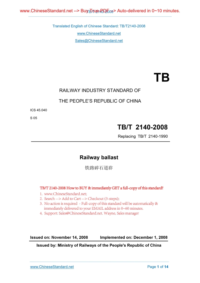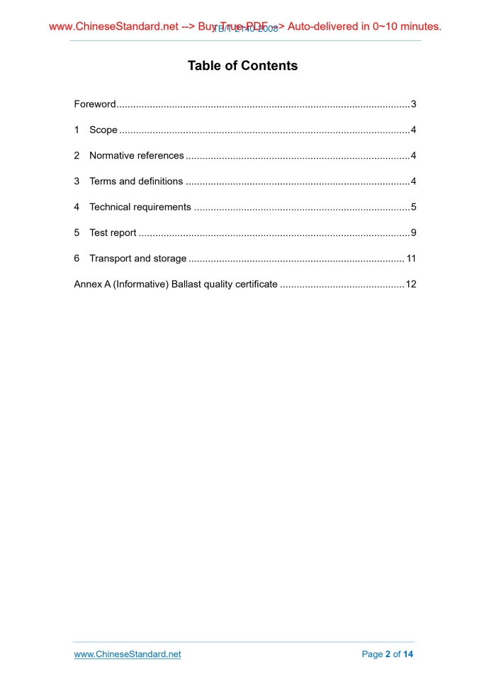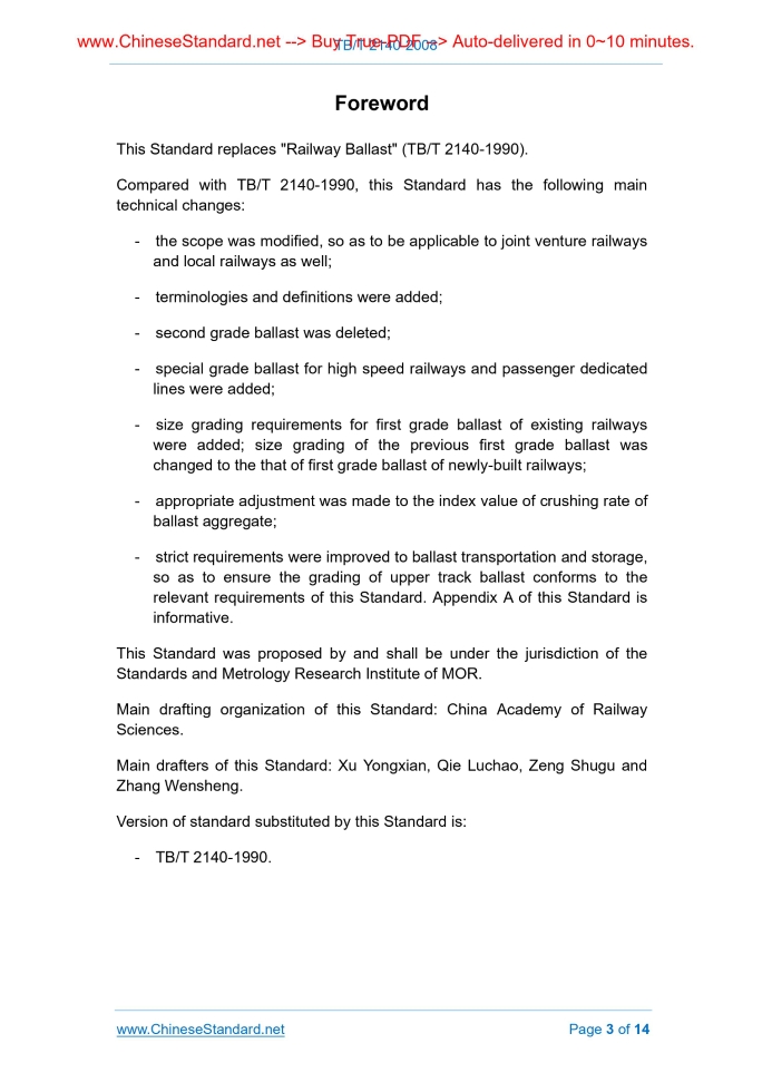 Similar standardsTB/T 2140-2008: Railway ballast---This is an excerpt. Full copy of true-PDF in English version (including equations, symbols, images, flow-chart, tables, and figures etc.), auto-downloaded/delivered in 9 seconds, can be purchased online: https://www.ChineseStandard.net/PDF.aspx/TBT2140-2008TB RAILWAY INDUSTRY STANDARD OF THE PEOPLE’S REPUBLIC OF CHINA ICS 45.040 S 05 Replacing TB/T 2140-1990 Railway ballast Issued on. NOVEMBER 14, 2008 Implemented on. DECEMBER 1, 2008 Issued by. Ministry of Railways of the People's Republic of China Table of ContentsForeword... 3 1 Scope... 4 2 Normative references... 4 3 Terms and definitions... 4 4 Technical requirements... 5 5 Test report... 9 6 Transport and storage... 11 Annex A (Informative) Ballast quality certificate... 12ForewordThis Standard replaces "Railway Ballast" (TB/T 2140-1990). Compared with TB/T 2140-1990, this Standard has the following main technical changes. - the scope was modified, so as to be applicable to joint venture railways and local railways as well; - terminologies and definitions were added; - second grade ballast was deleted; - special grade ballast for high speed railways and passenger dedicated lines were added; - size grading requirements for first grade ballast of existing railways were added; size grading of the previous first grade ballast was changed to the that of first grade ballast of newly-built railways; - appropriate adjustment was made to the index value of crushing rate of ballast aggregate; - strict requirements were improved to ballast transportation and storage, so as to ensure the grading of upper track ballast conforms to the relevant requirements of this Standard. Appendix A of this Standard is informative. This Standard was proposed by and shall be under the jurisdiction of the Standards and Metrology Research Institute of MOR. Main drafting organization of this Standard. China Academy of Railway Sciences. Main drafters of this Standard. Xu Yongxian, Qie Luchao, Zeng Shugu and Zhang Wensheng. Version of standard substituted by this Standard is. - TB/T 2140-1990. Railway ballast1 ScopeThis Standard specifies the technical requirements, test rules, transportation, storage and acceptance of railway ballast (hereinafter referred to as ballast). This Standard is applicable to ballast for national railways, joint venture railways, and local railways. Railways for industrial and mining enterprises may also refer to.2 Normative referencesThe following standards contain provisions which, through reference in this text, constitute provisions of this Standard. For dated reference, subsequent amendments to (excluding correction to), or revisions of, any of these publications do not apply. However, the parties to agreements based on this Standard are encouraged to investigate the possibility of applying the most recent editions of the standards. For undated references, the latest edition of the normative document referred to applies. TB/T 2328, Testing Method for Railway Ballast (All Parts)3 Terms and definitionsFor the purposes of this document, the following terms and definitions apply. 3.1 Acicular index The mass percentage of particle with length (maximum size) greater than 1.8 times of average particle size. 3.4 Surface cleanness of railway ballast The mass percentage of sundries (dust, soil, etc.) on the surface of railway ballast products.4 Technical requirements4.1 Raw material of ballast Ballast shall be produced from mountain stones via crushing and screening, and all the particle surfaces shall be crushing surface. 4.2 Ballast material index Material performances of all grades of ballasts shall be in accordance with the corresponding requirements listed in Table 1. 4.3 Ballast process index 4.3.1 Size grading 4.3.2.4 The content of powders less than 0.1mm in particle size in unwashed first grade ballast shall not be greater than 1%.5 Test report5.1 Inspection classification Ballast shall be subjected to resource material inspection, production inspection and delivery inspection. 5.2 Resource material inspection 5.3 Production inspection 5.3.1 One production inspection shall be carried out when the quarry produces 1.5×105 m3 ballast (for the quarry with annual output less than 1.5×105 m3 ballast, one production inspection shall not be carried out within a year) according to the contents of all items in Table 1. 5.4 Delivery inspection and acceptance 5.4.1 Before loading, quarry quality inspectors are responsible for organizing product delivery inspection, including ballast size grading, particle shape and cleanliness index, and fill in ballast quality certificate. For the products not conforming to standard, quality inspectors are entitled to refuse loading.6 Transport and storage6.1 Before loading, vehicles for transporting ballast products shall be cleaned to be free from such sundries as remained soil and dust. The surface of highway transportation of ballast shall be covered well. 6.4 Quarry and construction organization shall take the following effective measures to prevent or reduce the separation of ballast particles and ensure the grading of ballast accord with the relevant requirements in 4.3.1 of this Standard.Annex A(Informative) Ballast quality certificate A.1 See Table A.1 for the quality certificate pattern of special grade ballast products. TB/T 2140-2008 TB RAILWAY INDUSTRY STANDARD OF THE PEOPLE’S REPUBLIC OF CHINA ICS 45.040 S 05 Replacing TB/T 2140-1990 Railway ballast Issued on. NOVEMBER 14, 2008 Implemented on. DECEMBER 1, 2008 Issued by. Ministry of Railways of the People's Republic of ChinaTable of ContentsForeword... 3 1 Scope... 4 2 Normative references... 4 3 Terms and definitions... 4 4 Technical requirements... 5 5 Test report... 9 6 Transport and storage... 11 Annex A (Informative) Ballast quality certificate... 12ForewordThis Standard replaces "Railway Ballast" (TB/T 2140-1990). Compared with TB/T 2140-1990, this Standard has the following main techn