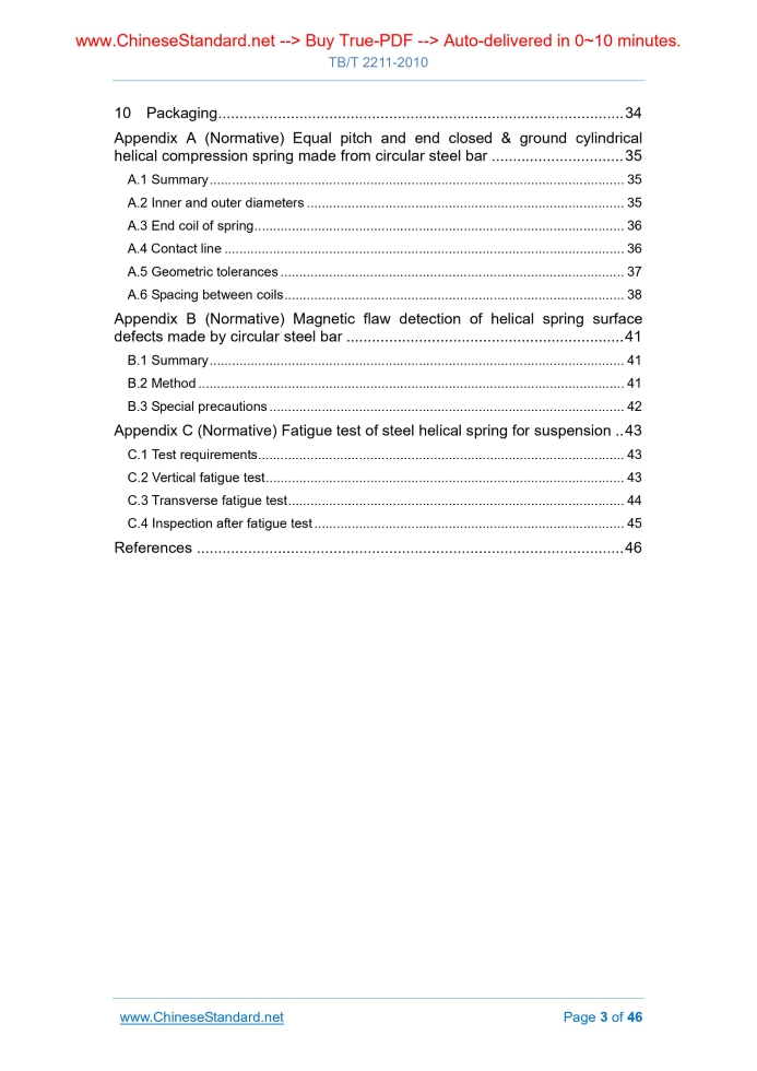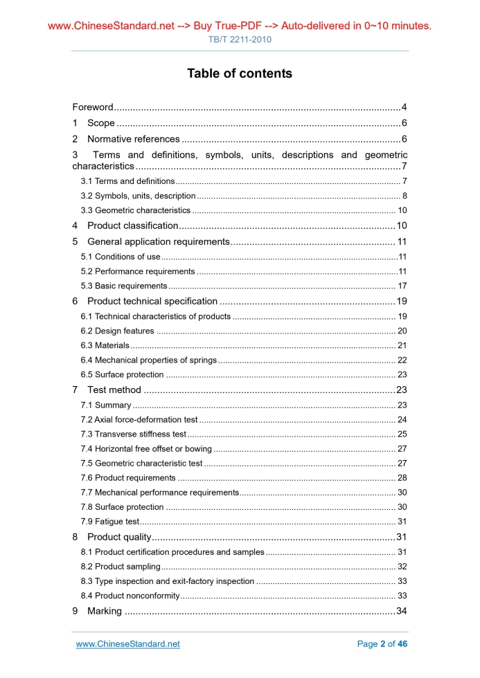 Similar standardsTB/T 2211-2010: Steel helical spring of suspension mechanism for rolling stock---This is an excerpt. Full copy of true-PDF in English version (including equations, symbols, images, flow-chart, tables, and figures etc.), auto-downloaded/delivered in 9 seconds, can be purchased online: https://www.ChineseStandard.net/PDF.aspx/TBT2211-2010TB RAILWAY INDUSTRY STANDARD ICS 45.060 S 40 Partially replacing TB/T 1025-2000, replacing TB/T 2211-1991 Steel helical spring of suspension mechanism for rolling stock Issued on: DECEMBER 02, 2010 Implemented on: JUNE 01, 2011 Issued by. Ministry of Railways of People’s Republic of China 3.No action is required - Full-copy of this standard will be automatically & immediately delivered to your EMAIL address in 0~60 minutes. Table of ContentsForeword... 4 1 Scope... 6 2 Normative references... 6 3 Terms and definitions, symbols, units, descriptions and geometric characteristics... 7 3.1 Terms and definitions... 7 3.2 Symbols, units, description... 8 3.3 Geometric characteristics... 10 4 Product classification... 10 5 General application requirements... 11 5.1 Conditions of use... 11 5.2 Performance requirements... 11 5.3 Basic requirements... 17 6 Product technical specification... 19 6.1 Technical characteristics of products... 19 6.2 Design features... 20 6.3 Materials... 21 6.4 Mechanical properties of springs... 22 6.5 Surface protection... 23 7 Test method... 23 7.1 Summary... 23 7.2 Axial force-deformation test... 24 7.3 Transverse stiffness test... 25 7.4 Horizontal free offset or bowing... 27 7.5 Geometric characteristic test... 27 7.6 Product requirements... 28 7.7 Mechanical performance requirements... 30 7.8 Surface protection... 30 7.9 Fatigue test... 31 8 Product quality... 31 8.1 Product certification procedures and samples... 31 8.2 Product sampling... 32 8.3 Type inspection and exit-factory inspection... 33 8.4 Product nonconformity... 33 9 Marking... 34 10 Packaging... 34 Appendix A (Normative) Equal pitch and end closed & ground cylindrical helical compression spring made from circular steel bar... 35 A.1 Summary... 35 A.2 Inner and outer diameters... 35 A.3 End coil of spring... 36 A.4 Contact line... 36 A.5 Geometric tolerances... 37 A.6 Spacing between coils... 38 Appendix B (Normative) Magnetic flaw detection of helical spring surface defects made by circular steel bar... 41 B.1 Summary... 41 B.2 Method... 41 B.3 Special precautions... 42 Appendix C (Normative) Fatigue test of steel helical spring for suspension.. 43 C.1 Test requirements... 43 C.2 Vertical fatigue test... 43 C.3 Transverse fatigue test... 44 C.4 Inspection after fatigue test... 45 References... 46ForewordThis standard was drafted in accordance with the rules given in GB/T 1.1-2009. This standard partially replaces the suspension spring part of the TB/T 1025-2000 “Technical conditions for the supply of hot coil helical compression springs for rolling stock”, AND the part which is not replaced is the spring used for buffer and traction device. As compared with TB/T 1025-2000 “Technical conditions for the supply of hot coil helical compression springs for rolling stock”, the main technical changes of this standard are as follows. - ADD the spring material dedicated for railway AND some spring materials of European standards (SEE 6.3.3 and Table 5 of 6.4.1); - ADD the information of spring transverse movement (SEE item 15 of Table 1), transverse stiffness (SEE 5.2.3.2), transverse free offset or bending (SEE 5.2.3.3), transverse stiffness test (SEE 7.3), and transverse fatigue test (SEE Appendix C); DETAIL the spring transverse characteristics, calculation, and test methods; - MAKE reference to the determination of non-metallic inclusions in steel – Standard rating chart microscopy method in GB/T 10561-2005. This standard replaces TB/T 2211-1991 “Fatigue test of cylindrical helical spring for rolling stock”. As compared with TB/T 2211-1991, the main technical changes are as follows. - DELETE the Appendix C “Repeatability of shot peening pre-stressing effect” of EN 13298.2002 (SEE Appendix C of 2003 version); - ADD the TB/T 1758 “Technical conditions for shot peening of rolling stock springs”, which is directly quoted in the standard (SEE 5.3.2.4); - ADD the “Fatigue test” requirements (SEE 7.9); - ADD the transverse fatigue test methods; ADJUST the spring vertical and transverse fatigue test specifications (SEE Appendix C); - MAKE adjustment against the contents of the reference (SEE references). This standard, through the re-drafting method, modifies and adopts EN 13298.2002 “Railway applications - Suspension components – Helical suspension springs, steel”. Steel helical spring of suspension mechanism for rolling stock1 ScopeThis standard specifies the geometric characteristics, application requirements, technical specification, test methods, product quality, marking and packaging of the steel helical spring of suspension mechanism for the newly designed rolling stock (hereinafter referred to as spring). This standard applies to. - Steel helical spring of suspension mechanism for railway rolling stock; - Equal pitch cylindrical compression springs made of circular cross-section equal-diameter steel bar; - Other different shaped helical springs (such as conical helical springs, unequal pitch springs, or the springs made of steel bar having other shaped cross-sections).2 Normative referencesThe following documents are essential to the application of t... ......Source: Above contents are excerpted from the full-copy PDF -- translated/reviewed by: www.ChineseStandard.net / Wayne Zheng et al. |