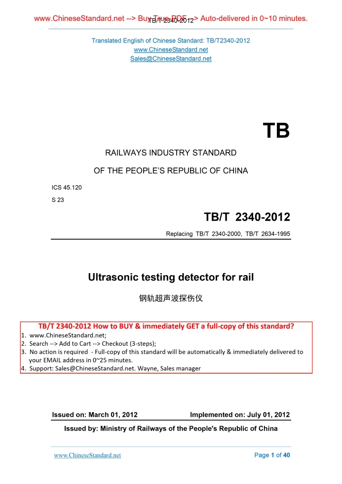 TB/T 2340-2012: Ultrasonic testing detector for rail Delivery: 9 seconds. True-PDF full-copy in English & invoice will be downloaded + auto-delivered via email. See step-by-step procedure Status: Valid TB/T 2340: Historical versions