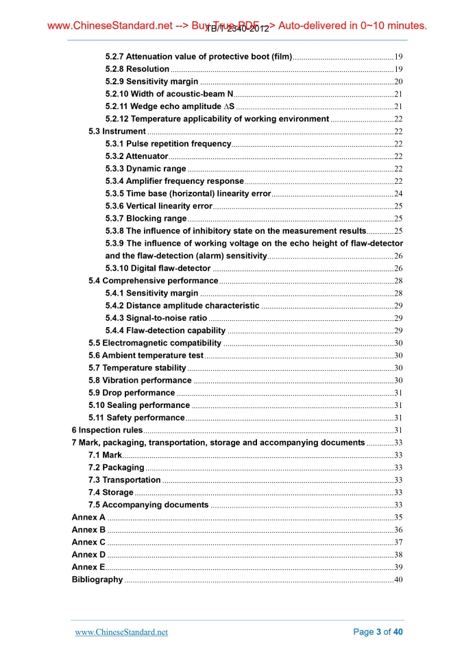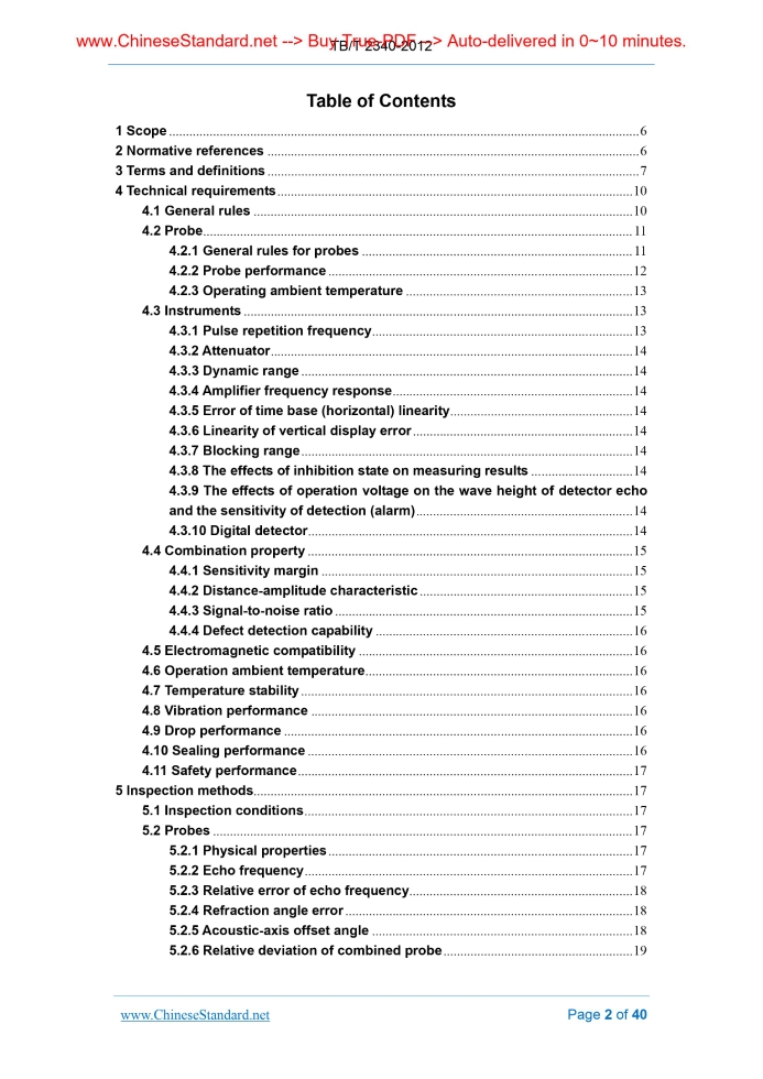 Similar standardsTB/T 2340-2012: Ultrasonic testing detector for rail---This is an excerpt. Full copy of true-PDF in English version (including equations, symbols, images, flow-chart, tables, and figures etc.), auto-downloaded/delivered in 9 seconds, can be purchased online: https://www.ChineseStandard.net/PDF.aspx/TBT2340-2012TB RAILWAYS INDUSTRY STANDARD ICS 45.120 S 23 Replacing TB/T 2340-2000, TB/T 2634-1995 Ultrasonic testing detector for rail Issued on. MARCH 01, 2012 Implemented on. JULY 01, 2012 Issued by. Ministry of Railways of the People's Republic of China Table of Contents1 Scope... 6 2 Normative references... 6 3 Terms and definitions... 7 4 Technical requirements... 10 5 Inspection methods... 17 6 Inspection rules... 31 7 Mark, packaging, transportation, storage and accompanying documents... 33 Annex A... 35 Annex B... 36 Annex C... 37 Annex D... 38 Annex E... 39 Bibliography... 401 ScopeThis Standard specifies the terms and definitions, technical requirements, inspection methods, inspection rules, marks, package, transportation, storage etc. of the multi-channel ultrasonic testing detector for rail (hereinafter referred to as the detector) This Standard applies to multi-channel ultrasonic testing detector for rail.2 Normative referencesThe following documents are indispensable for application of this document. For the dated documents so quoted, only the dated versions apply to this document. For the undated documents so quoted, the latest versions (including all modification sheets) apply to this document. GB/T 2423.1 Environmental testing for electric and electronic and electronic products - Part 2.Test methods - Test A. Cold (GB/T 2423.1-2008, IEC 60068-2-1.2007, Environmental Testing - Part 2-1.Tests A. Cold, IDT) GB/T 2423.2 Environmental testing for electric and electronic and electronic products - Part 2.Test methods - Test A. Heat (GB/T 2423.2-2008, IEC 60068-2-2.2007, Environmental Testing - Part 2-2.Tests B. Dry heat, IDT) GB/T 2423.3 Environmental testing for electric and electronic products - Part 2.Test method - Test Cab. Damp heat Steady state (GB/T 2423.3-2006, IEC 60068-2-78.2001, Environmental Testing - Part 2-78.Tests Cab. Damp heat, steady state, IDT) GB/T 2423.7 Environmental testing for electric and electronic products Part 2.Test methods - Test Ec and guidance. Drop and topple Primarily for equipment-type specimens (GB/T 2423.7-1995, IEC 60068-2-31.1982, IDT)3 Terms and definitionsFollowing terms and definitions apply to this document. 3.1 Multi-channel ultrasonic testing detector for rail It can be used for the defect detection operation of in-service rail. It is the entirety of multi-channel ultrasonic testing detector displayed by the defect detection oscilloscope, including the instrument (including power), probe, water tank with coupling liquid, and trolley that can be pushed-travelled on the track. 3.4 Amplifier bandwidth The bandwidth between the high cutoff frequency and low cutoff frequency. This Standard sets the points where the amplifier gain is 3 dB below the peak value as the limits (see Figure 1). Figure 1 Amplifier bandwidth 3.5 Dynamic range The amplitude ratio between the maximum signal and the minimum signal the ultrasonic device can show. The minimum signal may be restricted by the system noise and the maximum signal may be restricted by the saturation of the amplifier or the maximum attenuation that induces large signal into the screen. Note. modify the definition 7.4 in GB/T 12604.1-2005. 3.6 Time base-linearity The degree of proportional relation BETWEEN the input signal provided by calibrated time generator or provided by multiple reflections of known-thickness plate AND the signal location indicated on the time base-line. [Definition 7.2 in GB/T 1604-2005]4 Technical requirements4.1 General rules 4.1.1 The detector shall be able to apply to the automatic defect detecting operation for in-service rail with 43 kg/m-75 kg/m. 4.1.4 Each channel of the detector shall be equipped with sound alarm device; the sound in each channel shall be easy to distinguish. 4.1.5 The detector shall be equipped with an attenuator. 4.1.6 The detector shall be powered by storage battery; the capacity of the battery shall be able to meet the requirement that the detector continuously operates for 8 hours. 4.1.10 The detector shall be no damage on its surface; there is no damage on the devices and components. The performance of each switch shall be stable; the display of indicator light, oscilloscope tube or display screen and others shall be normal. 4.1.11 The components of detector of the same model shall be exchangeable. 4.1.12 The digital detectors shall have functions such as measuring speed, data replaying, over-speed alarming, and delivering data according to specified data format. 4.2 Probe 4.2.1 General rules for probes 4.2.1.1 The surface of the probe shall be no damage. the probe wiring shall be flexible; the plug-in of connector shall be reliable; the shield shall be good. 4.2.1.2 The connectors of the probe shall meet the requirements of superior product or first grade class product in standard SJ/T 9562.2-1993. 4.2.2 Probe performance 4.2.2.1 Physical properties For flat probes, the flatness tolerance on the probe coupling surface shall not be more than 0.05 mm. 4.2.2.2 Echo frequency Transverse-wave probes. 2 MHz~2.5 MHz; longitudinal wave transducers. 3.5 MHz~5 MHz or 2 MHz~2.5 MHz. 4.2.2.7 Attenuation value of protection boots (film) The attenuation value of protection boots (film) shall be less than or equal to 8 dB. 4.2.2.8 Resolution The resolution R of 0° probe shall be ≥18 dB; the resolution R of offset-angle probe shall be ≥14 dB. 4.2.2.9 Sensitivity margin The high and low sensitivity of probes is expressed by the sensitivity margin after the probe has been combined with instruments; the specified value of sensitivity margin S is. 4.3.3 Dynamic range Minimum limitation. It shall not be less than 16 dB. Maximum limitation. 2