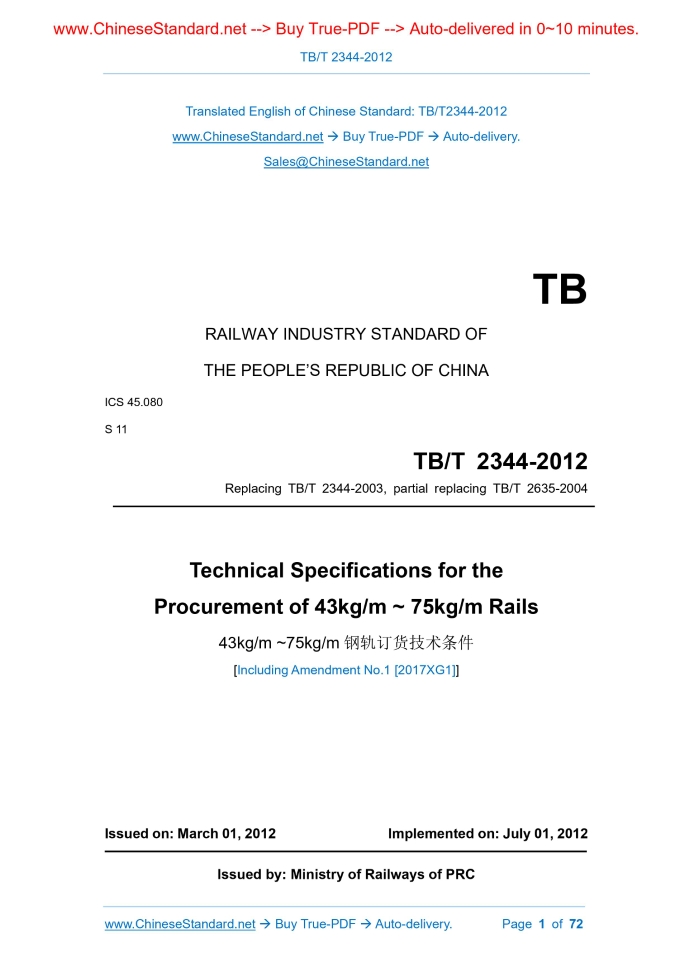 TB/T 2344-2012: [Including 2017XG1] Technical specifications for the procurement of 43 kg/m~75 kg/m rails Delivery: 9 seconds. True-PDF full-copy in English & invoice will be downloaded + auto-delivered via email. See step-by-step procedure Status: Obsolete TB/T 2344: Historical versions