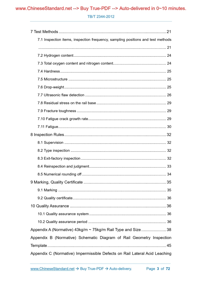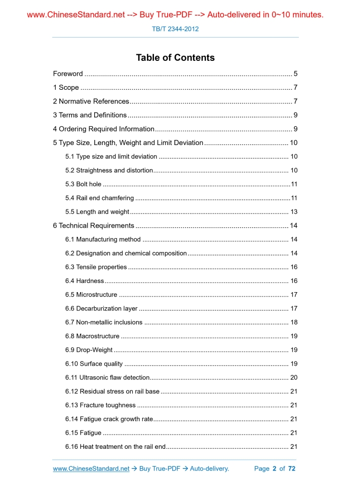 Similar standardsTB/T 2344-2012: [Including 2017XG1] Technical specifications for the procurement of 43 kg/m~75 kg/m rails---This is an excerpt. Full copy of true-PDF in English version (including equations, symbols, images, flow-chart, tables, and figures etc.), auto-downloaded/delivered in 9 seconds, can be purchased online: https://www.ChineseStandard.net/PDF.aspx/TBT2344-2012 RAILWAY INDUSTRY STANDARD OF THE PEOPLE’S REPUBLIC OF CHINA ICS 45.080 S 11 Replacing TB/T 2344-2003, partial replacing TB/T 2635-2004 Technical Specifications for the Procurement of 43kg/m ~ 75kg/m Rails [Including Amendment No.1 [2017XG1]] Issued on: MARCH 01, 2012 Implemented on: JULY 01, 2012 Issued by. Ministry of Railways of PRC Table of ContentsForeword... 5 1 Scope... 7 2 Normative References... 7 3 Terms and Definitions... 9 4 Ordering Required Information... 9 5 Type Size, Length, Weight and Limit Deviation... 10 5.1 Type size and limit deviation... 10 5.2 Straightness and distortion... 10 5.3 Bolt hole... 11 5.4 Rail end chamfering... 11 5.5 Length and weight... 13 6 Technical Requirements... 14 6.1 Manufacturing method... 14 6.2 Designation and chemical composition... 14 6.3 Tensile properties... 16 6.4 Hardness... 16 6.5 Microstructure... 17 6.6 Decarburization layer... 17 6.7 Non-metallic inclusions... 18 6.8 Macrostructure... 19 6.9 Drop-Weight... 19 6.10 Surface quality... 19 6.11 Ultrasonic flaw detection... 20 6.12 Residual stress on rail base... 21 6.13 Fracture toughness... 21 6.14 Fatigue crack growth rate... 21 6.15 Fatigue... 21 6.16 Heat treatment on the rail end... 21 7 Test Methods... 21 7.1 Inspection items, inspection frequency, sampling positions and test methods ... 21 7.2 Hydrogen content... 24 7.3 Total oxygen content and nitrogen content... 24 7.4 Hardness... 25 7.5 Microstructure... 25 7.6 Drop-weight... 25 7.7 Ultrasonic flaw detection... 26 7.8 Residual stress on the rail base... 29 7.9 Fracture toughness... 29 7.10 Fatigue crack growth rate... 29 7.11 Fatigue... 30 8 Inspection Rules... 32 8.1 Supervision... 32 8.2 Type inspection... 32 8.3 Exit-factory inspection... 32 8.4 Reinspection and judgment... 33 8.5 Numerical rounding off... 34 9 Marking, Quality Certificate... 35 9.1 Marking... 35 9.2 Quality certificate... 36 10 Quality Assurance... 36 10.1 Quality assurance system... 36 10.2 Quality assurance period... 36 Appendix A (Normative) 43kg/m ~ 75kg/m Rail Type and Size... 38 Appendix B (Normative) Schematic Diagram of Rail Geometry Inspection Template... 45 Appendix C (Normative) Impermissible Defects on Rail Lateral Acid Leaching Test Strips... 54 Appendix D (Normative) Rail Plane Strain Fracture Toughness KIC Test Method ... 61 Appendix E (Normative) Heat Treatment Technical Condition on the End of Rail ... 65 Appendix F (Normative) Method for Measuring Longitudinal Residual Stress of Rail Base Surface... 68 Bibliography... 70 Amendment No.1 [2017XG1] TB/T 2344-2012 Technical Specification for the Procurement of 43kg/m ~ 75kg/m Rails... 71 Technical Specifications for the Procurement of 43kg/m ~ 75kg/m Rails1 ScopeThis Standard specifies the terms and definitions, ordering required information, type size and limit deviation, technical requirements, test methods, inspection rules, marking and quality certificate, quality assurance, and the like contents of 43kg/m ~ 75kg/m rails. This Standard is applicable to the 43kg/m ~ 75kg/m hot-rolled and online heat-treated rails for the railway with the maximum running speed of 160km/h. this Standard can be referred by the heat-treated rails for high-speed railways.2 Normative ReferencesThe following documents are essential to the application of this document. For the dated documents, only the versions with the dates indicated are applicable to this document; for the undated documents, only the latest version (including all the amendments) are applicable to this document. GB/T 223.14 Methods for Chemical Analysis of Iron, Steel and Alloy - The N- Benzoy-N-Phenylhydroxylamine Extraction Photometric Method for the Determination of Vanadium Content GB/T 223.49 Methods for Chemical Analysis of Iron, Steel and Alloy - Extraction Separation-Chlorophosphonazo mA Spectrophotometric Method for the Determination of the Total Rare Earth Content GB/T 223.60 Methods for Chemical Analysis of Iron, Steel and Alloy - The Perchloric Acid Dehydration Gravimetric Method for the Determination of Silicon Content GB/T 223.62 Methods for Chemical Analysis of Iron, Steel and Alloy - The Butyl Acetate Extraction Photometric Method for the Determination of Phosphorus Content GB/T 223.63 Methods for Chemical Analysis of Iron, Steel and Alloy - The Sodium (Potassium) Periodate Photometric Method for the Determination of Manganese Content GB/T 223.68 Methods for Chemical Analysis of Iron, Steel and Alloy - The Potassium Iodate Titration Method after Combustion in the Pipe Furnace for the Determination of Sulfur Content GB/T 223.71 Methods for Chemical Analysis of Iron, Steel and Alloy - The Gravimetric Method after Combustion in the Pipe Furnace for the Determination of Carbon Content GB/T 223.82 Steel and Iron - Determination of Hydrogen Content - Inert Gas Impulse Fusion Heat Conductivity Method GB/T 226 Test Method for Macrostructure and Defect of Steel By Etching GB/T 228.1 Metallic Materials - Tensile Testing - Part 1.Method of Test at Room Temperature GB/T 230.1 Metallic Materials - Rockwell Hardness Test - Part 1.Test Method GB/T 231.1 Metallic Materials - Brinell Hardness Test - Part 1.Test Method GB/T 3075 Metallic Materials - Fatigue Testing - Axial-Force-Controlled Method GB/T 4161 Metallic Materials - Determination of Plane-Strain Fracture Toughness – KIC test GB/T 4336 Standard Test Method for Spark Discharge Atomic Emission Spectrometric Analysis of Carbon and Low-Alloy Steel (Routine Method) GB/T 4340.1 Metallic Materials - Vickers Hardness Test - Part 1.Test Method GB/T 6398 Metallic Materials - Fatigue Testing - Fatigue Crack Growth Met