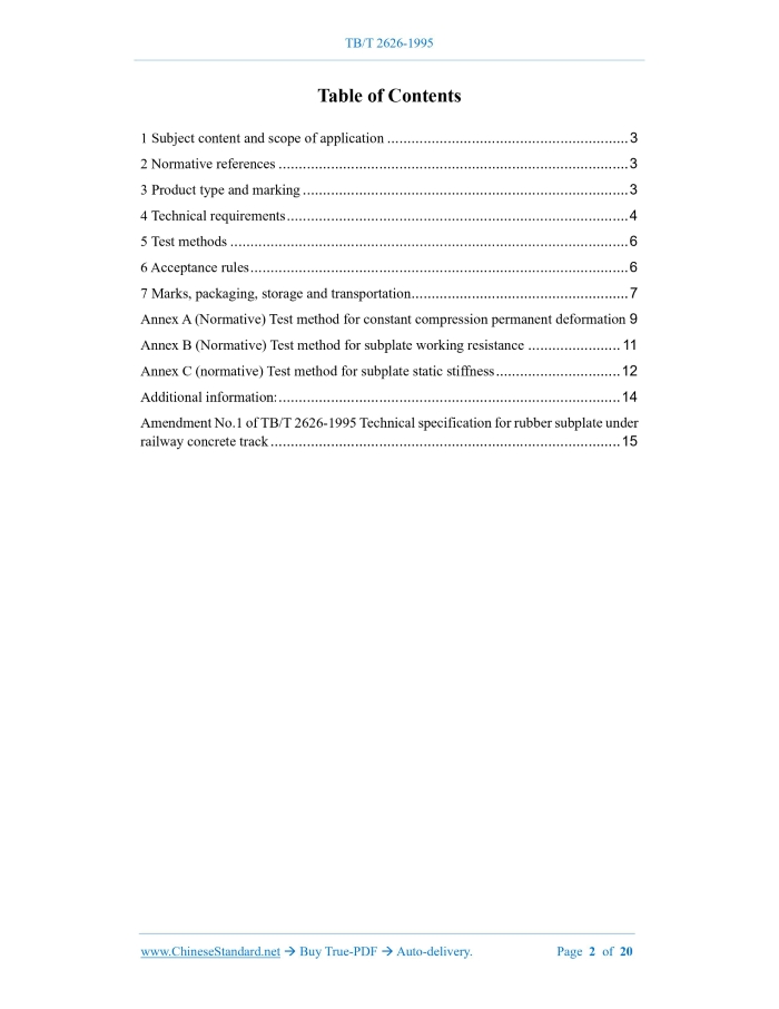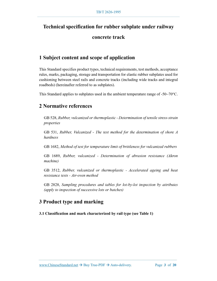 TB/T 2626-1995: Technical specification for rubber subplate under railway concrete track---This is an excerpt. Full copy of true-PDF in English version (including equations, symbols, images, flow-chart, tables, and figures etc.), auto-downloaded/delivered in 9 seconds, can be purchased online: https://www.ChineseStandard.net/PDF.aspx/TBT2626-1995TB RAILWAY INDUSTRY STANDARD OF THE PEOPLE’S REPUBLIC OF CHINA Technical specification for rubber subplate under railway concrete track Issued on: MARCH 10, 1995 Implemented on: SEPTEMBER 01, 1995 Issued by. Ministry of Railways of the People's Republic of China Table of Contents1 Subject content and scope of application... 3 2 Normative references... 3 3 Product type and marking... 3 4 Technical requirements... 4 5 Test methods... 6 6 Acceptance rules... 6 7 Marks, packaging, storage and transportation... 7 Annex A (Normative) Test method for constant compression permanent deformation 9 Annex B (Normative) Test method for subplate working resistance... 11 Annex C (normative) Test method for subplate static stiffness... 12 Additional information... 14 Amendment No.1 of TB/T 2626-1995 Technical specification for rubber subplate under railway concrete track... 15 Technical specification for rubber subplate under railway concrete track1 Subject content and scope of applicationThis Standard specifies product types, technical requirements, test methods, acceptance rules, marks, packaging, storage and transportation for elastic rubber subplates used for cushioning between steel rails and concrete tracks (including wide tracks and integral roadbeds) (hereinafter referred to as subplates). This Standard applies to subplates used in the ambient temperature range of -50~70°C.2 Normative referencesGB 528, Rubber, vulcanized or thermoplastic - Determination of tensile stress-strain properties GB 531, Rubber, Vulcanized - The test method for the determination of shore A hardness GB 1682, Method of test for temperature limit of brittleness for vulcanized rubbers GB 1689, Rubber, vulcanized - Determination of abrasion resistance (Akron machine) GB 3512, Rubber, vulcanized or thermoplastic - Accelerated ageing and heat resistance tests - Air-oven method GB 2828, Sampling procedures and tables for lot-by-lot inspection by attributes (apply to inspection of successive lots or batches)3 Product type and marking3.1 Classification and mark characterized by rail type (see Table 1) 6.2.3 The inspection level of the appearance quality of subplate is the general inspection level I. The acceptable quality level is 6.5. 6.2.4 The physical and mechanical performance inspection level of subplate is special inspection level S-1.The acceptable quality level is 2.5. 6.2.5 The static stiffness inspection level of subplate is special inspection level S-1.The acceptable quality level is 2.5. 6.2.6 Prepare specimens from semi-finished compounds for Akron abrasion test. The abrasion must be less than 0.6cm3/1.61km. Otherwise it cannot be launched into production. 6.2.7 If there are any failed items in the above inspection, in the failed batch of products, the secondary sampling will be carried out with the same plan. Repeat the test for the failed item. If the retest still fails, this batch shall be rejected. Unless the item can be 100% inspected. Resubmit after inspection.7 Marks, packaging, storage and transportation7.1 Marks There must be clear marks that cannot be washed off by oil and water on the marked parts specified in the product drawings. It must indicate. 1) Product name; 2) Year of manufacture (take the last two digits); 3) Name or logo of manufacturer. 7.2 Packaging Subplates are packed in woven bags or cartons. Each package shall not exceed 50kg. The surface of the packaging must be printed with. 1) Product name; 2) Product type; 3) Product quantity; 4) Manufacturer's name and trademark. The product quality inspection certificate must be attached to the package. On the certificate, it must indicate. 1) Product name and type; The width of the loading short rail shall be 1mm larger than the width of the basic size of the specimen. The length is the same as the specimen length. The width of the bottom plate is the same as the length of the rail bottom, which is 170mm. Both sides of the upper surface of the rail bottom must be planed. Add a glass sheet at the contact with the dial gauge probe. The two dial indicators are supported on the base of the testing machine. The probes of the two dial indicators are symmetrically arranged on the opposite corners on both sides of the short rail. C3 Test steps The test environment temperature is 20±5°C. Place the prepared specimen on the bottom plate as shown in Figure C. Apply 140kN of static load. Unload. Stop for 10s. Reapply 140kN of load. Unload; then carry out the formal test. At the beginning of the formal test, adjust the two dial indicators to point to zero. Then load it evenly at a speed of 2~3kN per second. When the load is increased to 20kN and 80kN, stop for 1min each. Record the compression amount ΔAi and ΔBi of the subplate respectively (ΔAi and ΔBi are the average of the readings of the two dial gauges). Repeat the test this way 3 times. The average value of ΔAi and ΔBi measured 3 times is the average compression amount ΔA and ΔB of the subplate at 20kN and 80kN. C4 Test result and test report C4.1 Test result The static stiffness value of the subplate is calculated according to the following formula. Where, S0 - Static stiffness of the subplate, kN/mm; ΔA - Compression amount of the subplate when loaded with 20kN, mm; ΔB - Compression amount of the subplate when loaded with 80kN, mm; 60 - Static load, kN. C4.2 Test report The test report contains the following. 1) Specimen source, specification, quantity and manufacturer; ......Source: Above contents are excerpted from the full-copy PDF -- translated/reviewed by: www.ChineseStandard.net / Wayne Zheng et al. Tips & Frequently Asked Questions:Question 1