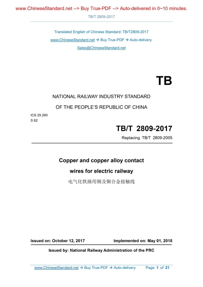 TB/T 2809-2017: Copper and copper alloy contact wires for electric railway Delivery: 9 seconds. True-PDF full-copy in English & invoice will be downloaded + auto-delivered via email. See step-by-step procedure Status: Valid TB/T 2809: Historical versions