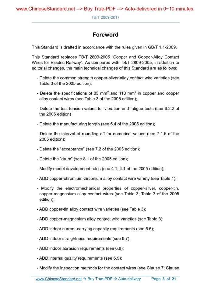 Similar standardsTB/T 2809-2017: Copper and copper alloy contact wires for electric railway---This is an excerpt. Full copy of true-PDF in English version (including equations, symbols, images, flow-chart, tables, and figures etc.), auto-downloaded/delivered in 9 seconds, can be purchased online: https://www.ChineseStandard.net/PDF.aspx/TBT2809-2017TB NATIONAL RAILWAY INDUSTRY STANDARD OF THE PEOPLE’S REPUBLIC OF CHINA ICS 29.280 S 82 Replacing TB/T 2809-2005 Copper and copper alloy contact wires for electric railway Issued on: OCTOBER 12, 2017 Implemented on: MAY 01, 2018 Issued by. National Railway Administration of the PRC Table of ContentsForeword ... 3 1 Scope ... 5 2 Normative references ... 5 3 Terms and definitions ... 5 4 Product classification ... 5 5 Material ... 6 6 Technical requirements ... 7 7 Inspection methods ... 11 8 Inspection rules and judgement of results ... 16 9 Packaging and marking ... 18 10 Storage and transportation... 19 Bibliography ... 20ForewordThis Standard is drafted in accordance with the rules given in GB/T 1.1-2009. This Standard replaces TB/T 2809-2005 “Copper and Copper-Alloy Contact Wires for Electric Railway”. As compared with TB/T 2809-2005, in addition to editorial changes, the main technical changes of this Standard are as follows. - Delete the common strength copper-silver alloy contact wire varieties (see Table 3 of the 2005 edition); - Delete the specifications of 85 mm2 and 110 mm2 in copper and copper alloy contact wires (see Table 3 of the 2005 edition); - Delete the test tension values for vibration and fatigue tests (see 6.2.2 of the 2005 edition) - Delete the manufacturing length (see 6.4 of the 2005 edition); - Delete the interval of rounding off for numerical values (see 7.1.5 of the 2005 edition); - Delete the “acceptance” (see 7.2 of the 2005 edition); - Delete the “drum” (see 8.1 of the 2005 edition); - Modify model development rules (see 4.1; 4.1 of the 2005 edition); - ADD copper-chromium-zirconium alloy contact wire variety (see Table 1); - Modify the electromechanical properties of copper-silver, copper-tin, copper-magnesium alloy contact wires (see Table 3; Table 3 of the 2005 edition); - ADD copper-tin alloy contact wire varieties (see Table 3); - ADD copper-magnesium alloy contact wire varieties (see Table 3); - ADD indoor current-carrying capacity requirements (see 6.6); - ADD indoor straightness requirements (see 6.7); - ADD indoor abrasion requirements (see 6.8); - ADD internal quality requirements (see 6.9); - Modify the inspection methods for the contact wires (see Clause 7; Clause Copper and copper alloy contact wires for electric railway1 ScopeThis Standard specifies the terms and definitions, product classification, technical requirements, inspection methods, inspection rules, packaging and marking, storage and transportation of copper and copper alloy contact wires for electric railway (known as contact wires for short). This Standard applies to copper and copper alloy contact wires for electric railway contact systems. Contact wires for overhead contact systems of urban rail transit and industrial and mining enterprises may also refer to this Standard.2 Normative referencesThe following documents are indispensable for the application of this document. For the dated references, only the editions with the dates indicated are applicable to this document. For the undated references, the latest edition (including all the amendments) are applicable to this document. GB/T 467-2010 Copper cathode3 Terms and definitionsThe following terms and definitions apply to this document. Contact wire The wire in the overhead contact system of electric railway which is in contact with a locomotive pantograph strip and transmits current.4 Product classification4.1 Model Contact wire product model is classified according to copper and its alloying element category, tensile strength grade, and nominal sectional area; and is Refer to GB/T 3048.2. Prepare a sample with a length of 40 mm; USE buoyancy method to measure the density of contact wire; and then calculate the cross- sectional area. 7.3 Resistivity, conductivity test Refer to GB/T 3048.2. USE four-end method for double-arm bridge to measure. Before the measurement, LET the sample stand at a constant temperature of 20 °C±0.5 °C for 24 h. When measuring, the sample is mounted on a fixture; and a current of 8 A is applied. In order to eliminate the influence of thermoelectric potential, USE the method of switching the positive and negative polarities of power supply to take the average to measure. If the sample surface is dirty or rusted, it shall be treated with alcohol cotton or fine sandpaper before measurement. If the ambient temperature does not meet 20 °C±0.5 °C (but the ambient temperature still needs to be controlled within 20 °C±5 °C), according to the temperature coefficient of resistance, it shall be converted to the resistance, resistivity, or conductivity at 20 °C. The temperature coefficient of resistance is given in Table 3. 7.4 Breaking force, tensile strength, and elongation tests Refer to GB/T 4909.3. The gauge length of sample is 250 mm. At a speed of 20 mm/min, uniaxially STRETCH until breaking. RECORD the breaking force value; and calculate the tensile strength. The breaking force value is the maximum force value during the breaking of contact wire. After aligning the two breaks of the contact wire after the break, USE a Vernier caliper to measure the length after the break. Then the elongation is calculated. 7.5 Breaking force test after softening After the sample is placed in a thermostat at a temperature of 300 °C±5 °C for 2 h, the sample is taken out, naturally cooled to room temperature. According to the test method of 7.4, the breaking force test is carried out. 7.6 Torsion test Refer to GB/T 4909.4. The gauge length of sample is 250 mm. During the test, the tension applied is 1% of the rated breaking force. The torsion test spee