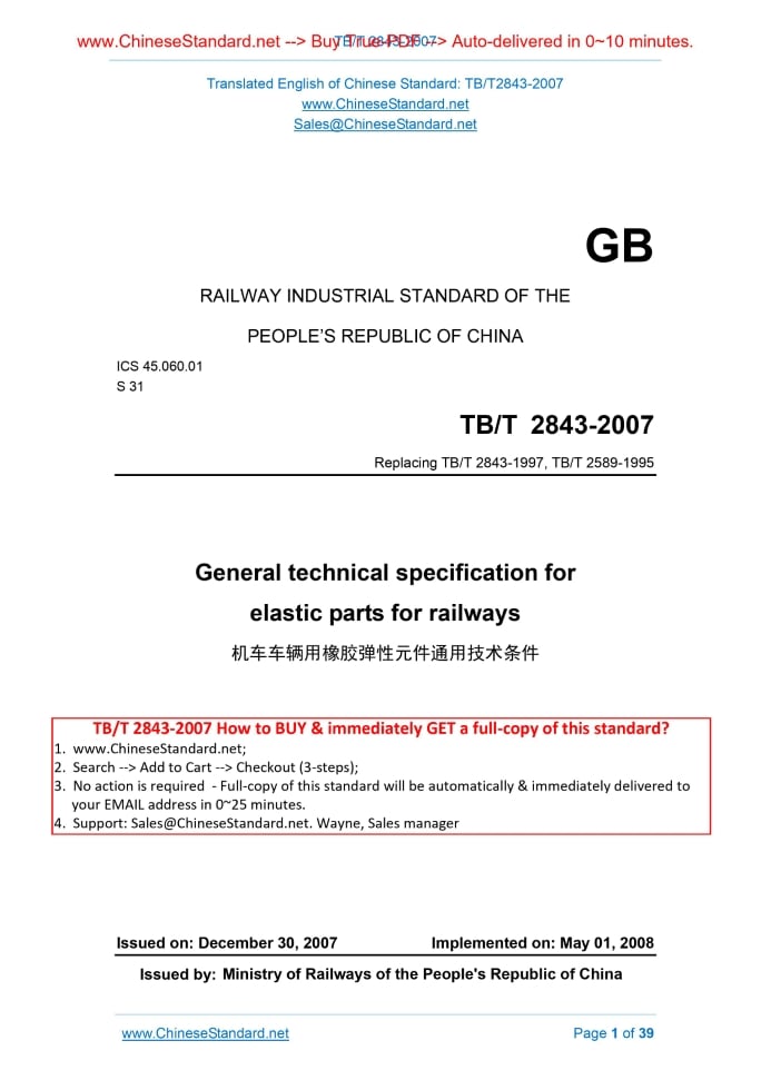 TB/T 2843-2007: General technical specification for elastic parts for railways Delivery: 9 seconds. True-PDF full-copy in English & invoice will be downloaded + auto-delivered via email. See step-by-step procedure Status: Obsolete TB/T 2843: Historical versions