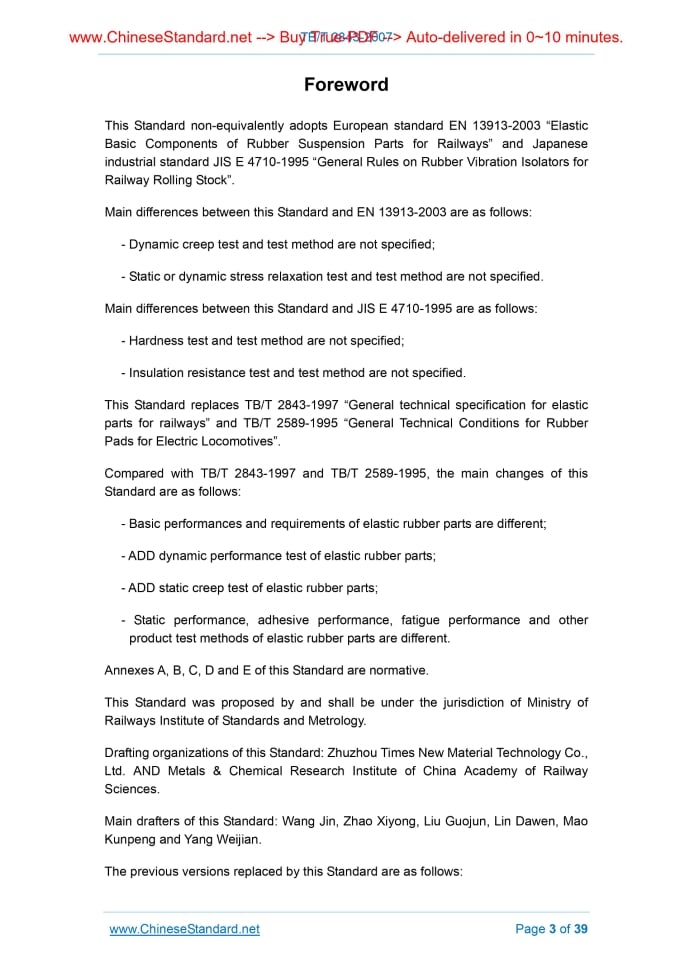 TB/T 2843-2007: General technical specification for elastic parts for railways---This is an excerpt. Full copy of true-PDF in English version (including equations, symbols, images, flow-chart, tables, and figures etc.), auto-downloaded/delivered in 9 seconds, can be purchased online: https://www.ChineseStandard.net/PDF.aspx/TBT2843-2007GB RAILWAY INDUSTRIAL STANDARD OF THE PEOPLE’S REPUBLIC OF CHINA ICS 45.060.01 S 31 Replacing TB/T 2843-1997, TB/T 2589-1995 General technical specification for elastic parts for railways Issued on: DECEMBER 30, 2007 Implemented on: MAY 01, 2008 Issued by. Ministry of Railways of the People's Republic of China Table of ContentsForeword... 3 1 Scope... 5 2 Normative references... 5 3 Classification... 7 4 Environmental requirements... 7 5 Basic performances and requirements... 7 6 Test methods... 12 7 Inspection rules... 13 8 Marking, packaging, storage and transportation... 15 Annex A... 16 Annex B... 21 Annex C... 26 Annex D... 30 Annex E... 34 Bibliography... 39ForewordThis Standard non-equivalently adopts European standard EN 13913-2003 “Elastic Basic Components of Rubber Suspension Parts for Railways” and Japanese industrial standard JIS E 4710-1995 “General Rules on Rubber Vibration Isolators for Railway Rolling Stock”. Main differences between this Standard and EN 13913-2003 are as follows. - Dynamic creep test and test method are not specified; - Static or dynamic stress relaxation test and test method are not specified. Main differences between this Standard and JIS E 4710-1995 are as follows. - Hardness test and test method are not specified; - Insulation resistance test and test method are not specified. This Standard replaces TB/T 2843-1997 “General technical specification for elastic parts for railways” and TB/T 2589-1995 “General Technical Conditions for Rubber Pads for Electric Locomotives”. Compared with TB/T 2843-1997 and TB/T 2589-1995, the main changes of this Standard are as follows. - Basic performances and requirements of elastic rubber parts are different; - ADD dynamic performance test of elastic rubber parts; - ADD static creep test of elastic rubber parts; - Static performance, adhesive performance, fatigue performance and other product test methods of elastic rubber parts are different. Annexes A, B, C, D and E of this Standard are normative. This Standard was proposed by and shall be under the jurisdiction of Ministry of Railways Institute of Standards and Metrology. Drafting organizations of this Standard. Zhuzhou Times New Material Technology Co., Ltd. AND Metals & Chemical Research Institute of China Academy of Railway Sciences. Main drafters of this Standard. Wang Jin, Zhao Xiyong, Liu Guojun, Lin Dawen, Mao Kunpeng and Yang Weijian. The previous versions replaced by this Standard are as follows. - TB/T 2843-1997; - TB/T 2589-1995. General Technical Specifications for Elastic Parts for Railways1 ScopeThis Standard specifies classification, basic performances, requirements, test methods, inspection rules, marking, packaging, storage and transportation of elastic rubber parts for railways. This Standard applies to elastic rubber parts for shock absorption, buffer, flexible connection, limiting, etc. in hanging system, equipment installation system, connection, limiting positions, etc. of railways. This Standard does not apply to air springs, sealed rubber products, coupler buffers, hoses and conveyor belts of railways.2 Normative referencesThe provisions in following documents become the provisions of this Standard through reference in this Standard. For dated references, the subsequent amendments (excluding corrigendum) or revisions do not apply to this Standard, however, parties who reach an agreement based on this Standard are encouraged to study if the latest versions of these documents are applicable. For undated references, the latest edition of the referenced document applies. GB/T 228-2002 Metallic materials - Tensile testing at ambient temperature (ISO 6892.1998(E), EQV) GB/T 528-1998 Rubber, vulcanized or thermoplastic - Determination of tensile stress-strain properties (eqv ISO 37 - 1994) GB/T 529-1999 Rubber, vulcanized or thermoplastic - Determination of tear strength (Trouser, angle and crescent specimens) (eqv ISO 34-1.1994) GB/T 531-1999 Rubber - Determination of indentation hardness by means of pocket hardness meters (idt ISO 7619-1986) GB/T 1681-1991 Rubber - Determination of rebound resilience of vulcanizates (eqv ISO 4662-1986) GB/T 1682-1994 Rubber, vulcanized - Determination of low-temperature brittleness (single specimen method) GB/T 1689-1998 Rubber vulcanized - Determination of abrasion resistance (Akron machine) GB/T 1690-2006 Rubber vulcanized or thermoplastic - Determination of the effect of liquids (ISO 1817.2005, MOD) GB/T 1692-1992 Vulcanized rubber - Determination of the insulation resistivity GB/T 1695-2005 Rubber, vulcanized - Determination of electrical breakdown strength and voltage resistant at commercial power frequency GB/T 3512-2001 Rubber, vulcanized or thermoplastic - Accelerated ageing and heat resistance tests - Air-oven method (eqv ISO 188.1998) GB/T 3672.1-2002 Rubber - Tolerances of products - Part 1.Dimensional tolerances (ISO 3302-1.1996, IDT) GB/T 3672.2-2002 Rubber - Tolerances of products - Part 2.Geometrical tolerances (ISO 3302-2.1998, IDT) GB/T 4336-2002 Standard test method for spark discharge atomic emission spectrometric analysis of carbon and low - Alloy steel (routine method) GB/T 6038-2006 Rubber test mixes - Preparation, mixing and vulcanization - Equipment and procedures (ISO 2393-1994, MOD) GB/T 7759-1996 Rubber, Vulcanized or thermoplastic - Determination of compression set at ambient elevated or low temperatures (eqv ISO 815.1991) GB/T 7762-2003 Rubber, vulcanized or thermoplastic - Resistance to ozone cracking - Static strain test (ISO 1431-1.1989, MOD) GB/T 9867-1988 Rubber - Determination of abrasion resistance using a rotating cylindrical dr