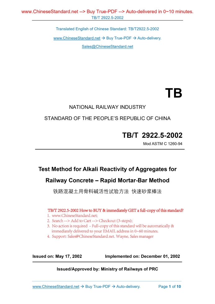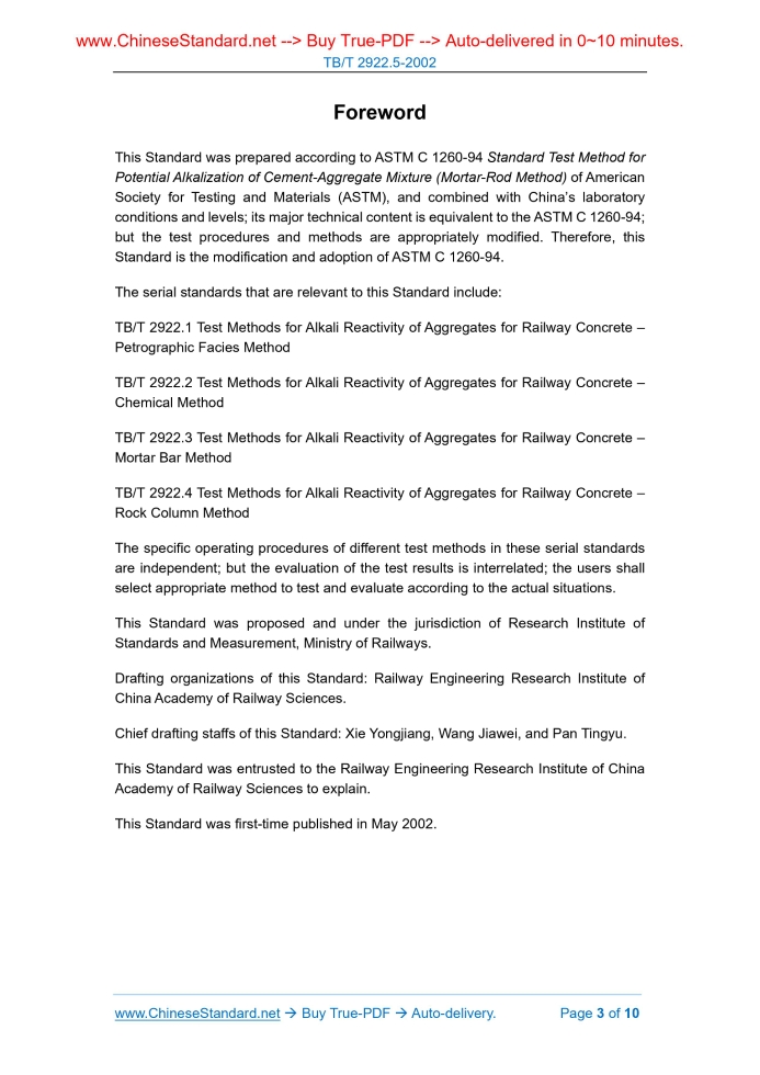 Similar standardsTB/T 2922.5-2002: Railway Concrete Accelerated Mortar Bar aggregate alkali reactivity test methods for---This is an excerpt. Full copy of true-PDF in English version (including equations, symbols, images, flow-chart, tables, and figures etc.), auto-downloaded/delivered in 9 seconds, can be purchased online: https://www.ChineseStandard.net/PDF.aspx/TBT2922.5-2002 TB NATIONAL RAILWAY INDUSTRY STANDARD OF THE PEOPLE’S REPUBLIC OF CHINA Mod ASTM C 1260-94 Test Method for Alkali Reactivity of Aggregates for Railway Concrete – Rapid Mortar-Bar Method Issued on: MAY 17, 2002 Implemented on: DECEMBER 01, 2002 Issued/Approved by. Ministry of Railways of PRC Table of ContentsForeword ... 3 1 Scope ... 4 2 Normative References ... 4 3 Terms ... 4 4 Principle ... 5 5 Materials ... 5 6 Apparatus ... 5 7 Laboratory Temperature and Humidity ... 6 8 Procedures ... 6 9 Result Calculation and Processing ... 9 10 Evaluation ... 10 11 Report ... 10ForewordThis Standard was prepared according to ASTM C 1260-94 Standard Test Method for Potential Alkalization of Cement-Aggregate Mixture (Mortar-Rod Method) of American Society for Testing and Materials (ASTM), and combined with China’s laboratory conditions and levels; its major technical content is equivalent to the ASTM C 1260-94; but the test procedures and methods are appropriately modified. Therefore, this Standard is the modification and adoption of ASTM C 1260-94. The serial standards that are relevant to this Standard include. TB/T 2922.1 Test Methods for Alkali Reactivity of Aggregates for Railway Concrete – Petrographic Facies Method TB/T 2922.2 Test Methods for Alkali Reactivity of Aggregates for Railway Concrete – Chemical Method TB/T 2922.3 Test Methods for Alkali Reactivity of Aggregates for Railway Concrete – Mortar Bar Method TB/T 2922.4 Test Methods for Alkali Reactivity of Aggregates for Railway Concrete – Rock Column Method The specific operating procedures of different test methods in these serial standards are independent; but the evaluation of the test results is interrelated; the users shall select appropriate method to test and evaluate according to the actual situations. This Standard was proposed and under the jurisdiction of Research Institute of Standards and Measurement, Ministry of Railways. Drafting organizations of this Standard. Railway Engineering Research Institute of China Academy of Railway Sciences. Chief drafting staffs of this Standard. Xie Yongjiang, Wang Jiawei, and Pan Tingyu. This Standard was entrusted to the Railway Engineering Research Institute of China Academy of Railway Sciences to explain. This Standard was first-time published in May 2002. Test Method for Alkali Reactivity of Aggregates for Railway Concrete – Rapid Mortar-Bar Method1 ScopeThis Standard specifies the sampling method, apparatus, test procedures, result treatment method, etc. of using the rapid mortar bar method to inspect the alkali reactivity of aggregate for railway concrete. This Standard is applicable to evaluate the alkali-silicate reactivity of siliceous aggregate; it is also applicable to the alkali-silicate reactivity of components in the carbonate aggregate.2 Normative ReferencesThe following standards contain provisions which, through reference in this Standard, constitute provisions of this Standard. At the time of publication, the editions indicated are valid. All standards are subject to revision. The parties who are using this Standard shall explore the possibility of using the latest version of the following standards. GB/T 17671-1999 Method of Test Cements – Determination of Strength JC/T 681-1997 Mixer for Mixing Mortars JGJ 52-1992 Standard for Technical Requirements and Test Method of Sand and Crushed Stone (or Gravel) for Ordinary Concrete JGJ 53-1992 Quality Standard and Test Method of Gravel and Crushed Stone for Ordinary Concrete TB/T 2922.3-1998 Test Methods for Alkali Reactivity of Aggregates for Railway Concrete - Mortar Bar Method3 Terms3.1 Alkali reactivity The characteristics of expansion, cracks, even damage of concrete caused by the chemical reaction between certain minerals in the aggregate and alkali (K2O, Na2O) in into the test mould; flatten the test-piece surface, number, and mark the test direction. Three test-pieces shall be made against each aggregate according to the above method. 8.4 Preparation of test-piece curing solution Weigh 40.00g of sodium hydroxide, dissolve into 1L volumetric flask containing 900mL of distilled water; titrate the distilled water into the flask till the solution volume reaches 1.0L, then the 1N sodium hydroxide solution is the test-piece curing solution. The preparation amount of test-piece curing solution shall be confirmed according to the amount of test-pieces and provisions of 8.7. 8.5 Test-piece pre-curing Place the formed test-piece with mold into the standard curing room for curing 24h±2h. After taking out test mould and removing mold, rapidly place the test-piece into the test-piece holder in the curing container. Immerse the test-piece completely with water, cover the curing container; place the curing container into 80°C±2°C water bath or oven for 24h±2h. 8.6 Measurement of the initial length of the test-piece Take out the curing container from the water bath or oven one by one; untighten the cover of the curing container, take out test-piece one by one from the curing container; quickly use a rag to wipe the test-piece surface and probe surface; then use the length measuring instrument to measure the test-piece length, which is the initial length of the test-piece. The time from the test-piece taken out of the water to after the initial length is read out shall be controlled within 15s±5s. Use wet rag to cover the test-piece with initial length read till the initial length of other test-pieces has been read. NOTE 1. before measurement, place the length measuring instrument into 20°C±2°C constant temperature room for 24h. Befo