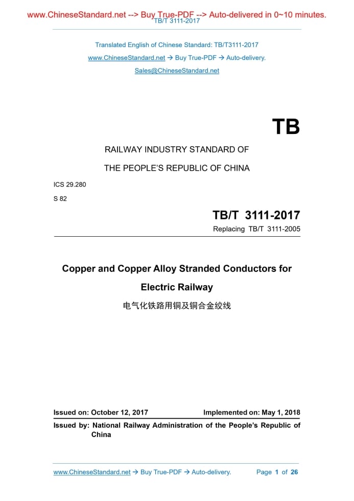 TB/T 3111-2017: Copper and Copper Alloy Stranded Conductors for Electric Railway Delivery: 9 seconds. True-PDF full-copy in English & invoice will be downloaded + auto-delivered via email. See step-by-step procedure Status: Valid TB/T 3111: Historical versions