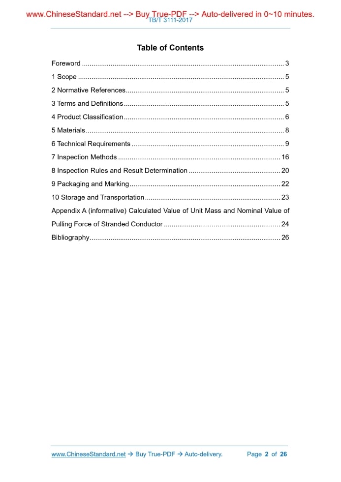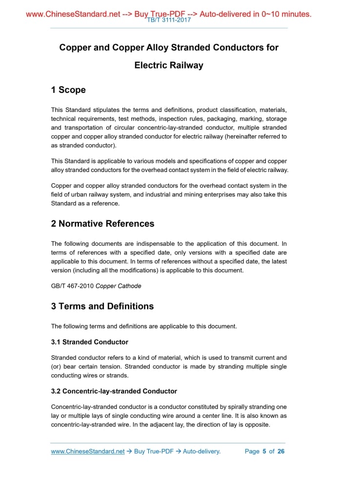 Similar standardsTB/T 3111-2017: Copper and Copper Alloy Stranded Conductors for Electric Railway---This is an excerpt. Full copy of true-PDF in English version (including equations, symbols, images, flow-chart, tables, and figures etc.), auto-downloaded/delivered in 9 seconds, can be purchased online: https://www.ChineseStandard.net/PDF.aspx/TBT3111-2017RAILWAY INDUSTRY STANDARD OF THE PEOPLE’S REPUBLIC OF CHINA ICS 29.280 S 82 Replacing TB/T 3111-2005 Copper and Copper Alloy Stranded Conductors for Electric Railway ISSUED ON: OCTOBER 12, 2017 IMPLEMENTED ON: MAY 1, 2018 Issued by: National Railway Administration of the People’s Republic of China Table of ContentsForeword ... 3 1 Scope ... 5 2 Normative References ... 5 3 Terms and Definitions ... 5 4 Product Classification ... 6 5 Materials ... 8 6 Technical Requirements ... 9 7 Inspection Methods ... 16 8 Inspection Rules and Result Determination ... 20 9 Packaging and Marking ... 22 10 Storage and Transportation ... 23 Appendix A (informative) Calculated Value of Unit Mass and Nominal Value of Pulling Force of Stranded Conductor ... 24 Bibliography ... 26 Copper and Copper Alloy Stranded Conductors for Electric Railway1 ScopeThis Standard stipulates the terms and definitions, product classification, materials, technical requirements, test methods, inspection rules, packaging, marking, storage and transportation of circular concentric-lay-stranded conductor, multiple stranded copper and copper alloy stranded conductor for electric railway (hereinafter referred to as stranded conductor). This Standard is applicable to various models and specifications of copper and copper alloy stranded conductors for the overhead contact system in the field of electric railway. Copper and copper alloy stranded conductors for the overhead contact system in the field of urban railway system, and industrial and mining enterprises may also take this Standard as a reference.2 Normative ReferencesThe following documents are indispensable to the application of this document. In terms of references with a specified date, only versions with a specified date are applicable to this document. In terms of references without a specified date, the latest version (including all the modifications) is applicable to this document. GB/T 467-2010 Copper Cathode3 Terms and DefinitionsThe following terms and definitions are applicable to this document. 3.1 Stranded Conductor Stranded conductor refers to a kind of material, which is used to transmit current and (or) bear certain tension. Stranded conductor is made by stranding multiple single conducting wires or strands. 3.2 Concentric-lay-stranded Conductor Concentric-lay-stranded conductor is a conductor constituted by spirally stranding one lay or multiple lays of single conducting wire around a center line. It is also known as concentric-lay-stranded wire. In the adjacent lay, the direction of lay is opposite. 3.3 Multiple Stranded Conductor Multiple stranded conductor refers to a conductor, which is formed by the stranding of several wire sets through one or multiple spiral lays. In each wire set, single conducting wire may be bunched or stranded. 3.4 Direction of Lay Direction of lay refers to the stranding direction of one lay of single conducting wire or strand. In other words, it refers to the direction of movement after leaving the observer. 3.5 Length of Lay Length of lay refers to the axial length of a whole spiral formed by one single conducting wire or strand in stranded conductor. 3.6 Lay Ratio Lay ratio refers to the ratio of the length of lay of a single conducting wire or strand in stranded conductor to the external diameter of the lay. 3.7 Single Conducting Wire Single conducting wire refers to drawn metal wire which has a stipulated circular cross- section. 3.8 Concentric Strand Concentric strand refers to an element in multiple stranded conductor. Each element is constituted of a set of concentrically stranded single conducting wires. 3.9 Bunched Strand Bunched strand refers to an element in multiple stranded conductor. Single conducting wires of each element are spirally stranded together in the same direction and the same length of lay. However, stratification is not required here.4 Product Classification4.1 Classification and Model Copper and copper alloy stranded conductors shall be classified in accordance with the category of copper and its alloy elements, and tensile strength rating. Each category can also be divided into different specifications in accordance with the cross- sectional area. Product model shall be expressed in the following form. In accordance with GB/T 4909.2, adopt the test method of paper tape to measure the length of lay of the stranded conductor, then, calculate the lay ratio of the stranded conductor. 7.3 Measurement of Diameter of Single Conducting Wire Since single conducting wire is already deformed after the stranding, a blade-type micrometer shall be used, or, a slice (thickness: 1 mm) shall be put on a universal microscope to measure its diameter. In addition, in the same cross-section, measure two mutually vertical values; take the average value. 7.4 Pulling Force of Stranded Conductor, Pulling Force Test after Vibration Test and Fatigue Test 7.4.1 In accordance with TB/T 2074, on both ends of a stranded conductor with the gauge length of 5 m, respectively crimp it with 200 mm seamless steel pipe. Then, clamp the sample on a horizontal tension machine, at the rate of not more than 20 mm/min, uniformly load it. When a single conducting wire ruptures, or, completely breaks off, stop the loading; record the maximum force value. If the sample ruptures inside the crimped pipe, or, at a distance of less than 20 mm from the pipe mouth, and the test force value is less than the value stipulated in the Standard, then, the test shall be invalid. The test shall be re-conducted. 7.4.2 Use terminal anchor clamp for the pulling force test of stranded conductor. 7.5 DC Resistanc