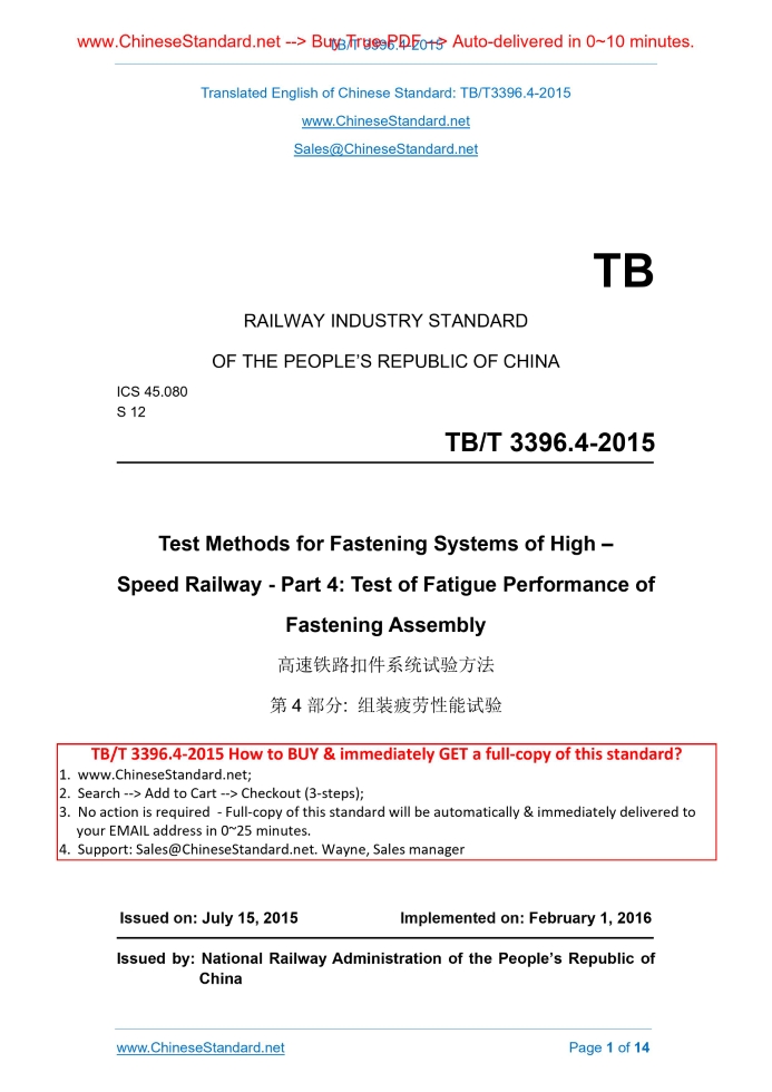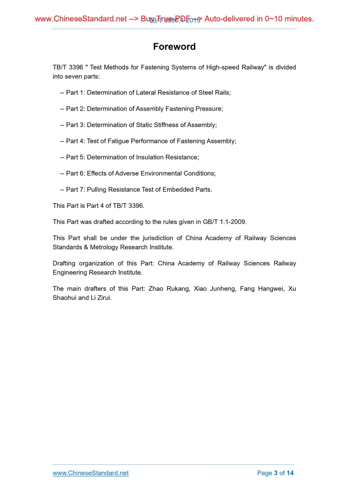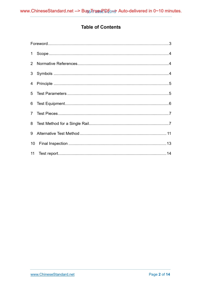 Similar standardsTB/T 3396.4-2015: Test Methods for Fastening Systems of High - Speed Railway - Part 4: Test of Fatigue Performance of Fastening Assembly---This is an excerpt. Full copy of true-PDF in English version (including equations, symbols, images, flow-chart, tables, and figures etc.), auto-downloaded/delivered in 9 seconds, can be purchased online: https://www.ChineseStandard.net/PDF.aspx/TBT3396.4-2015 TB RAILWAY INDUSTRY STANDARD ICS 45.080 S 12 Test Methods for Fastening Systems of High – Speed Railway - Part 4.Test of Fatigue Performance of Fastening Assembly Issued on. JULY 15, 2015 Implemented on. FEBRUARY 1, 2016 Issued by. National Railway Administration of the People’s Republic of China Table of ContentsForeword... 3 1 Scope... 4 2 Normative References... 4 3 Symbols... 4 4 Principle... 5 5 Test Parameters... 5 6 Test Equipment... 6 7 Test Pieces... 7 8 Test Method for a Single Rail... 7 9 Alternative Test Method... 11 10 Final Inspection... 13 11 Test report... 14ForewordTB/T 3396 " Test Methods for Fastening Systems of High-speed Railway" is divided into seven parts. -- Part 1.Determination of Lateral Resistance of Steel Rails; -- Part 2.Determination of Assembly Fastening Pressure; -- Part 3.Determination of Static Stiffness of Assembly; -- Part 4.Test of Fatigue Performance of Fastening Assembly; -- Part 5.Determination of Insulation Resistance; -- Part 6.Effects of Adverse Environmental Conditions; -- Part 7.Pulling Resistance Test of Embedded Parts. This Part is Part 4 of TB/T 3396. This Part was drafted according to the rules given in GB/T 1.1-2009. This Part shall be under the jurisdiction of China Academy of Railway Sciences Standards & Metrology Research Institute. Drafting organization of this Part. China Academy of Railway Sciences Railway Engineering Research Institute. The main drafters of this Part. Zhao Rukang, Xiao Junheng, Fang Hangwei, Xu Shaohui and Li Zirui. Test Methods for Fastening Systems of High – Speed Railway - Part 4.Test of Fatigue Performance of Fastening Assembly1 ScopeThis Part specifies the indoor test methods for fatigue performance of fastening assembly. This Part applies to the fastening systems of high-speed railway.2 Normative ReferencesThe following documents are essential to the application of this standard. For the dated references, only the dated editions are applicable to this standard. For the undated references, their latest editions (including all amendments) are applicable to this standard. TB/T 3396.1 Test Methods for Fastening Systems of High-speed Railway - Part 1.Determination of Lateral Resistance of Steel Rails TB/T 3396.2 Test Methods for Fastening Systems of High-speed Railway - Part 2.Determination of Assembly Fastening Pressure TB/T 3396.3 Test methods for fastener systems of high-speed railway - Part 3. Determination of Static Stiffness of Assembly3 SymbolsThe following symbols apply to this document.4 PrincipleCyclic load is applied to the rail head at the loading position and direction, shown in Figure 1.5 Test Parameters5.1 Maximum load of cyclic loads6 Test Equipment6.1 Steel rail A short rail section, approximately 0.5 m or 1 m in length (as shown in Figure 2, cut off 15 mm at rail-waist of 60 kg/m steel rail, total height is 161 mm, the rail bottom shall not be untrimmed). The steel rail shall be free from stripping or rust on the surface. The rail bottom shall not be polished by repeated tests. Figure 2 Steel Rail Section 6.2 Loading equipment The equipment is capable of reaching 100 kN under the frequency 3 Hz ~ 5 Hz during a single bearing surface test. Its loading capacity shall be increased accordingly when 2 or 4 bearing surfaces are required to be loaded simultaneously. 6.5 Loading frame The loading frame is capable of distributing equally the load applied to two steel rails according to the action line required; it is capable of applying cyclic load on steel rail head according to the loading position and direction, shown in Figure 1. 6.7 Load sensor The instrument measuring the load applied on steel rail or loading frame, its accuracy is class I.7 Test Pieces7.1 Sleeper The sleeper, ½-sleeper or slab rail element that has fastener embedded parts or reserved holes (all named sleeper in the test method). The bearing surface of sleeper shall not be trimmed for the test. 7.2 Fastener A complete set of fastener that includes all components.8 Test Method for a Single Rail8.1 General The test method for single rails is applicable to the test in which a single rail is fixed to one end of sleeper or a half sleeper with fasteners. No adjustment, re-screwing or trimming of fastening assembly shall be made during the test. 8.2 Test procedure 8.3 Assembly fastening pressure Determine the assembly fastening pressure of fasteners according to the method specified in TB/T 3396.2. 8.4 Rail lateral resistance Determine the rail lateral resistance of fasteners according to the method specified in TB/T 3396.1. 8.5 Assembly static rigidity Determine the static rigidity of fastening assembly according to the method specified in TB/T 3396.3. 8.7 Repeated test After 10×106 loading cycles, remove load from all fastening components used for the test; conduct the repeated test according to the following sequence after placing them aside for 24 h. assembly static rigidity (see 8.5), rail vertical resistance (see 8.4), and assembly fastening pressure (see 8.3).9 Alternative Test Method9.1 General The alternative test method is applicable to the test in which the fastening system is used to fix two rails on one or two sleepers. No adjustment, re-screwing or trimming shall be made for the fastening assembly during the test. 9.2 Test procedure 9.3 Assembly fastening pressure Determine the assembly fastening pressure of fasteners according to the method specified in TB/T 3396.2; take the average value of two fastening systems for the assembly fastening pressure. 9.4 Rail vertical resistance Determine the rail vertical res