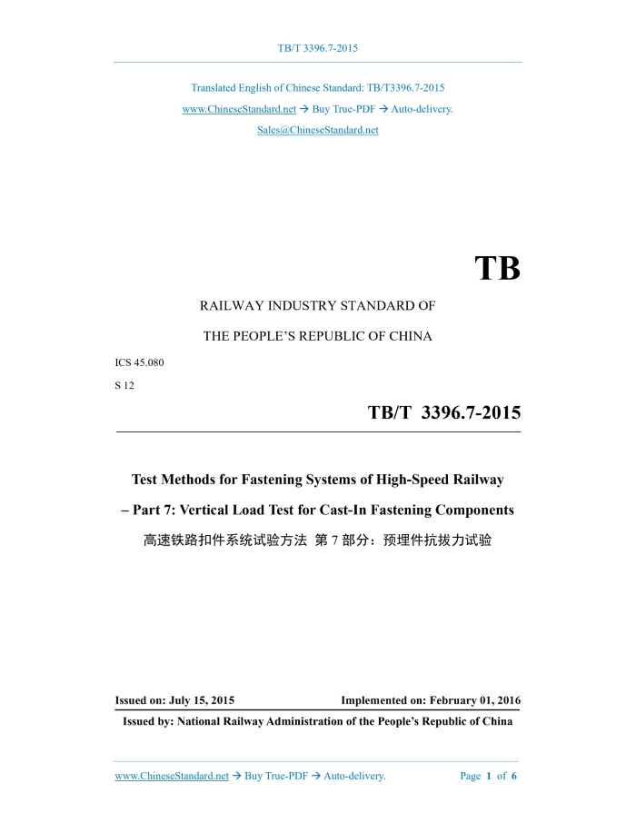 TB/T 3396.7-2015: Test methods for fastening systems of high-speed railway - Part 7: Vertical load test for cast-in fastening components Delivery: 9 seconds. True-PDF full-copy in English & invoice will be downloaded + auto-delivered via email. See step-by-step procedure Status: Valid