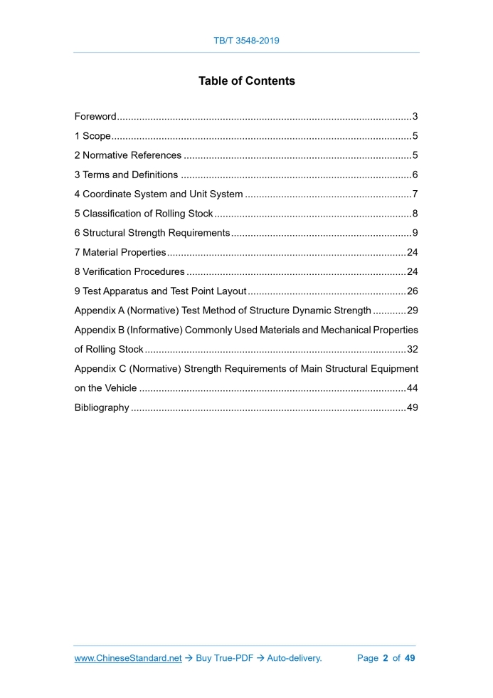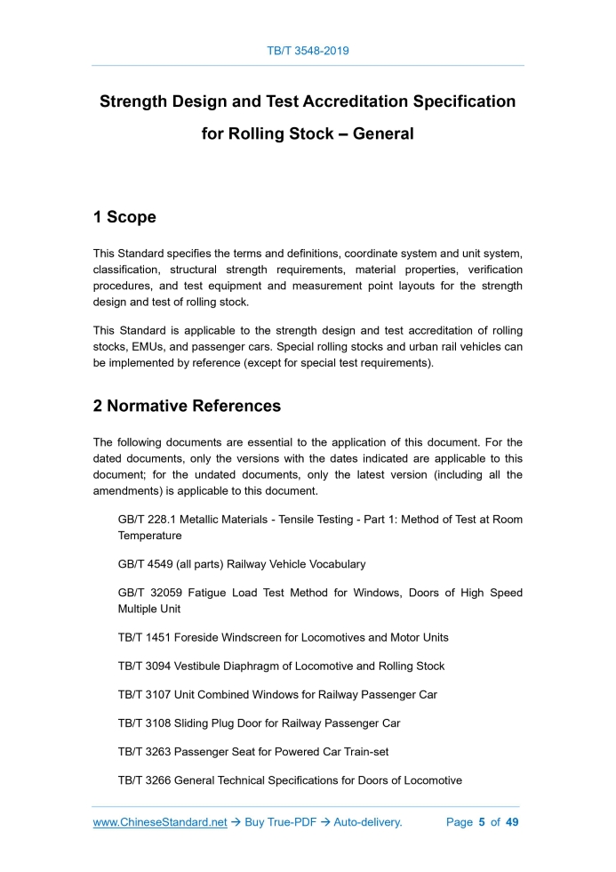 Similar standardsTB/T 3548-2019: Strength design and test accreditation specification for rolling stock-General---This is an excerpt. Full copy of true-PDF in English version (including equations, symbols, images, flow-chart, tables, and figures etc.), auto-downloaded/delivered in 9 seconds, can be purchased online: https://www.ChineseStandard.net/PDF.aspx/TBT3548-2019TB RAILWAY INDUSTRY STANDARD ICS 45.060.20 S 51 Partially replacing TB/T 1335-1996 Strength Design and Test Accreditation Specification for Rolling Stock – General Issued on. APRIL 08, 2019 Implemented on. NOVEMBER 01, 2019 Issued by. National Railway Administration of the People’s Republic of China Table of ContentsForeword... 3 1 Scope... 5 2 Normative References... 5 3 Terms and Definitions... 6 4 Coordinate System and Unit System... 7 5 Classification of Rolling Stock... 8 6 Structural Strength Requirements... 9 7 Material Properties... 24 8 Verification Procedures... 24 9 Test Apparatus and Test Point Layout... 26 Appendix A (Normative) Test Method of Structure Dynamic Strength... 29 Appendix B (Informative) Commonly Used Materials and Mechanical Properties of Rolling Stock... 32 Appendix C (Normative) Strength Requirements of Main Structural Equipment on the Vehicle... 44 Bibliography... 491 ScopeThis Standard specifies the terms and definitions, coordinate system and unit system, classification, structural strength requirements, material properties, verification procedures, and test equipment and measurement point layouts for the strength design and test of rolling stock. This Standard is applicable to the strength design and test accreditation of rolling stocks, EMUs, and passenger cars. Special rolling stocks and urban rail vehicles can be implemented by reference (except for special test requirements).2 Normative ReferencesThe following documents are essential to the application of this document. For the dated documents, only the versions with the dates indicated are applicable to this document; for the undated documents, only the latest version (including all the amendments) is applicable to this document. GB/T 228.1 Metallic Materials - Tensile Testing - Part 1.Method of Test at Room Temperature GB/T 4549 (all parts) Railway Vehicle Vocabulary GB/T 32059 Fatigue Load Test Method for Windows, Doors of High Speed Multiple Unit TB/T 1451 Foreside Windscreen for Locomotives and Motor Units TB/T 3094 Vestibule Diaphragm of Locomotive and Rolling Stock TB/T 3107 Unit Combined Windows for Railway Passenger Car TB/T 3108 Sliding Plug Door for Railway Passenger Car3 Terms and DefinitionsFor the purposes of this document, the terms and definitions given in GB/T 4549 (all parts) and the following apply. 3.1 Rolling stock The locomotives, EMUs, passenger cars, and freight cars running on the track are collectively referred to as rolling stock. 3.2 Car body Supported by the bogie, it mainly plays a bearing role and is an integral part of the rolling stock. 3.3 Car body structure The main load-bearing structure of the car body is composed of one or more of the main structural parts such as the underframe, side walls, end walls, roof, and cab. 3.4 Connecting device for equipment Fasteners for installing equipment and related local load-bearing structure or installation structure. 3.6 Bogie frame The integral welded parts that are used to connect the axle box and transmit the force in the bogie; they are generally located between the primary suspension and the secondary suspension. 3.7 Exceptional load Occasionally, the maximum load that does not affect the integrity of the rolling stock and the normal operation.4 Coordinate System and Unit System4.1 Coordinate system The coordinate system is shown in Figure 1.The longitudinal direction of the rolling stock corresponds to the X-axis, the transverse direction corresponds to the Y-axis, and the vertical direction corresponds to the Z-axis. All parameters of this Standard are expressed in the basic units and the derived units of the International System of Units (SI) (Value-g is 9.81 m/s2).5 Classification of Rolling Stock5.1 Classification of structure According to the structural characteristics and design use, the rolling stock is divided into four types. locomotive (L), EMU (U), passenger car (P) and freight car (F), and then further divided according to structural requirements. 5.2 Locomotives 5.4 Passenger cars The non-articulated railway vehicles for passenger transportation and trailers and control cars in relatively articulated power-concentrated EMUs are classified in this category. Its structure type is identified as P. 5.5 Freight cars The non-articulated railway vehicles used for the goods transportation are classified into this category (excluding special freight cars such as long and large freight cars). This group defines two structure types, and the corresponding type identifiers are as follows.6 Structural Strength Requirements6.1 General requirements 6.1.1 Basic principles 6.1.1.4 For newly designed structures of rolling stock, the rods, plates, or shells that bear the compressive load shall be checked for stability by calculation or test to avoid structural failure due to loss of stability. The connection nodes of all load-bearing members shall have sufficient rigidity, and the structure shall not be unstable. For more complex structures, finite element analysis methods should be adopted. 6.1.2 General method 6.1.2.1 The carrying capacity of the rolling stock structure is evaluated according to the following indicators. 6.1.2.2 In the static strength assessment, when calculating complex stress components, Von Mises stress shall be calculated for ductile materials (except for wood or other anisotropic materials and polymer materials). 6.1.2.3 For rolling stock components with simple structures, the load-bearing capacity may be calculated by the methods of material mechanics, elastic theory, and structural mechanics; for the calculation of the load-bearing cap