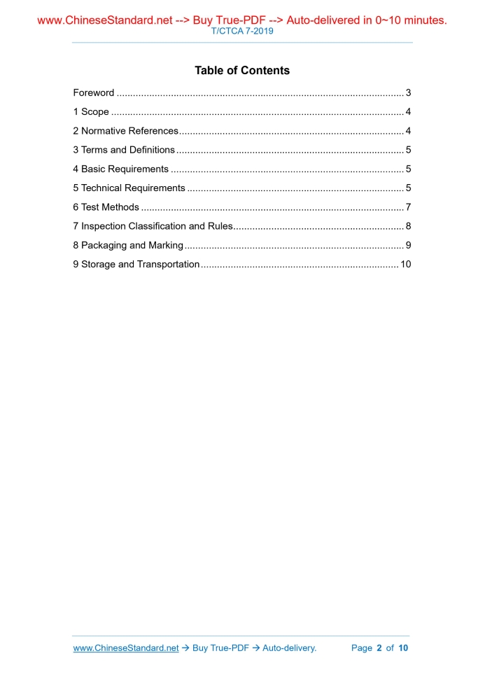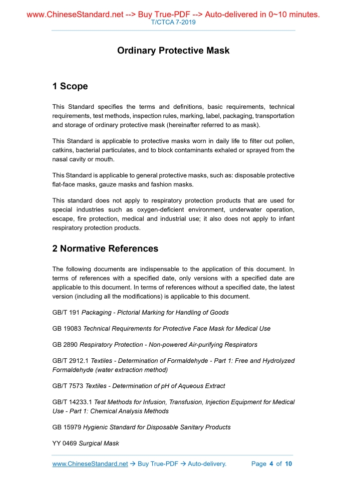 Similar standardsTCTCA7-2019: Ordinary protective mask---This is an excerpt. Full copy of true-PDF in English version (including equations, symbols, images, flow-chart, tables, and figures etc.), auto-downloaded/delivered in 9 seconds, can be purchased online: https://www.ChineseStandard.net/PDF.aspx/TCTCA7-2019ASSOCIATION STANDARD ICS 59.080.30 W 55 Ordinary Protective Mask Issued on. DECEMBER 31, 2019 Implemented on. JANUARY 30, 2020 Issued by. China Textile Commerce Association Table of ContentsForeword... 3 1 Scope... 4 2 Normative References... 4 3 Terms and Definitions... 5 4 Basic Requirements... 5 5 Technical Requirements... 5 6 Test Methods... 7 7 Inspection Classification and Rules... 8 8 Packaging and Marking... 9 9 Storage and Transportation... 10ForewordThis Standard was formulated in accordance with GB/T 1.1-2009 Directives for Standardization - Part 1.Structure and Drafting of Standards. This Standard was proposed by China Textile Commerce Association. This Standard shall be under the jurisdiction of Safety and Health Protection Products Committee of China Textile Commerce Association. The drafting organizations of this Standard. Jiande CHAOMEI Daily Chemical Co., Ltd.; China Components Test; QINGCAO Labor Insurance Association; Jingzhou STRONG Safety & Technology Co., Ltd.; Guangzhou GUANHUA Labor Protection Articles Co., Ltd.; Shanghai GANGKAI Purifying Products Co., Ltd.; MING DIAN SHANG PIN (Beijing) Information Technology Co., Ltd.; Suzhou BOLISI Medical Treatment Technology Co., Ltd.; Garry Galaxy Biotechnology Co., Ltd. The main drafters of this Standard. Lu Bing, Li Yanfeng, Fang Zhuchang, Chen Jiaxin, Wang Yan, Wang Yan, Xu Hong, Xie Zhengzhong, Su Hequn. Ordinary Protective Mask1 ScopeThis Standard specifies the terms and definitions, basic requirements, technical requirements, test methods, inspection rules, marking, label, packaging, transportation and storage of ordinary protective mask (hereinafter referred to as mask). This Standard is applicable to protective masks worn in daily life to filter out pollen, catkins, bacterial particulates, and to block contaminants exhaled or sprayed from the nasal cavity or mouth. This Standard is applicable to general protective masks, such as. disposable protective flat-face masks, gauze masks and fashion masks. This standard does not apply to respiratory protection products that are used for special industries such as oxygen-deficient environment, underwater operation, escape, fire protection, medical and industrial use; it also does not apply to infant respiratory protection products.2 Normative ReferencesThe following documents are indispensable to the application of this document. In terms of references with a specified date, only versions with a specified date are applicable to this document. In terms of references without a specified date, the latest version (including all the modifications) is applicable to this document. GB/T 191 Packaging - Pictorial Marking for Handling of Goods GB 19083 Technical Requirements for Protective Face Mask for Medical Use GB 2890 Respiratory Protection - Non-powered Air-purifying Respirators GB/T 2912.1 Textiles - Determination of Formaldehyde - Part 1.Free and Hydrolyzed Formaldehyde (water extraction method) GB/T 7573 Textiles - Determination of pH of Aqueous Extract3 Terms and Definitions3.1 Filter Efficiency Filter efficiency refers to the percentage of particulate matters filtered out by masks or filter elements (filter material) under the specified testing conditions. [GB 2626-2006, Definition 3.16]4 Basic Requirements4.1 General Requirements 4.1.1 The design of the appearance and functional structure of the mask can satisfy the requirements of processing technology and personalized customization.5 Technical Requirements5.1 General Requirements 5.1.1 The masks shall be able to protect the mouth and nose safely and firmly. 5.2 Appearance Requirements 5.2.1 On the surface of the masks, there shall be no damage, oil stains, deformation or other obvious defects. 5.3 Intrinsic Quality Intrinsic quality indexes shall comply with the requirements in Table 1.6 Test Methods6.1 Appearance Inspection Take 10 masks; adopt visual inspection method for the inspection. The inspection light shall be subject to normal natural light. When it is illuminated with a fluorescent lamp, the illuminance shall be not lower than 400 lx. 6.2 Formaldehyde Content Comply with the stipulations of GB/T 2912.1. 6.5 Filter Efficiency 6.6 Ventilation Resistance In accordance with the stipulations of 5.6.2 in YY 0469-2011, test particulate filtration efficiency (PFE), simultaneously, record the ventilation resistance of the samples. Comply with the stipulations of 5.4 in YY 0469-2011. 6.8 Microbiological Index Comply with the stipulations of GB 15979. 6.9 View below Mask Comply with the stipulations of 6.8 in GB 2890-2009.7 Inspection Classification and RulesFor inspection rules, the inspection is divided into type inspection and exit- factory inspection. 7.1 Group-batch Group-batch shall be grouped by the products of the same process, the same raw materials and the same specification. 7.3 Type Inspection Type inspection includes all the inspection items. Under one of the following circumstances, type inspection shall be conducted. 7.4 Exit-factory Inspection 7.5 Exit-factory inspection items are appearance, particulate filtration efficiency, headband tension, ventilation resistance and residual ethylene oxide (if applicable). 7.6 Quality Determination 7.6.1 Determination of appearance quality When all the samples comply with the requirements in 5.2 in appearance quality, then, they shall be determined as qualified, otherwise, they shall be determined as disqualified. 7.6.3 Determination of result When all the samples are qualified in appearance quality and intrinsic quality, then, this batch of products shall be determined as qualified, otherwise, they shall be determined as disqualified.8 Packaging and Marking8.