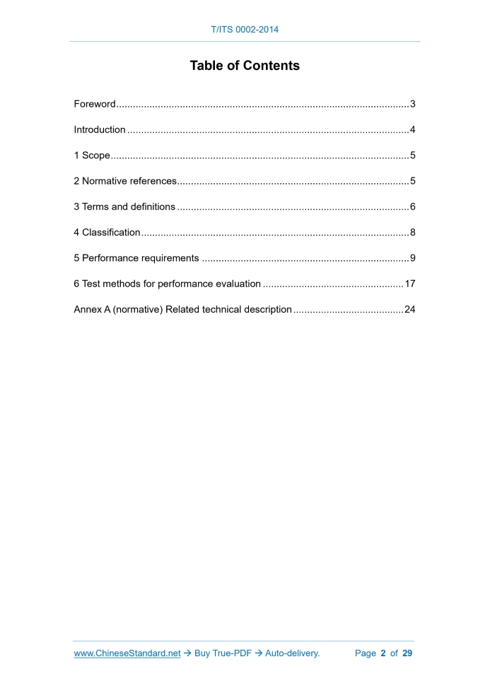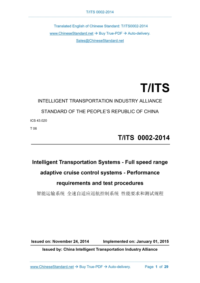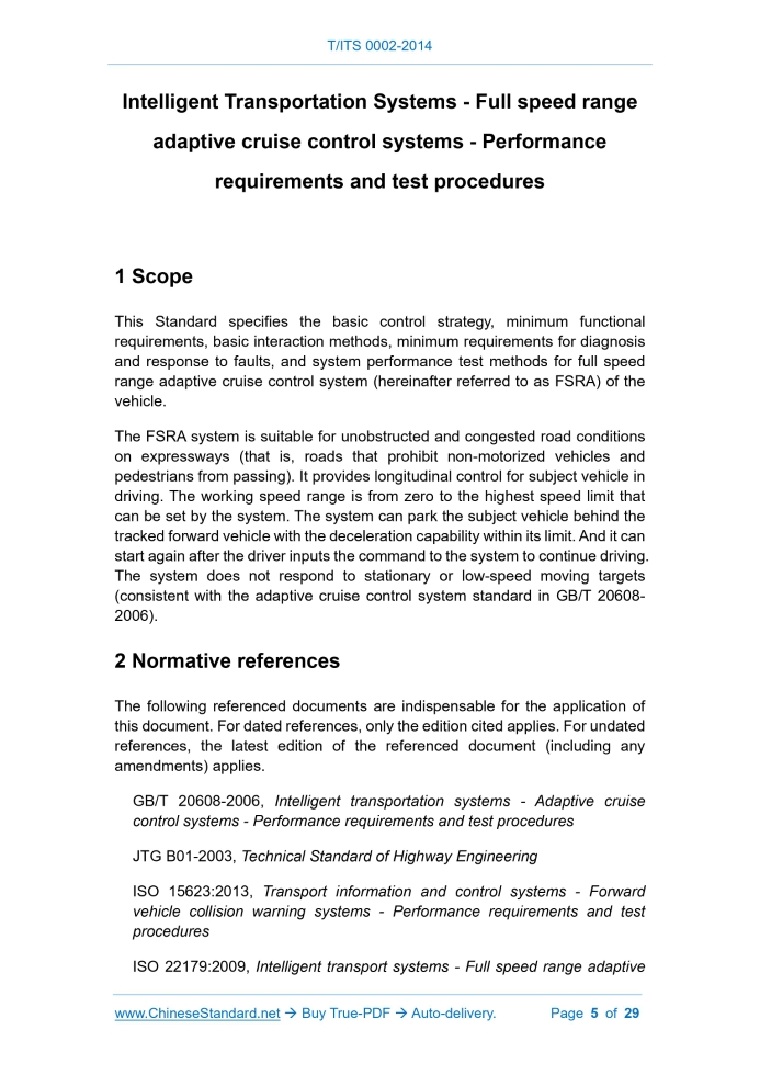 TITS0002-2014: Intelligent Transportation Systems -- Full speed range adaptive-cruise control systems -- Performance requirements and test-procedures---This is an excerpt. Full copy of true-PDF in English version (including equations, symbols, images, flow-chart, tables, and figures etc.), auto-downloaded/delivered in 9 seconds, can be purchased online: https://www.ChineseStandard.net/PDF.aspx/TITS0002-2014 T/ITS INTELLIGENT TRANSPORTATION INDUSTRY ALLIANCE ICS 43.020 T 06 Intelligent Transportation Systems - Full speed range adaptive cruise control systems - Performance requirements and test procedures Issued on. NOVEMBER 24, 2014 Implemented on. JANUARY 01, 2015 Issued by. China Intelligent Transportation Industry Alliance Table of ContentsForeword... 3 Introduction... 4 1 Scope... 5 2 Normative references... 5 3 Terms and definitions... 6 4 Classification... 8 5 Performance requirements... 9 6 Test methods for performance evaluation... 17 Annex A (normative) Related technical description... 24ForewordThis Standard was drafted in accordance with the rules given in GB/T 1.1-2009. The degree of consistency with ISO 22179.2009 (E) "Intelligent transport systems - Full speed rang adaptive cruise control (FSRA) systems - Performance requirements and test procedures" is non-equivalent. This Standard was proposed by and shall be under the jurisdiction of China Intelligent Transportation Industry Alliance. The drafting organizations of this Standard. Tsinghua University, Research Institute of Highway Science, Ministry of Transport, Chongqing Changan Automobile Co., Ltd., Xiamen Jinlong United Automobile Industry Co., Ltd., Beijing Zhihua Yuxin Automotive Electronic Technology Development Co., Ltd., Zhengzhou Yutong Bus Co., Ltd. Main drafters of this Standard. Wang Jianqiang, Li Keqiang, Li Bin, Du Lei, Zhang Qiang, Chen Xiaobing, Zhang Dezhao, Liu Wei, Zhao Qing. This Standard was issued in November 2014 for the first time. This is the first release.1 ScopeThis Standard specifies the basic control strategy, minimum functional requirements, basic interaction methods, minimum requirements for diagnosis and response to faults, and system performance test methods for full speed range adaptive cruise control system (hereinafter referred to as FSRA) of the vehicle. The FSRA system is suitable for unobstructed and congested road conditions on expressways (that is, roads that prohibit non-motorized vehicles and pedestrians from passing). It provides longitudinal control for subject vehicle in driving. The working speed range is from zero to the highest speed limit that can be set by the system. The system can park the subject vehicle behind the tracked forward vehicle with the deceleration capability within its limit. And it can start again after the driver inputs the command to the system to continue driving. The system does not respond to stationary or low-speed moving targets (consistent with the adaptive cruise control system standard in GB/T 20608- 2006).2 Normative referencesThe following referenced documents are indispensable for the application of this document. For dated references, only the edition cited applies. For undated references, the latest edition of the referenced document (including any amendments) applies. GB/T 20608-2006, Intelligent transportation systems - Adaptive cruise control systems - Performance requirements and test procedures JTG B01-2003, Technical Standard of Highway Engineering ISO 15623.2013, Transport information and control systems - Forward vehicle collision warning systems - Performance requirements and test procedures3 Terms and definitionsFor the purposes of this document, the following terms and definitions apply. 3.1 active brake control a brake that is controlled by the FSRA system, not by the driver 3.3 brake the process of generating forces that hinder the movement (or movement trend) of a vehicle Friction brake - The friction generated by the two moving parts of the vehicle; Electromagnetic brake - The electromagnetic force generated by the two parts of the vehicle that are relatively moving but not in contact based on electromagnetic action; 3.4 clearance the distance from the rear of the forward vehicle to the front of the subject vehicle 3.6 forward vehicle the vehicle that is located in front of the road where the subject vehicle is traveling and is traveling in the same direction 3.7 free-flowing traffic including start-stop and emergency braking conditions, smooth flow and heavy traffic4 ClassificationThe FSRA system is classified into 4 types according to its adaptability to curve driving, as shown in Table 1.5 Performance requirements5.1 Basic control strategy Figure 1 shows the system states and transitions. 5.2 Functions 5.2.1 Control mode The switching between the distance control state and the speed control state shall be automatically completed by the system. 5.2.3.1 Overview The following separately introduces the detection range, target recognition function and curve driving capability of the FSRA system. 5.2.3.3 Target recognition If there are multiple vehicles ahead on a straight road, or on a curve (the FSRA system of the vehicle is of type II, III or IV), then the forward vehicle in the same lane as the subject vehicle will be selected as the target vehicle controlled by FSRA, see Figure 3. 5.2.3.4 Curve driving (Type II, III, IV) The FSRA system enables the vehicle to follow the forward vehicle stably with the time headway τmax (vcircle) on straight roads and curves. Different types of FRSA systems have different adaptability to curve radius. 5.2.4 State transition Without the driver's instruction, the system cannot switch from the hold state to the following control state or the speed control state. 5.3 Basic human-computer interaction function 5.3.1 Operation and system response The FSRA system shall provide the driver with a method to select and set the desired speed.6 Test methods for performance evaluation6.1 Test environment c
