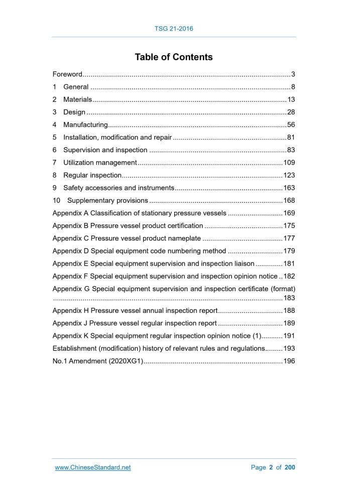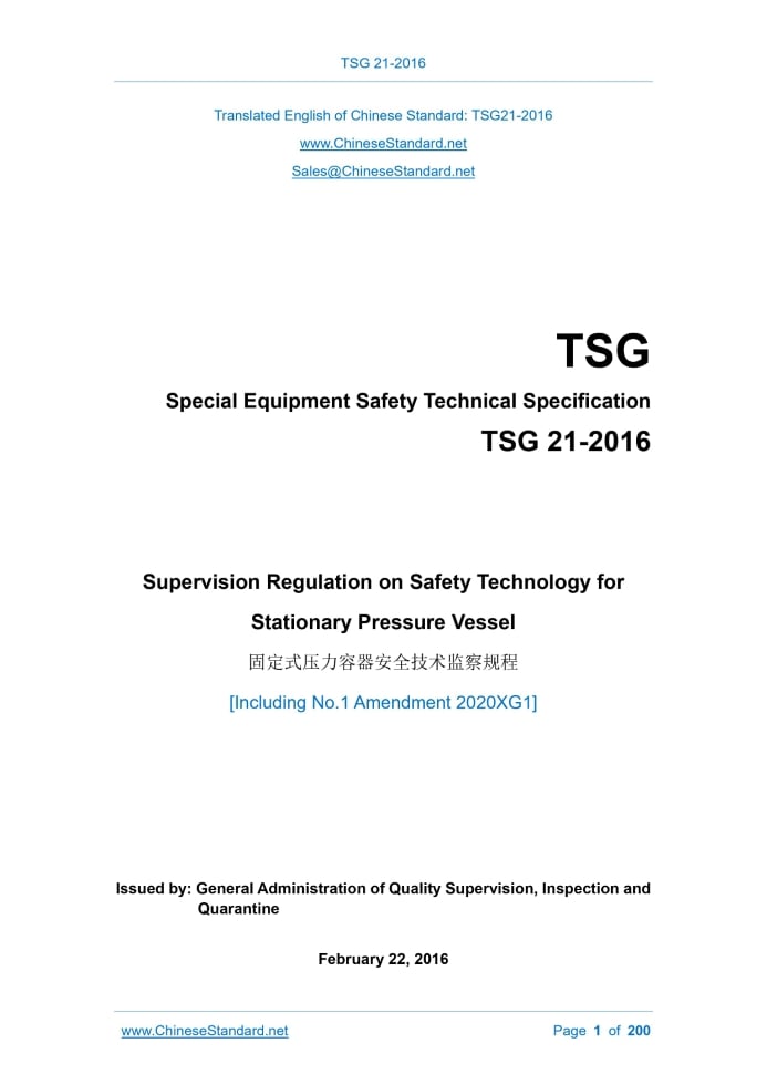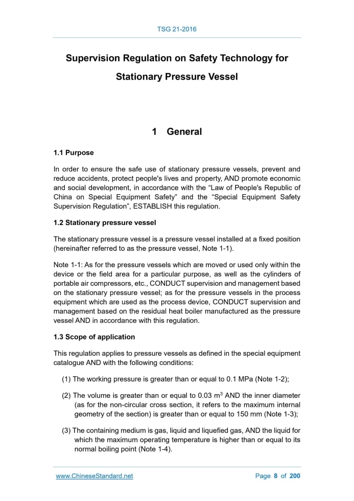 Similar standardsTSG 21-2016: Supervision Regulation on Safety Technology for Stationary Pressure Vessel---This is an excerpt. Full copy of true-PDF in English version (including equations, symbols, images, flow-chart, tables, and figures etc.), auto-downloaded/delivered in 9 seconds, can be purchased online: https://www.ChineseStandard.net/PDF.aspx/TSG21-2016TSG Special Equipment Safety Technical Specification Supervision Regulation on Safety Technology for Stationary Pressure Vessel [Including No.1 Amendment 2020XG1] Issued by. General Administration of Quality Supervision, Inspection and Quarantine February 22, 2016 Table of ContentsForeword... 3 1 General... 8 2 Materials... 13 3 Design... 28 4 Manufacturing... 56 5 Installation, modification and repair... 81 6 Supervision and inspection... 83 7 Utilization management... 109 8 Regular inspection... 123 9 Safety accessories and instruments... 163 10 Supplementary provisions... 1681 General1.1 Purpose In order to ensure the safe use of stationary pressure vessels, prevent and reduce accidents, protect people's lives and property, AND promote economic and social development, in accordance with the “Law of People's Republic of China on Special Equipment Safety” and the “Special Equipment Safety Supervision Regulation”, ESTABLISH this regulation. 1.2 Stationary pressure vessel The stationary pressure vessel is a pressure vessel installed at a fixed position (hereinafter referred to as the pressure vessel, Note 1-1). Note 1-1.As for the pressure vessels which are moved or used only within the device or the field area for a particular purpose, as well as the cylinders of portable air compressors, etc., CONDUCT supervision and management based on the stationary pressure vessel; as for the pressure vessels in the process equipment which are used as the process device, CONDUCT supervision and management based on the residual heat boiler manufactured as the pressure vessel AND in accordance with this regulation. 1.3 Scope of application This regulation applies to pressure vessels as defined in the special equipment catalogue AND with the following conditions. (1) The working pressure is greater than or equal to 0.1 MPa (Note 1-2); (2) The volume is greater than or equal to 0.03 m3 AND the inner diameter (as for the non-circular cross section, it refers to the maximum internal geometry of the section) is greater than or equal to 150 mm (Note 1-3); (3) The containing medium is gas, liquid and liquefied gas, AND the liquid for which the maximum operating temperature is higher than or equal to its normal boiling point (Note 1-4). Note 1-2.The working pressure is, at the normal operating conditions, the maximum pressure that may be reached at the top of the pressure vessel (gauge pressure). Note 1-3.Volume refers to the geometric volume of the pressure vessel, that is, the volume as calculated based on the dimensions indicated in the design drawings (regardless of manufacturing tolerances) AND rounded off. It is generally necessary to deduct the volume of the internals permanently attached to the interior of the pressure vessel. Note 1-4.When the medium in the vessel is liquid the maximum operating temperature of which is lower than its standard boiling point, if the volume of the vapor phase space is greater than or equal to 0.03 m3, this regulation is also applicable. 1.4 Special provisions of the scope of application The pressure vessel utilization unit shall, with reference to the relevant provisions of Chapter 7 “Use management” of this regulation, be responsible for the safety management of the pressure vessels within the scope of this clause. 1.4.1 Pressure vessels only needed to comply with the general rules, materials, design, and manufacturing requirements of this regulation The following pressure vessels within the scope of application of this regulation only need to comply with the provisions of Chapter 1 to Chapter 4 of this regulation. (1) The non-independent pressure vessels in cryogenic units, pressure vessels in direct-fired absorption refrigeration units, aluminum plate-fin heat exchangers, AND pressure vessels in cold boxes in process units; (2) The shell-less heat exchanger containing the second group of media (Note 1-5); (3) Ultra-high pressure tube reactor. Note 1-5.As for the pressure vessel medium grouping, SEE the Appendix A of this regulation. 1.4.2 Pressure vessels only needed to comply with the general rules, design, and manufacturing requirements of this regulation The following pressure vessels within the scope of application of this regulation only need to comply with the provisions of Chapter 1, Chapter 3, and Chapter 4 of this regulation.2 Materials2.1 General requirements for materials 2.1.1 Basic requirements (1) The selection of pressure vessel material shall take into account of the material’s mechanical properties, physical properties, process performance and compatibility with the media; (2) The performance, quality, specifications and signs of the pressure vessel materials shall comply with the national standards or the industry standards of the corresponding materials; (3) The pressure vessel material manufacturing unit shall, at the prominent locations on the material, make clear and solid exit-factory steel seal sign OR other traceable signs; (4) The manufacturer of pressure vessel material shall provide the quality certificate to the material utilization unit, AND the content of the material quality certificate shall be complete, clear and printed with traceable information mark, and stamped with the quality inspection seal of the material manufacturing unit; (5) When the pressure vessel manufacturer, modification and repair unit obtains the pressure vessel materials from other units than the material manufacturer, it shall obtain the original quality certificate as provided by the material manufacturer OR the duplicated copy which is stamped with the official seal of the material operating u