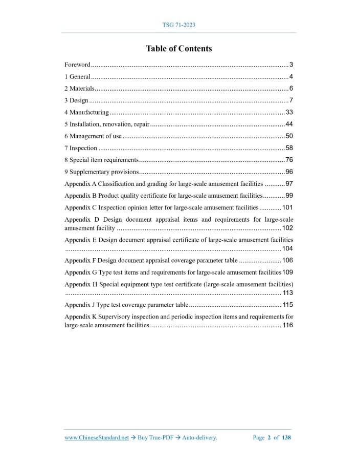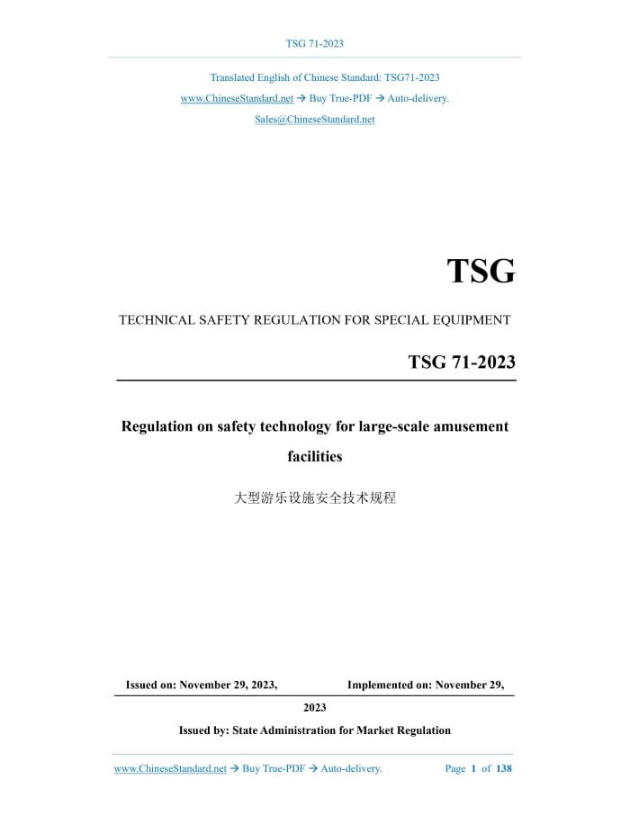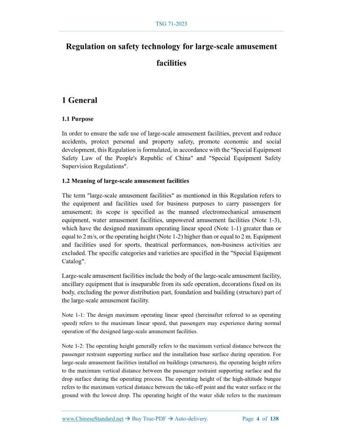 Similar standardsTSG 71-2023: Regulation on Safety Technology for Large-scale Amusement Facilities---This is an excerpt. Full copy of true-PDF in English version (including equations, symbols, images, flow-chart, tables, and figures etc.), auto-downloaded/delivered in 9 seconds, can be purchased online: https://www.ChineseStandard.net/PDF.aspx/TSG71-2023TSG TECHNICAL SAFETY REGULATION FOR SPECIAL EQUIPMENT Regulation on safety technology for large-scale amusement facilities Issued on. NOVEMBER 29, 2023, Implemented on. NOVEMBER 29, Issued by. State Administration for Market Regulation Table of ContentsForeword... 3 1 General... 4 2 Materials... 6 3 Design... 7 4 Manufacturing... 33 5 Installation, renovation, repair... 44 6 Management of use... 50 7 Inspection... 58 8 Special item requirements... 76 9 Supplementary provisions... 96 Appendix A Classification and grading for large-scale amusement facilities... 97 Appendix B Product quality certificate for large-scale amusement facilities... 99 Appendix C Inspection opinion letter for large-scale amusement facilities... 101 Appendix D Design document appraisal items and requirements for large-scale amusement facility... 102 Appendix E Design document appraisal certificate of large-scale amusement facilities... 104 Appendix F Design document appraisal coverage parameter table... 106 Appendix G Type test items and requirements for large-scale amusement facilities... 109 Appendix H Special equipment type test certificate (large-scale amusement facilities)... 113 Appendix J Type test coverage parameter table... 115 Appendix K Supervisory inspection and periodic inspection items and requirements for large-scale amusement facilities... 1161 General1.1 Purpose In order to ensure the safe use of large-scale amusement facilities, prevent and reduce accidents, protect personal and property safety, promote economic and social development, this Regulation is formulated, in accordance with the "Special Equipment Safety Law of the People's Republic of China" and "Special Equipment Safety Supervision Regulations". 1.2 Meaning of large-scale amusement facilities The term "large-scale amusement facilities" as mentioned in this Regulation refers to the equipment and facilities used for business purposes to carry passengers for amusement; its scope is specified as the manned electromechanical amusement equipment, water amusement facilities, unpowered amusement facilities (Note 1-3), which have the designed maximum operating linear speed (Note 1-1) greater than or equal to 2 m/s, or the operating height (Note 1-2) higher than or equal to 2 m. Equipment and facilities used for sports, theatrical performances, non-business activities are excluded. The specific categories and varieties are specified in the "Special Equipment Catalog". Large-scale amusement facilities include the body of the large-scale amusement facility, ancillary equipment that is inseparable from its safe operation, decorations fixed on its body, excluding the power distribution part, foundation and building (structure) part of the large-scale amusement facility. Note 1-1.The design maximum operating linear speed (hereinafter referred to as operating speed) refers to the maximum linear speed, that passengers may experience during normal operation of the designed large-scale amusement facilities. Note 1-2.The operating height generally refers to the maximum vertical distance between the passenger restraint supporting surface and the installation base surface during operation. For large-scale amusement facilities installed on buildings (structures), the operating height refersto the maximum vertical distance between the passenger restraint supporting surface and thedrop surface during the operating process. The operating height of the high-altitude bungeerefers to the maximum vertical distance between the take-off point and the water surface or theground with the lowest drop. The operating height of the water slide refers to the maximum vertical distance between the take-off point and the water surface or the ground with the lowest drop. Note 1-3.The operating speed and operating height are generally judged, based on the product design data of the manufacturer. The manufacturer shall ensure that the actual operating parameters are consistent with the design data and parameters in the product quality certification document.2 Materials2.1 General requirements The selection of materials for large-scale amusement facilities shall be comprehensively considered based on factors such as their load characteristics, structural type, stress state, manufacturing process, working environment. 2.2 Metal materials 2.3 Non-metallic materials 2.3.3 Rubber Rubber shall meet the requirements of relevant national or industry standards. Its mechanical properties, aging resistance, corrosion resistance, etc. shall meet the requirements of actual working conditions. 2.3.4 Glass The glass shall be made of plexiglass or safety glass that is not easily broken. The plexiglass sheets shall comply with the requirements of GB/T 7134 "Poly (methyl methacrylate) cast sheets". The safety glass shall comply with the requirements of GB 15763 "Safety glazing materials in building". 2.3.5 FRP FRP materials and FRP parts shall meet the following requirements.3 Design3.1 General requirements 3.2 Risk assessment During the design stage, large-scale amusement facilities shall carry out risk assessment in accordance with GB/T 34371 "Risk assessment for amusement ride - General principles" and GB/T 39043 "Risk assessment for amusement ride - Hazard". A risk assessment report shall be issued. 3.3 Design calculation 3.4 Speed and acceleration 3.5 Welding design 3.6 Structural design 3.7 Transmission system 3.8 Electrical and control systems 3.9 Ride system 3.10 Safety protection devices and protective measures 3.11 Design documents 3.12 Design changes The manufacturer shall carry out design change work, through the scope, process, respons